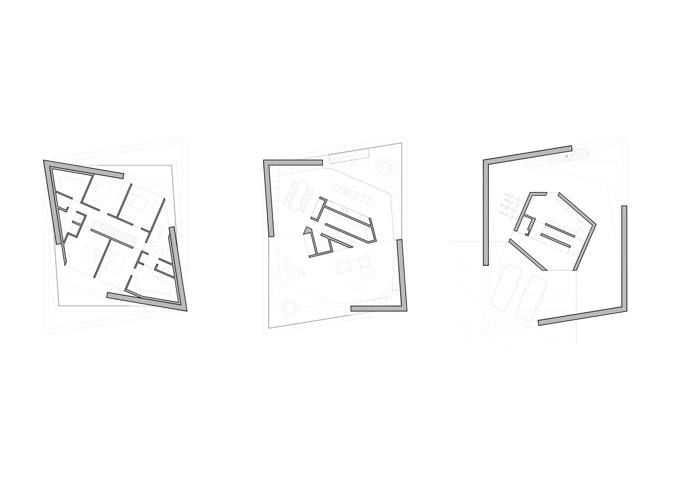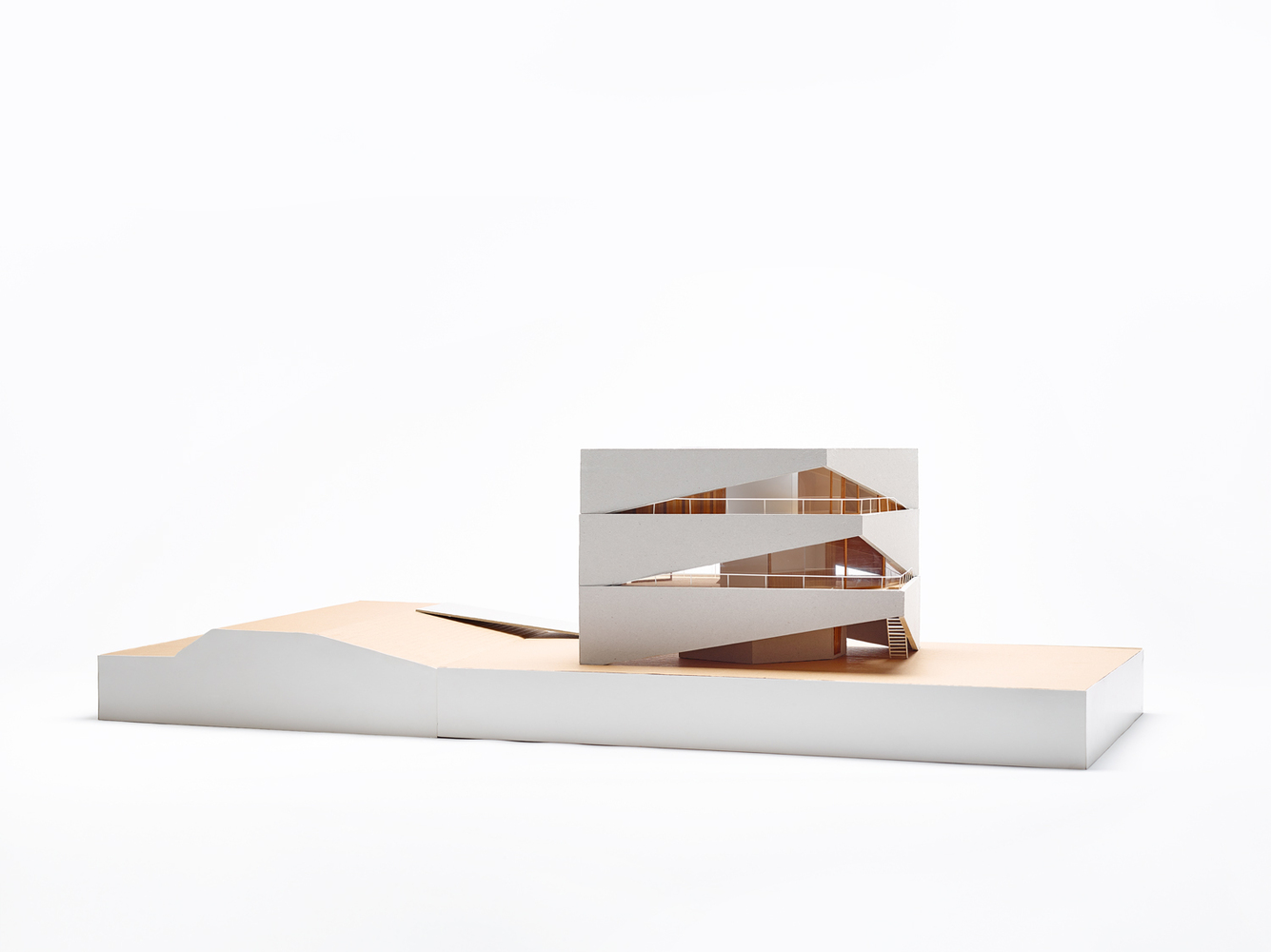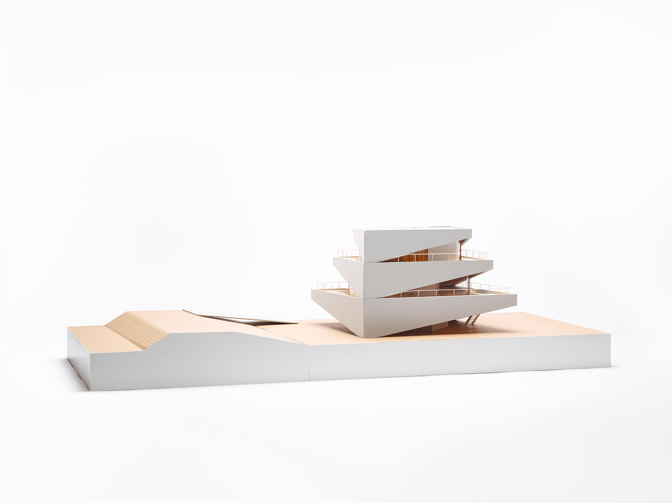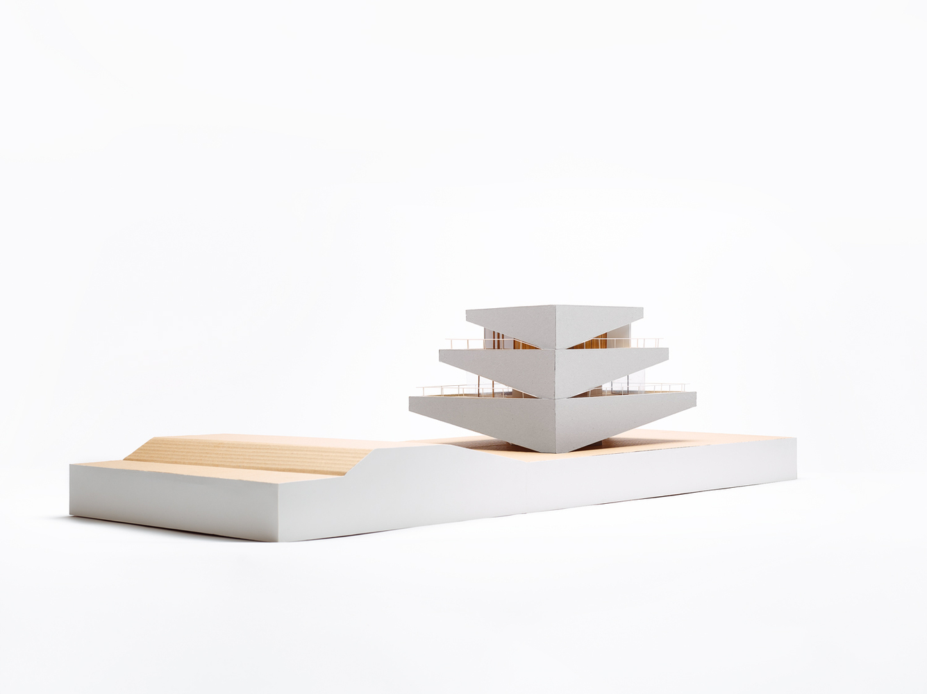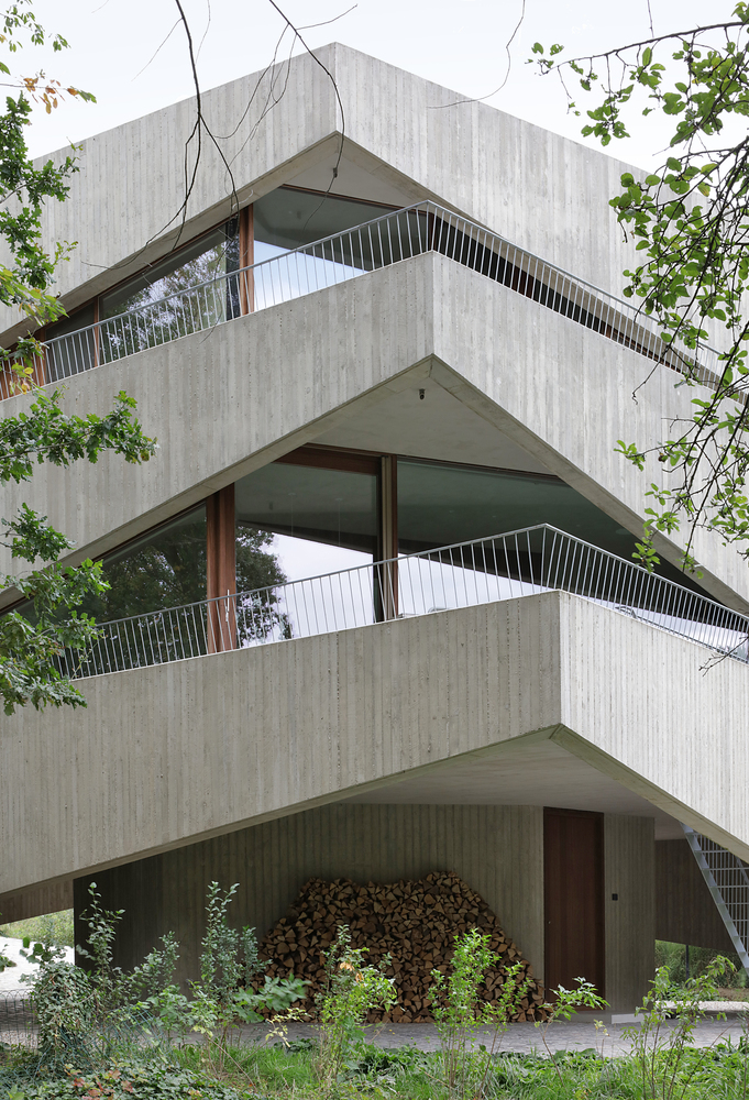 Each storey is set back in relation to the previous one and has been superimposed at a slightly shifted angle, with the intention of creating privacy and a sense of security for the residents. This fan-like movement inward also creates a playful effect that counters the monolithic appearance of the nine-metre-high building. At the same time, the fan shape is intended to cast an as little shadow as possible on the neighbours. The breaches in the concrete walls in turn create exciting openings to the garden and the water. While the concrete construction is no less imposing than the ships that slowly pass by on the canal, the openings give the whole a human scale.