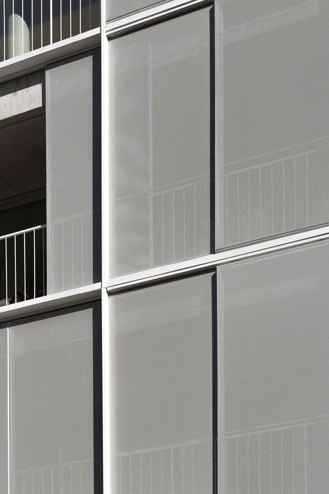 The building’s facade accompanies this transitional process: the sliding panels, made of stretched fabric, while collaborating with thermic control, lightning, acoustic absorption, and energy savings, generate throughout the day, different dialogues between those inhabiting the building and the environment that contains it.