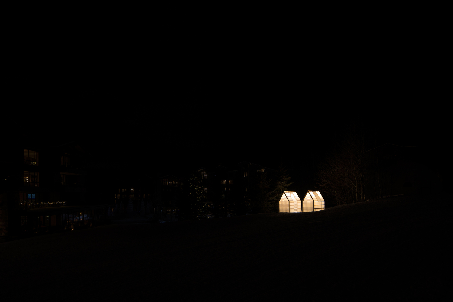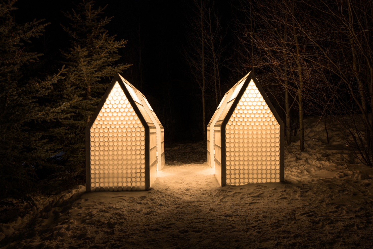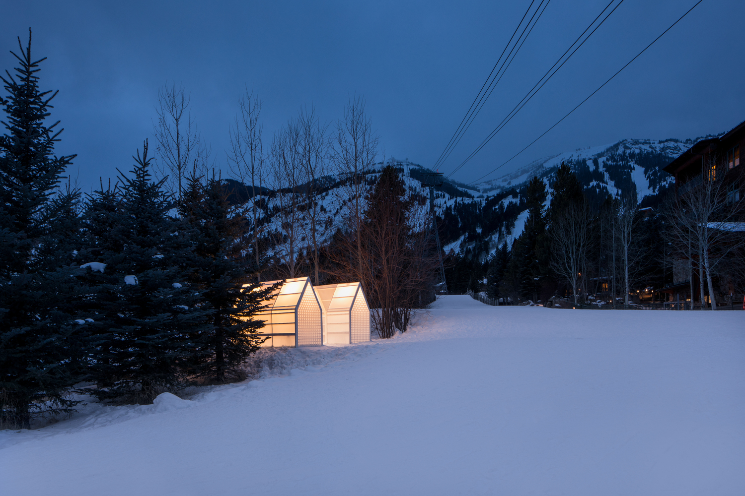 The conversation huts were again installed in Teton Village during the annual GLOW Nights Festival, an event that employs light as a medium to attract people out into public spaces at night. The structures were re-clad with recycled HDPE panels to withstand the winter conditions and simple pendant lights were added to illuminate the spaces at night.