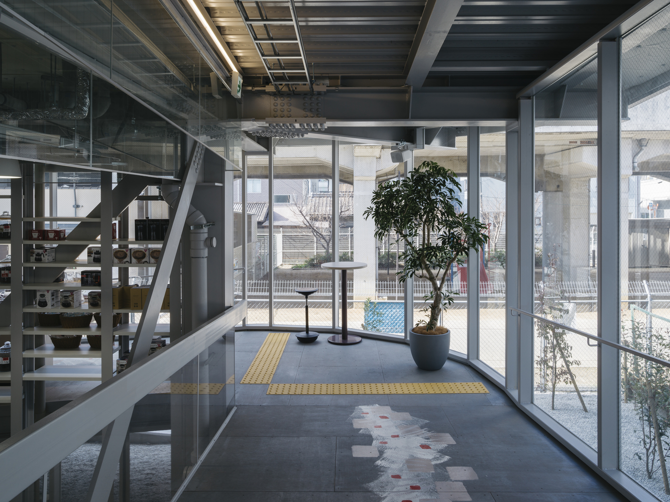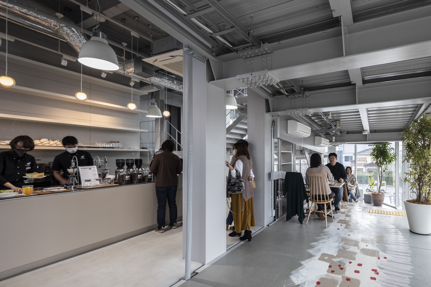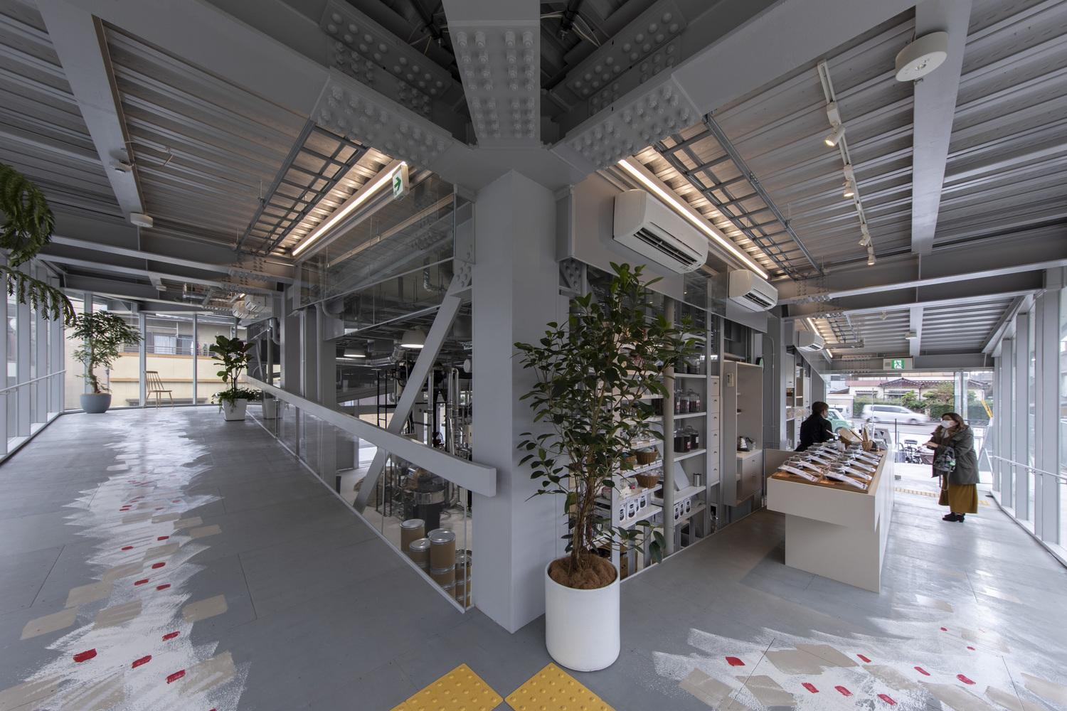 A bakery workshop and a cafe counter are also settled on the square core in the center of the building, which serves as a production site. Customers and employees, or those who live and work in the surrounding area, gather to the core and rise around it. The building is transparent, the swirling slopes and the core are visualized, and the functions and the flow of people make sense in the surrounding area. Once you see this spiral, you will be attracted to the inside of the building.