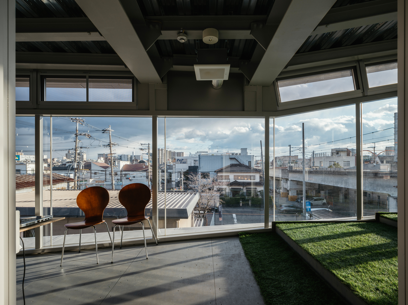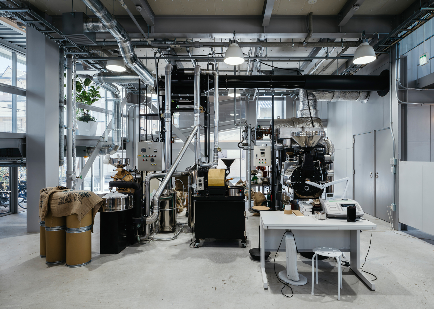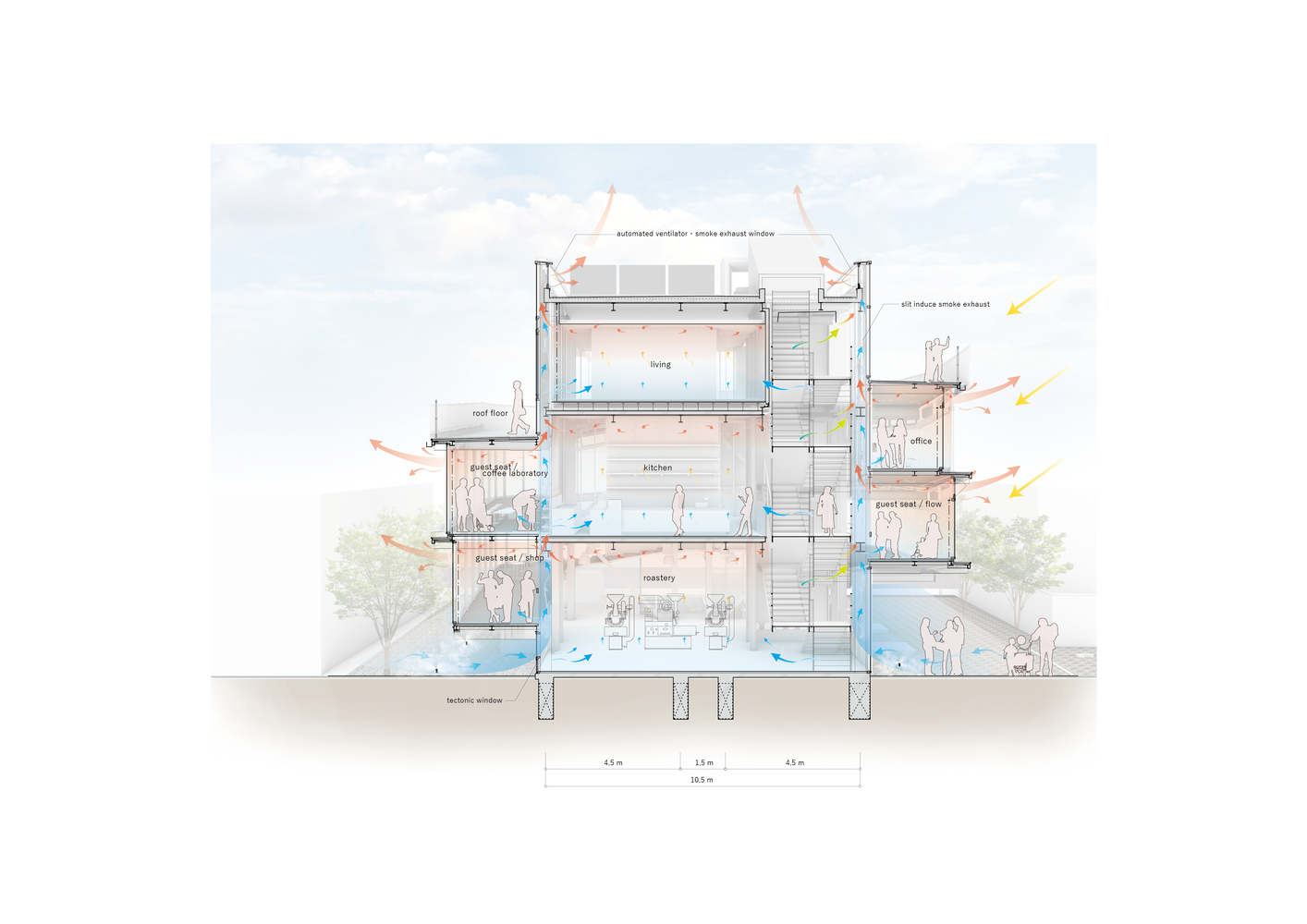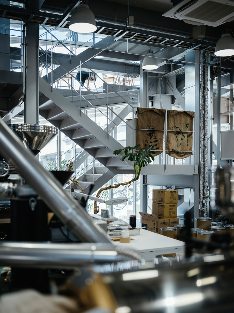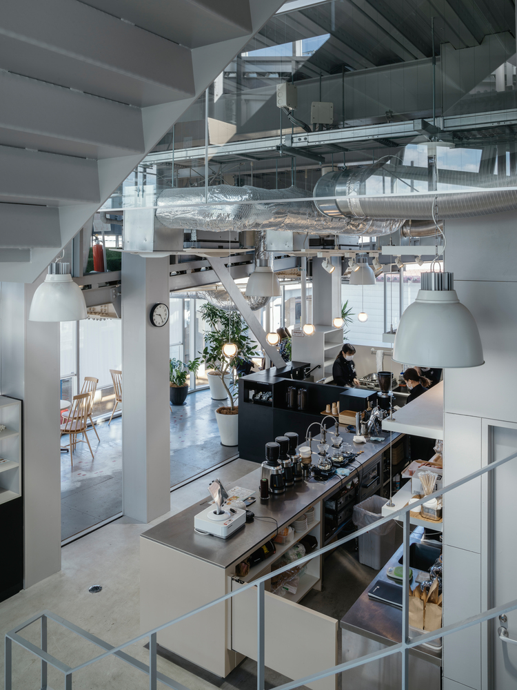 We aimed for such an architecture that pulls people and involves them into a spiral and sublimates them. It is located in Higashiosaka City, Japan, where the structure of Lowertown is concentrated, along the elevated railroad track that was once a freight line. We have created a plan centered around a coffee roasting machine in such a glamorous city where people's activities and lives intersect with chaos, and the flow of people rolls up around it.