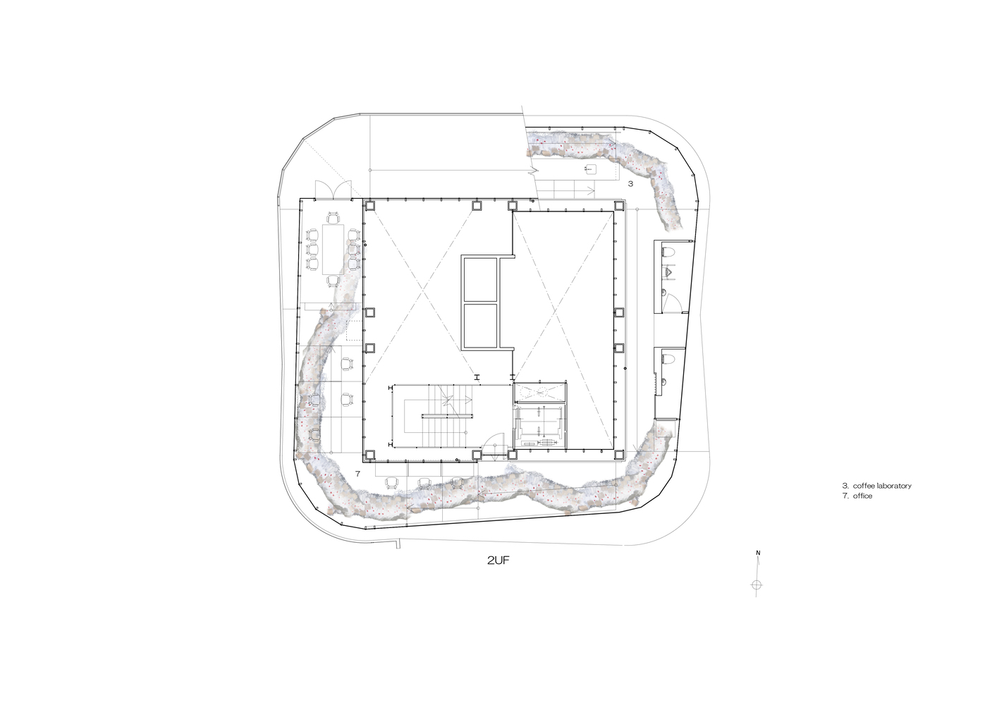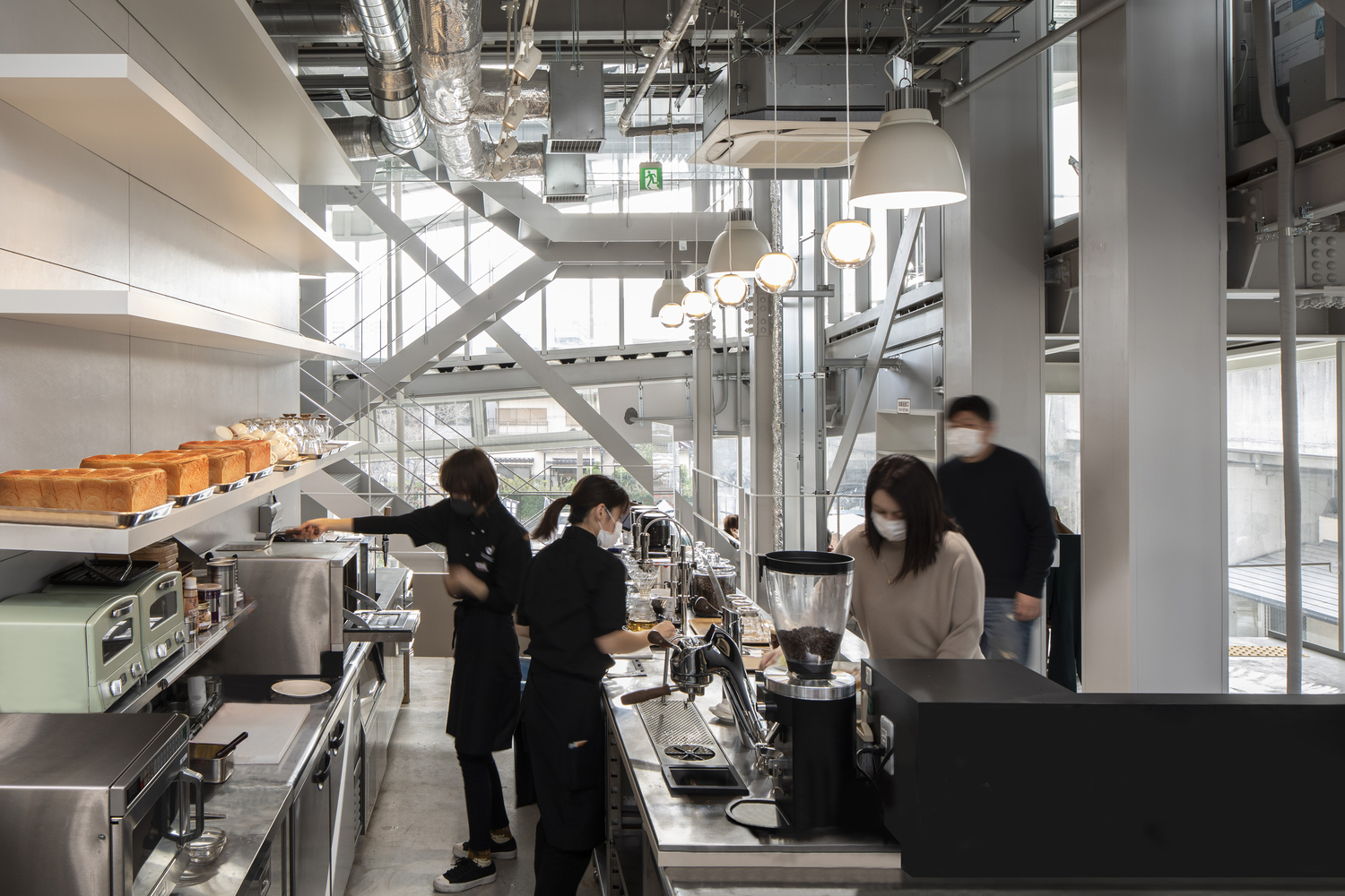 From the beginning, the founder intended to set up a cafe and high-class bread workshop as a new business and inhabit at the top of them in secret. He required a view like scenery in a person’s mind’s eyes composed of the vortex of human behavior rising. It will encourage the human mind and suit Instagram’s topic. The idea of how to create the architecture is just putting the cubic core as a production area, surrounding it with the human flow and sublimating them. That’s all. Instead of creating a shape, I have been conscious of the events that appear around there.