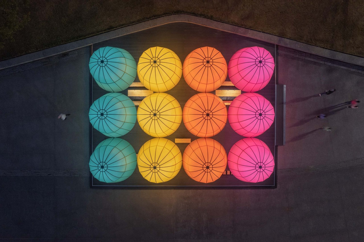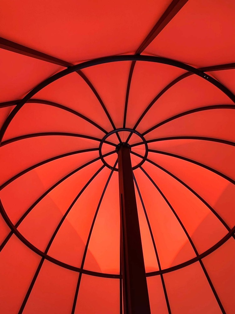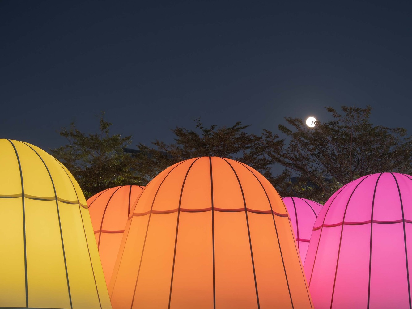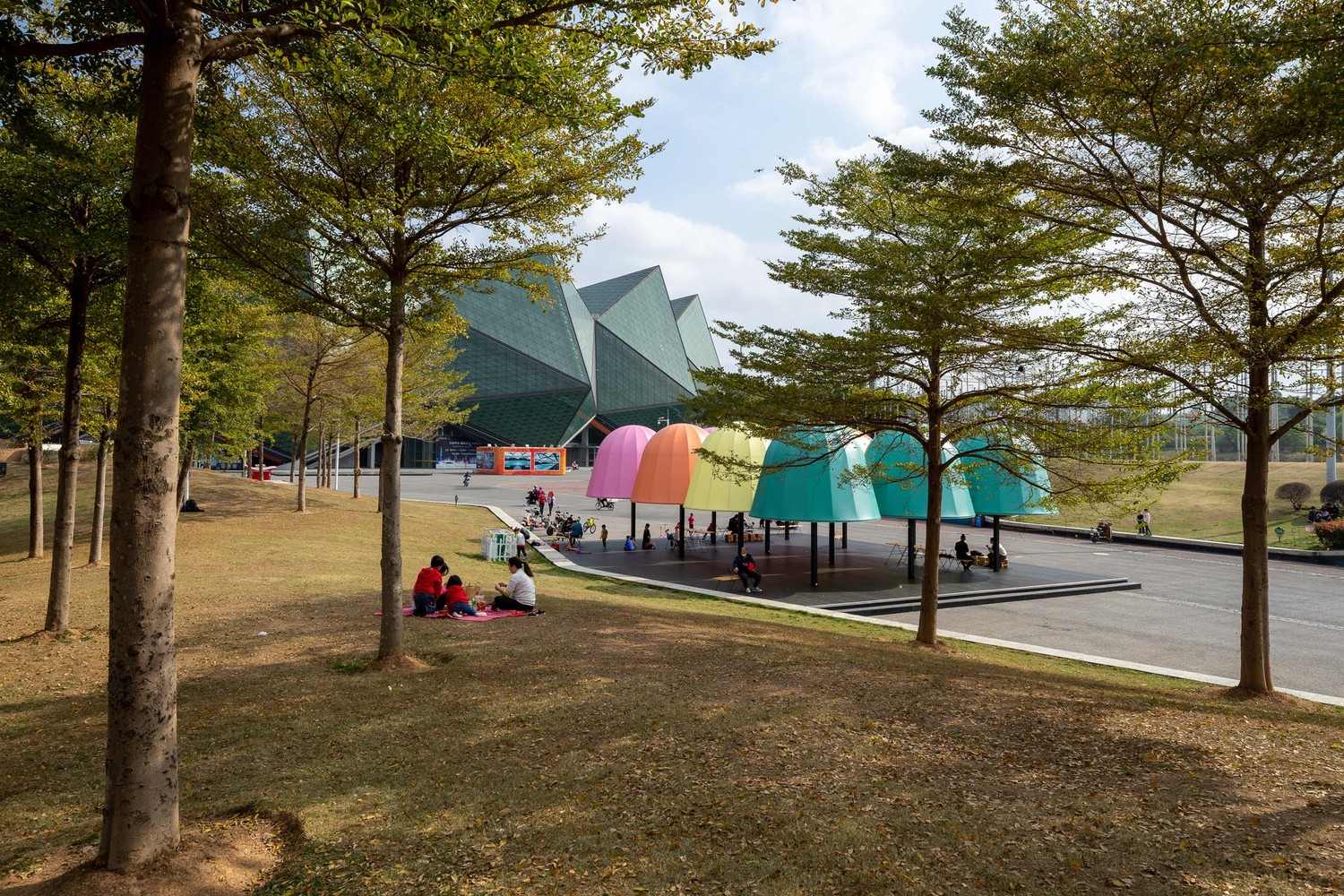 Mushrooms & Chinese Lanterns. We drew inspiration from the structure of traditional Chinese lanterns for the shape of the pavilions. After a thorough study, we borrowed the frame of traditional bamboo lanterns and applied the five traditional Chinese colors of turquoise, soft yellow, violet red, mandarin red, and jet black in the design. The designers intended the nice-round pavilions to evoke our beloved traditional Chinese lanterns and to possess the wonderful appeal of lovely creatures in nature by resembling wild mushrooms at a certain angle. The pavilion domes are wrapped in colored, translucent, and matte soft films. The designers wanted the material to have a paper-like texture and to allow light to penetrate; its waterproof nature also makes the pavilions a temporary shelter for rainy days. During the daytime, the light-transmitting material shades part of the sunlight, ensuring the comfort of the space underneath the pavilions; After the sunset, the lighted pavilions emit mellow and colorful light, making it a prominent public space at night. The pavilions provide a place for citizens to interact with light and nature, a hangout space for rest and meditative relaxation, as well as a natural venue for small events. On winter days with warm sunshine, people come to the beautiful pavilions to spend a peaceful and pleasant time.