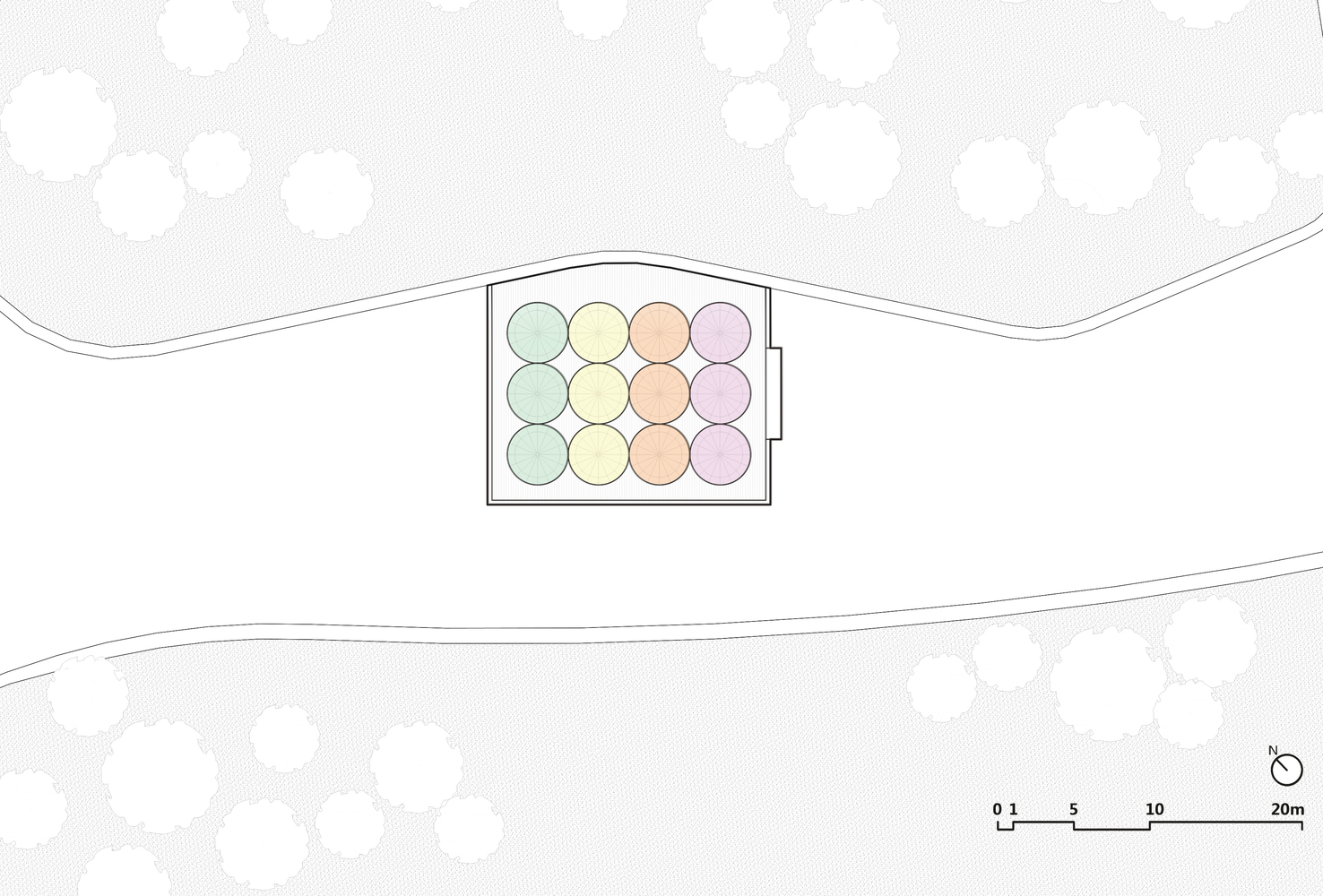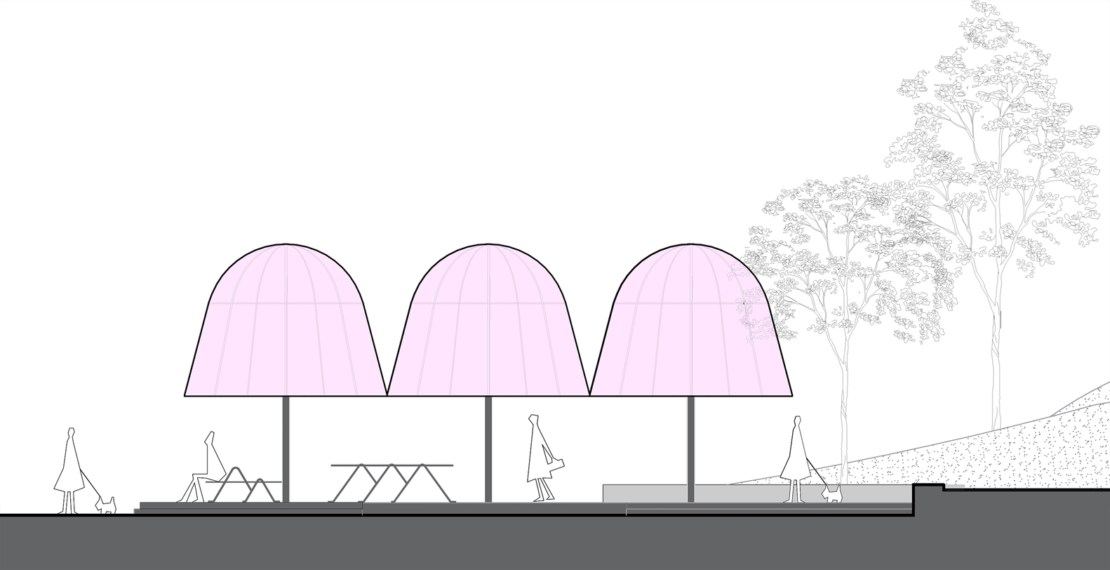 Space for In-person Social Contact. As social media encroaches on our urban lives, virtual spaces and fragmented information are keeping us enclosed in our rooms, while the things that connect us and bring us together are gradually fading into insignificance. Through the work, we hope to present a multifaceted understanding of how we perceive reality and nature and encourage people to experience real life not just with their eyes, but with their bodies and minds. We hope that people would briefly take their attention off digital devices and come to the pavilions to enjoy the subtle changes of light and shadow created by the pavilions and the surrounding trees, as well as to observe the lovely ambient environment and the children at play. Taking the relationship between humans and nature as an entry point, the installation provides a space for in-person social contact that seeks to examine, explore and empower our shared future.
