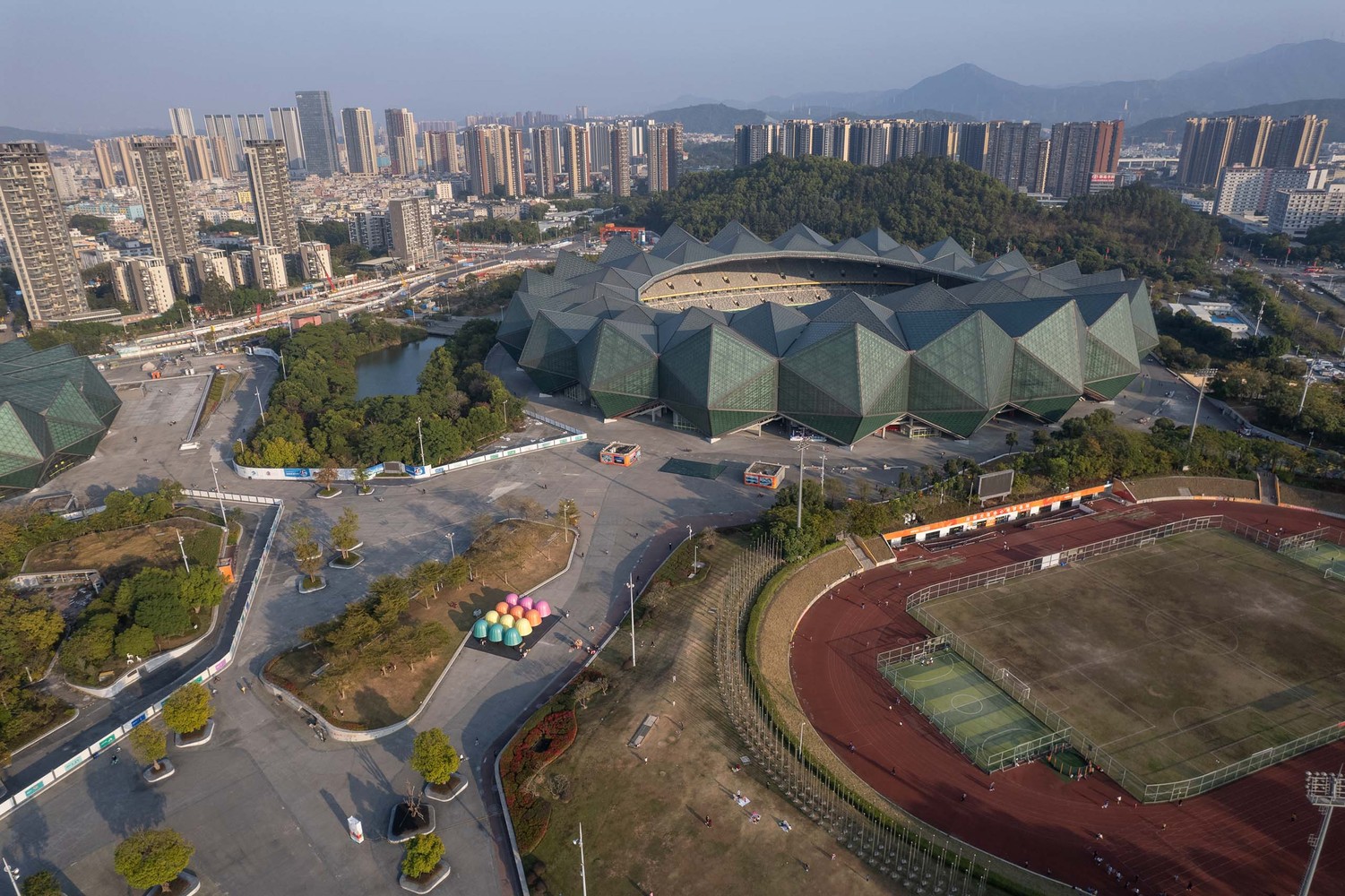 With the curatorial theme of “Searching the Glow of Future”, Glow Shenzhen 2021 seeks to integrate light art into urban life and release the vitality of urban public space. Daxing Jizi is invited to exhibit their architectural installation, “Dream Glow Pavilion”, at the Shenzhen Universiade Center, Glow Shenzhen’s Longgang section. The Universiade Center is about 990 meters wide from east to west and 1050 meters long from north to south, covering an area of 520,000 sqm, serving as a major place for fitness and leisure for the surrounding residents. During our research, we found that there are few small-scale structures for the public to relax, so how incorporating a small enjoyable space into the massive center became our initial intention of the design.