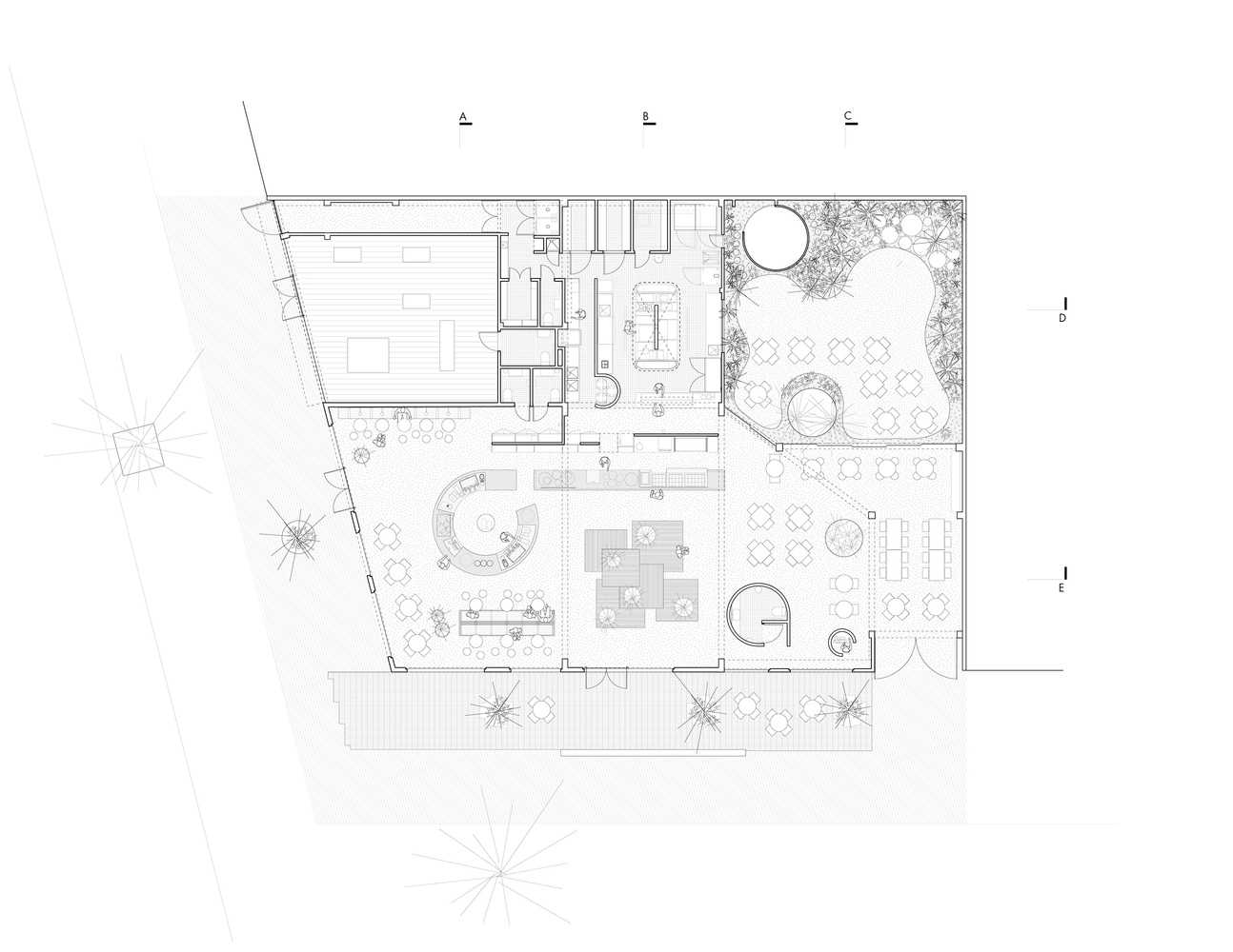 An outdoor patio space provides garden seating and connects the public spaces to the kitchen in the rear. Elements such as a long concrete bar, cylindrical wood-clad service station, and a multi-tiered seating platform at the entrance serve to modulate the space. Says Studio Cadena founder and principal Benjamin Cadena about his design, “The idea is that everything is connected, but the spaces remain fragmented for intimacy. In any space in the restaurant you might hear or smell things that give a sense of the adjacent spaces, but it isn’t completely open. The design defines distinct spatial volumes yet allows you to move through them with the freedom of an open plan.”