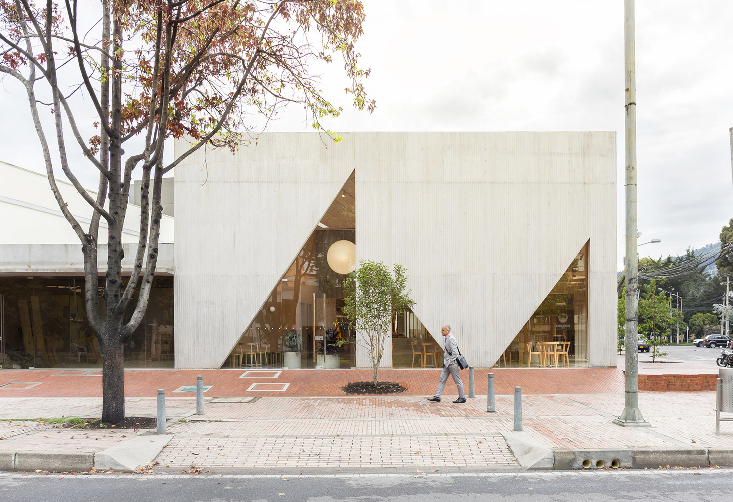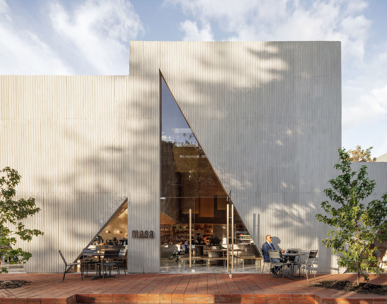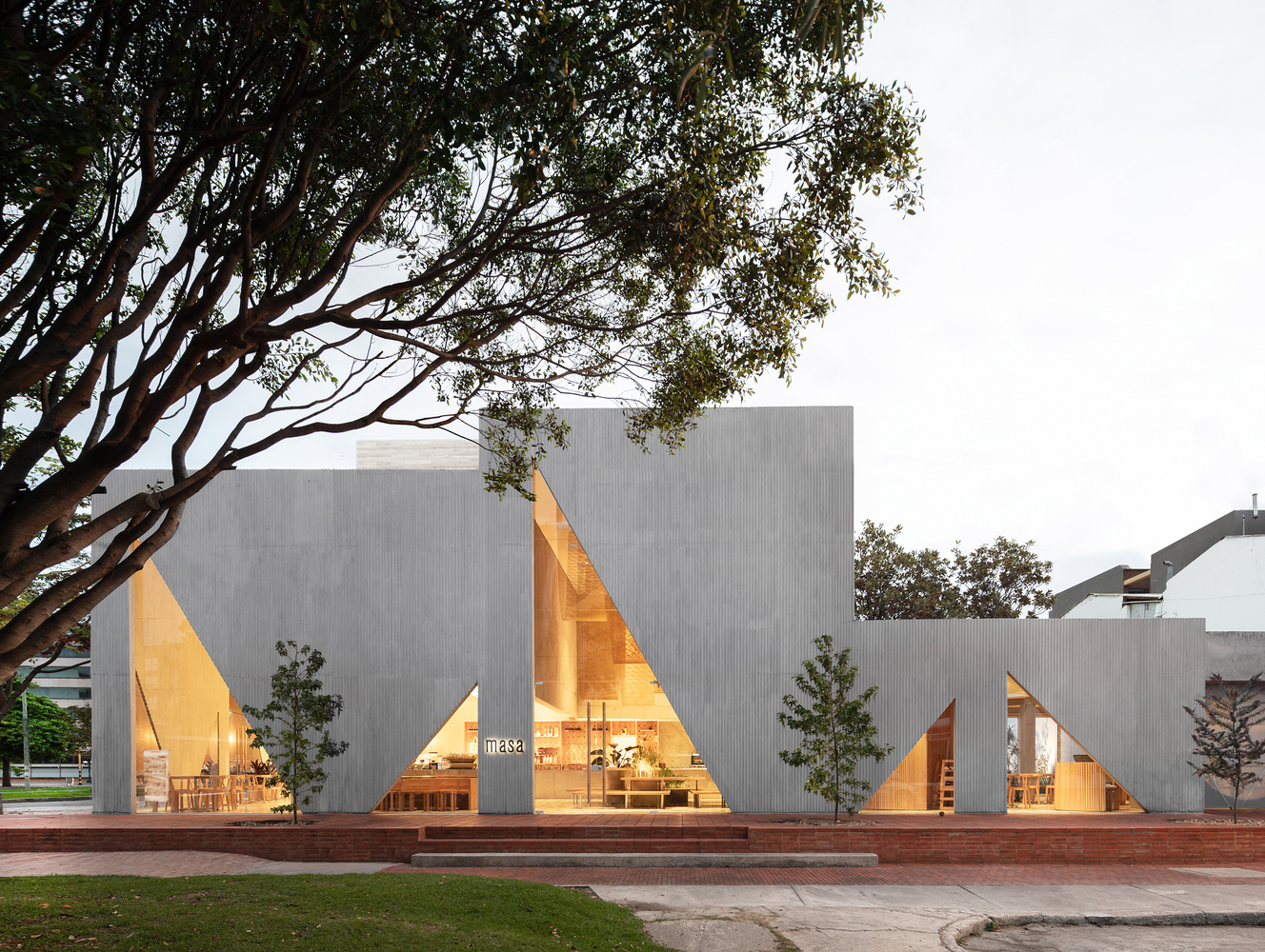 New York City-based Studio Cadena has designed Masa, a new restaurant in a northern residential neighborhood of Bogotá, Colombia. The restaurant is built on a residential scale, on the site of a former house. This is the second and largest space that Studio Cadena has designed for Masa, the first, also in Bogotá, is a smaller cafe that opened in 2014. The 7,500-square-foot building is organized as a grouping of distinct but interconnected volumes, each with a particular function. At one corner sits a cafe and bakery, which flows into the central entrance area that is adjacent to a dining volume and separate retail space.