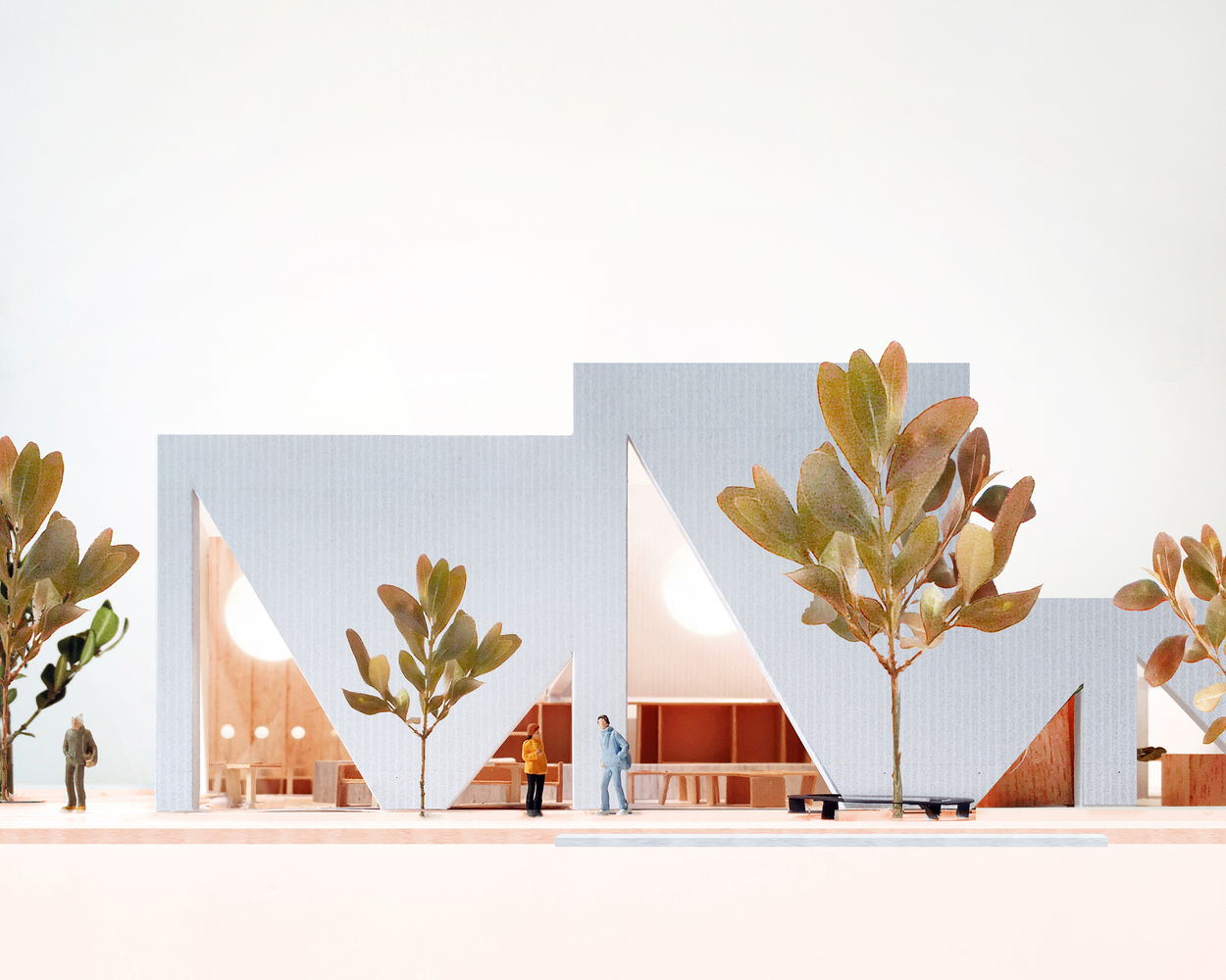 A playfulness continues in the surfaces, fixtures, and furniture, all designed by Studio Cadena. Distinct sculptural lighting designs serve to distinguish the different volumes – large paper globes light the corner café, while hand-painted metal mesh hung from the ceiling catches the natural light in the middle volume. A unique floor made from large, hand-cast terrazzo tiles embedded within traditional terrazzo covers the interior public spaces. The walls are made of textured, cast-in-place concrete.