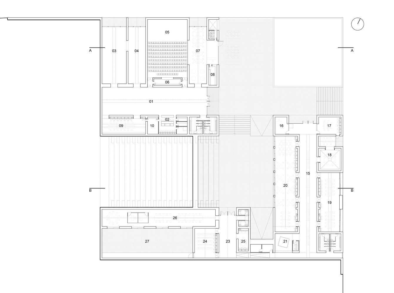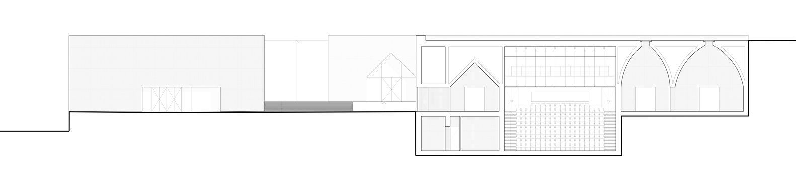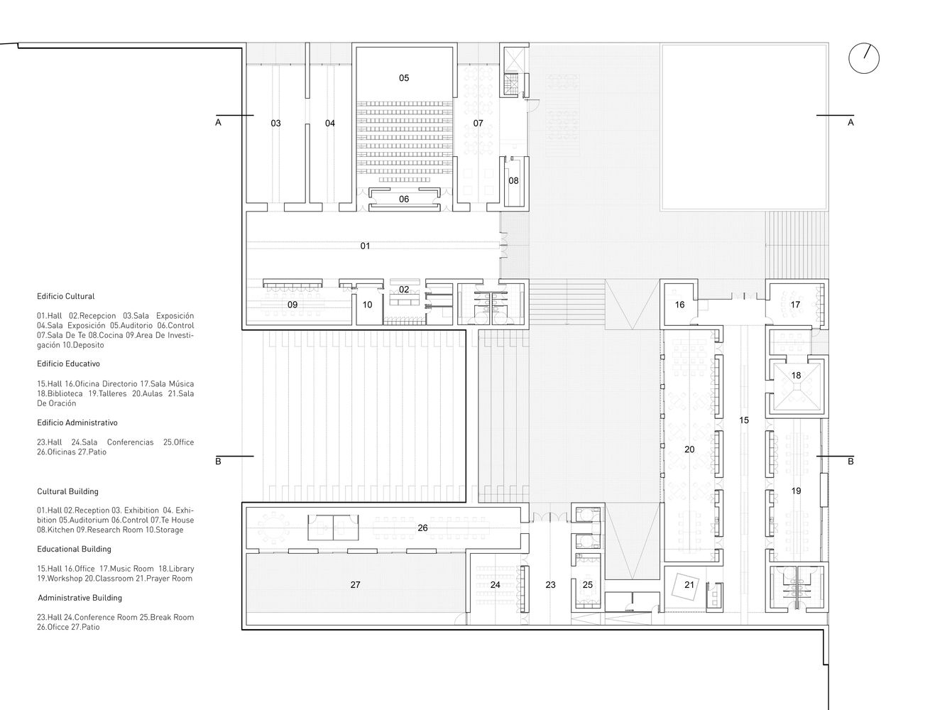 These interstitial spaces are formed by the three buildings in which the program is divided. While the public activities of the center are hosted in the Performance and Exhibition Building, the Research and Education Building hosts the semi-public activities of the program and the Administrative Building hosts the private activities. This division of the program into several building allows each to work independently, reduce the cost of maintenance and heating.