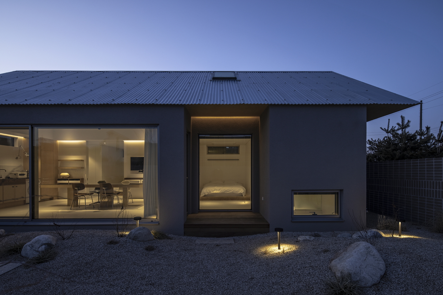 Compared to other beaches in Yangyang, which are represented by surfing, freedom, and youthful vigor, the atmosphere of Hajodae Beach, which is more peaceful and frequented by families, greatly influenced the initial plan and spatial design of the building. In order to capture the vitality of the sea and the peace of the sea at the same time, the layout of the building is static, but various materials such as metal corrugated, stone, polycarbonate, and glass blocks are combined, and the opening of the building and fence is planned so that various scenes overlap. It was intended to symbolize and express freedom.