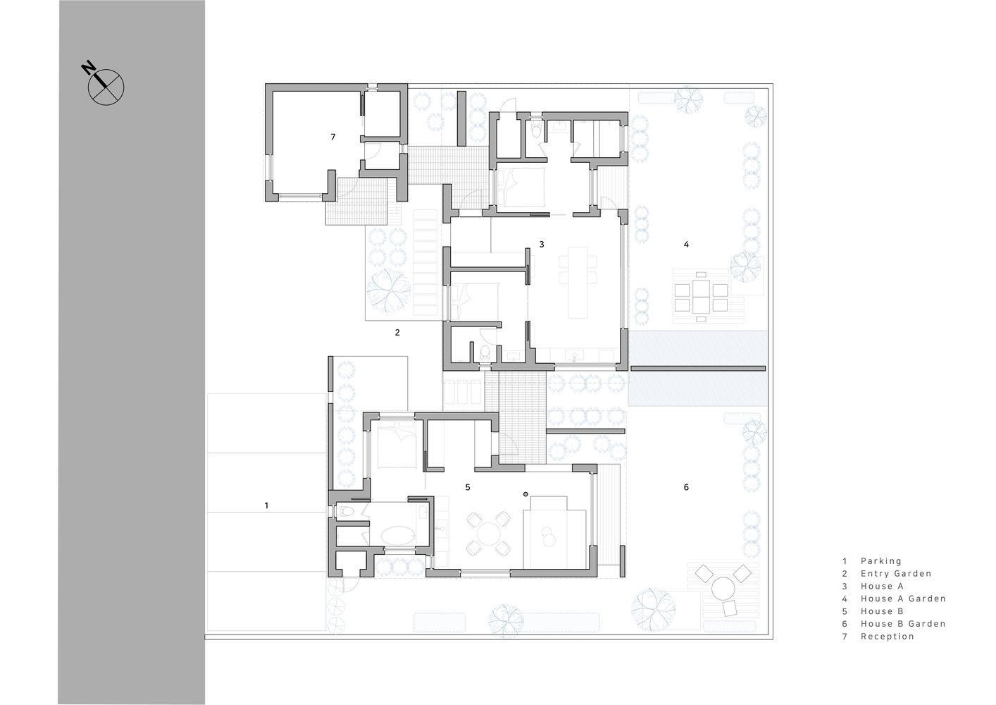 The three-story building had to be completely separated from each other even though it was a single model. The front concierge building and the two private houses share the main entrance and exit courtyard, and if you follow the divided road like an alley around this place, you will come to a private entrance to each building. The gardens of the two buildings facing the rear of the site face the same direction, but the independent structure with the lower part and the water space secure each other's visual privacy.