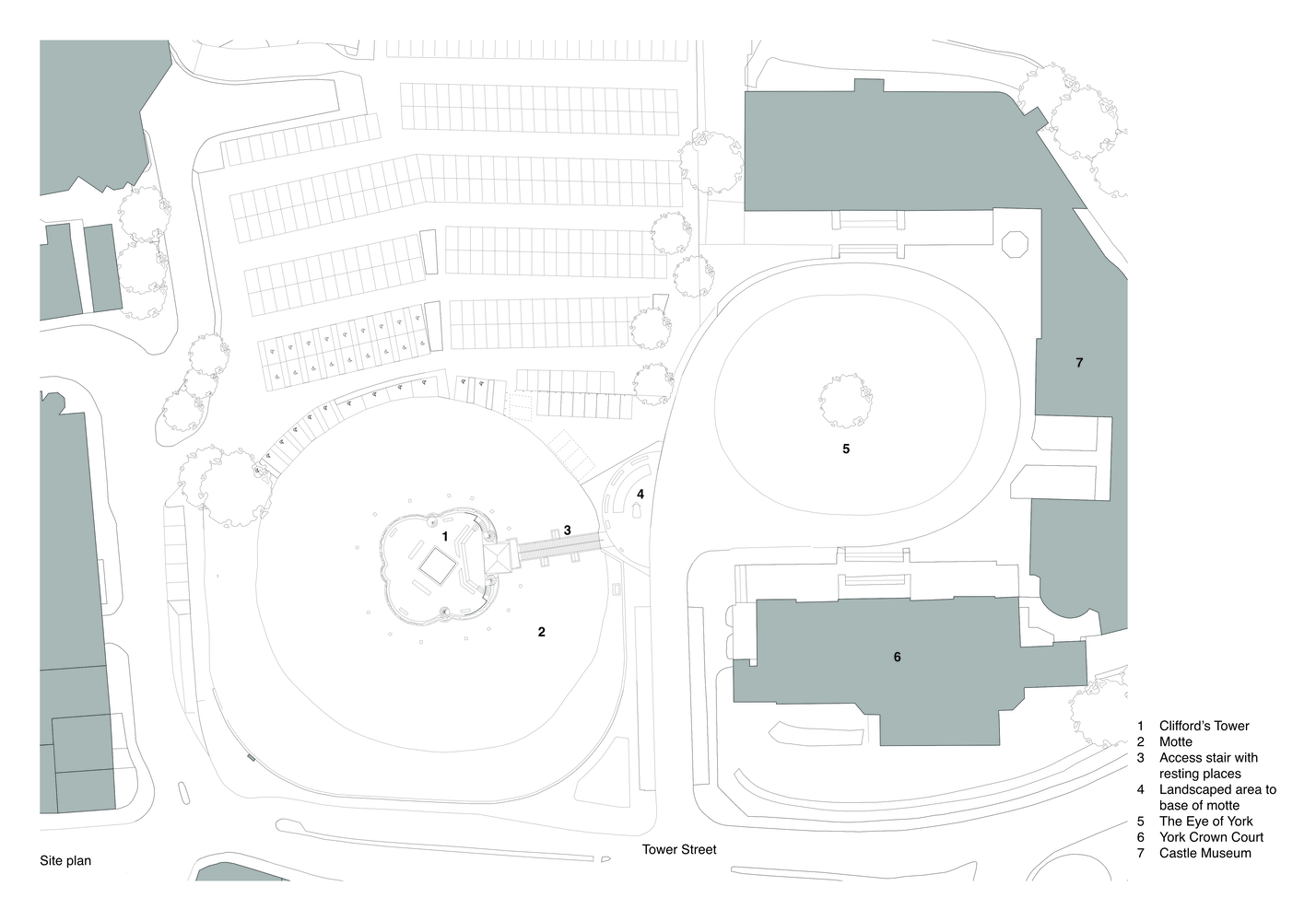 Access to the tower has been enhanced through improvements to the existing stair up the motte. Three resting places have been created, allowing people to pull off to the side of the stair, pause, and sit down. A newly enlarged public area at the base of the motte incorporates interpretation, accommodates an English Heritage-branded Piaggio tuk-tuk (auto-rickshaw) for the sale of tickets and guidebooks, and offers a ground-level place to engage with visitors, including those unable to ascend to the tower.