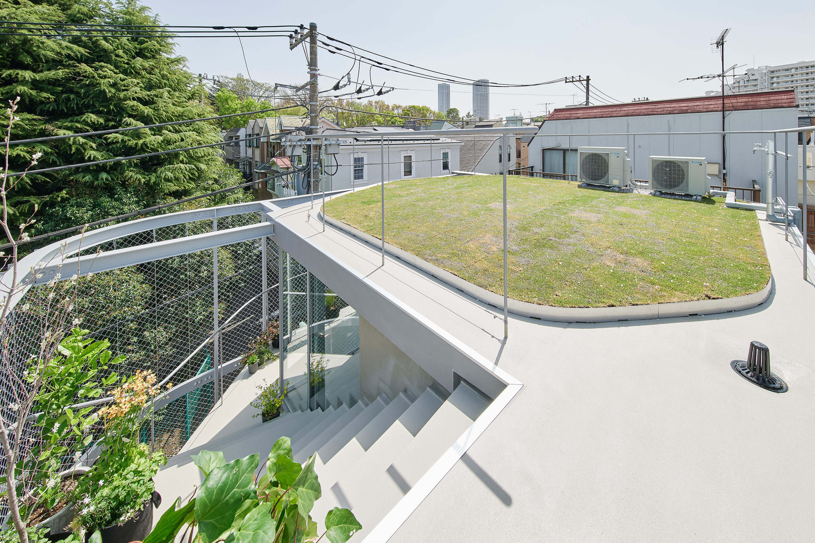 The house blurs the boundaries between interior and exterior to blend with the parks in the surroundings. The perimeter ‘promenade,’ protected by a wire mesh and plants, connects the different rooms and ends in the rooftop garden.