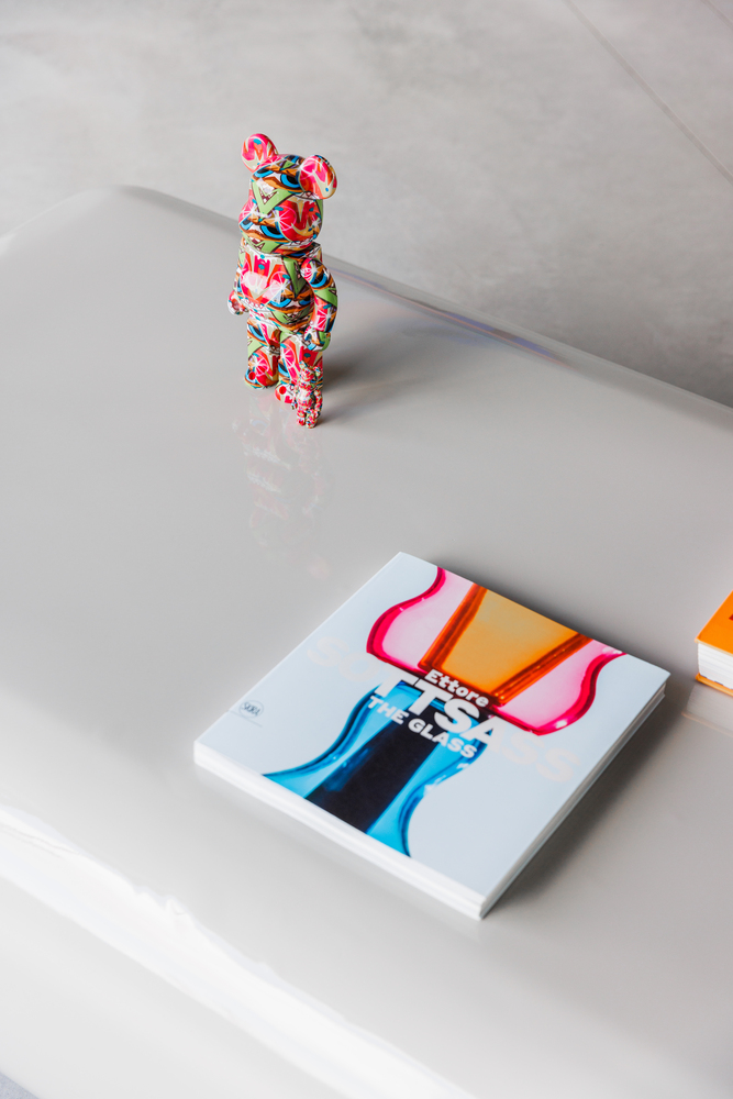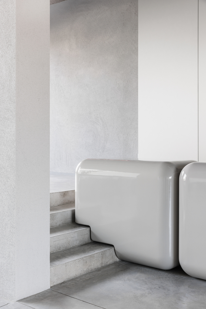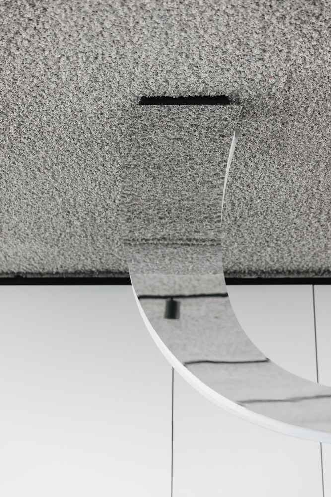 Flow. The open-plan space can be divided into different zones by using a smart freestanding system that offers full flexibility and can easily be assembled or expanded whenever and wherever without the need for tools. Display elements and backgrounds in different sizes and colors can be added accordingly. “We created zones by using a flexible system and focal points that serve each activity individually. The overall gray shell and textured material mix provide a full experience. Functionality can and should be beautiful.” states 5AM designer Amber Feijen.