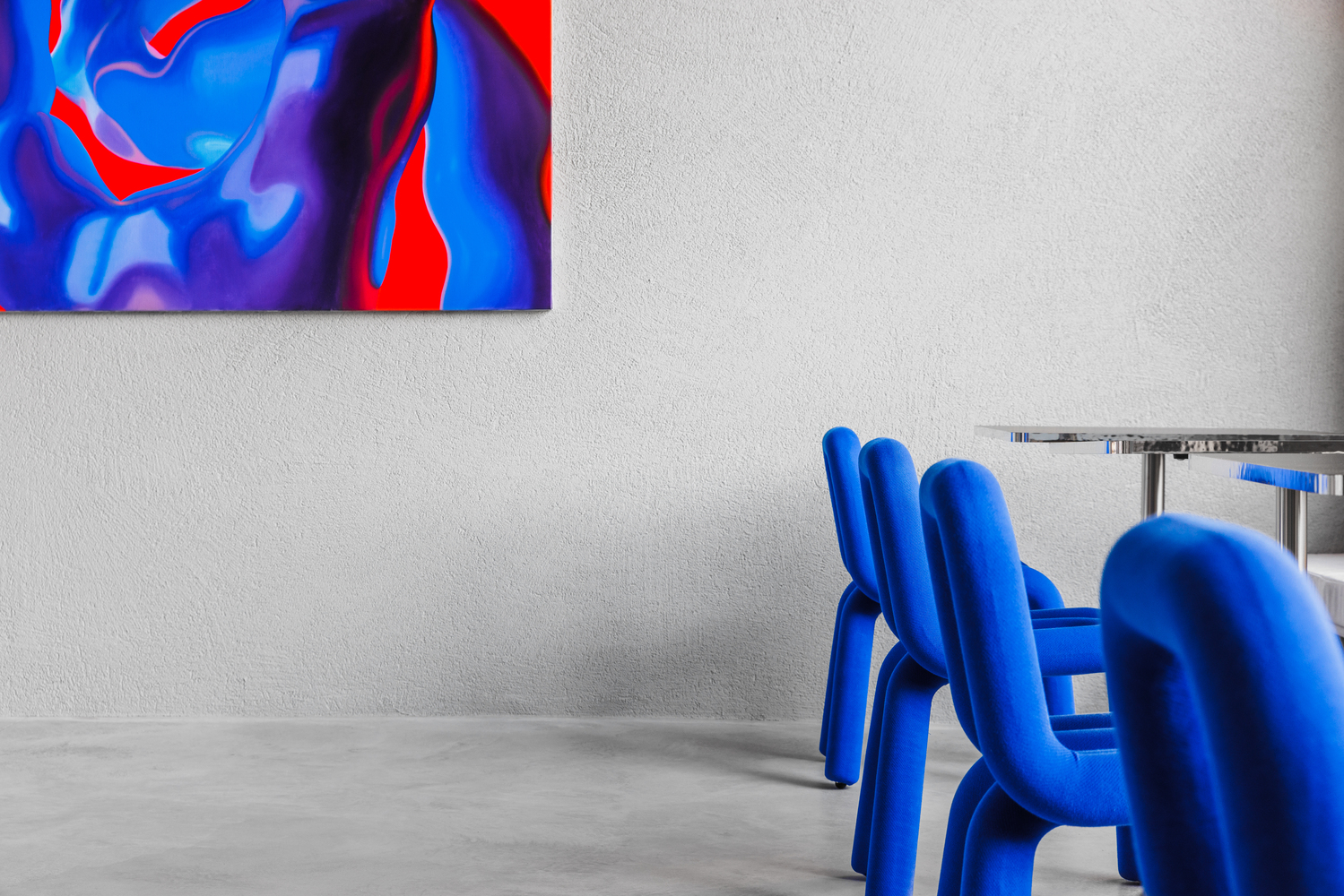 Concept. 5AM decided to flip things around and recreated the typical street artist’s canvas, the concrete jungle, in a minimal, stripped-down version inside the gallery. The monochrome gray palette refers to the city’s hero color and roughness. Contrasting smooth and rough city textures are altered. Urban art often functions as cultural commentary, regularly infused with bold shapes and colors, pop-art inspiration, and recognizable cartoon characters, combined with a signature streak of sobering humor. Leave it to 5AM to integrate these elements in a subtle yet undeniable way.