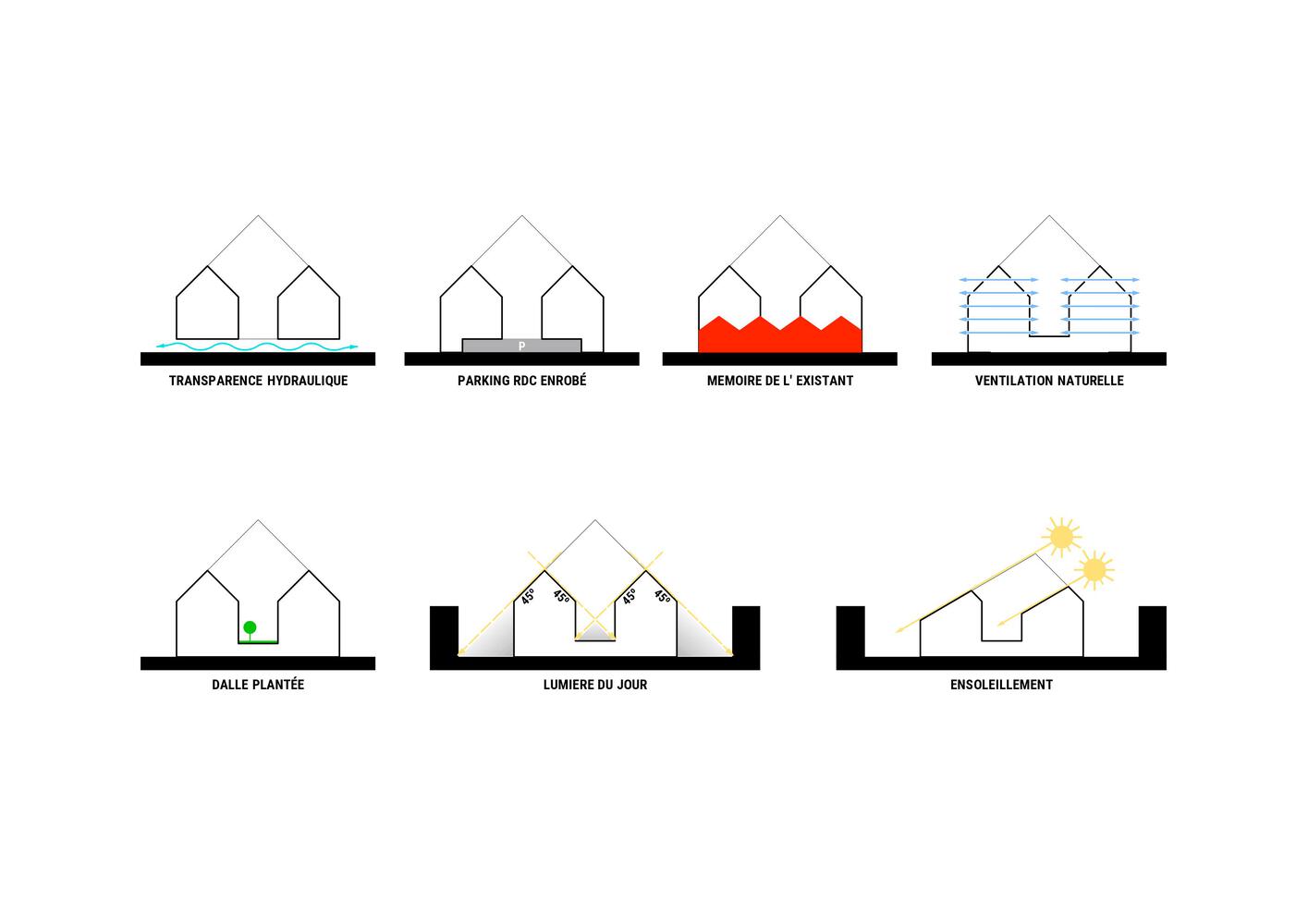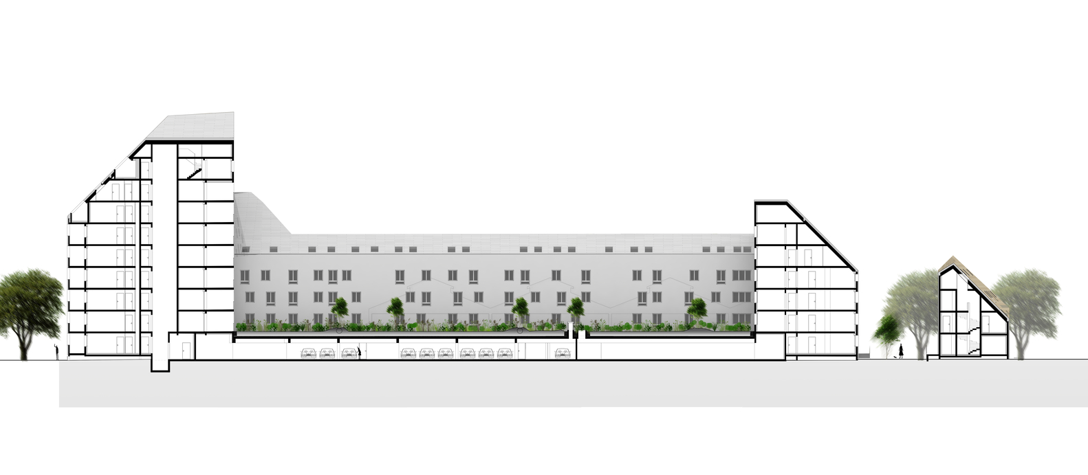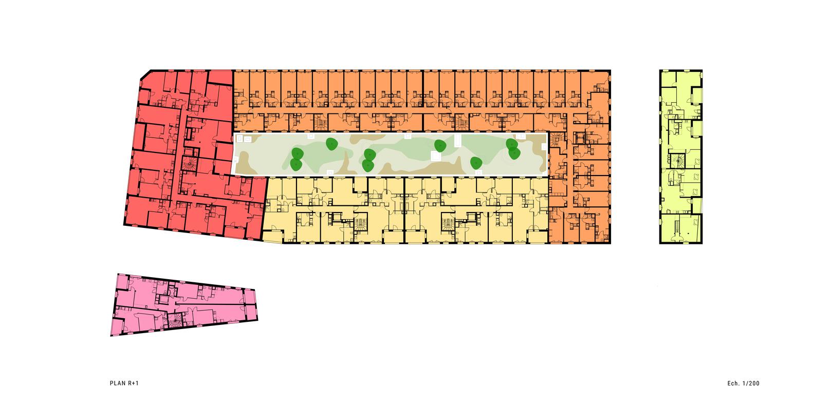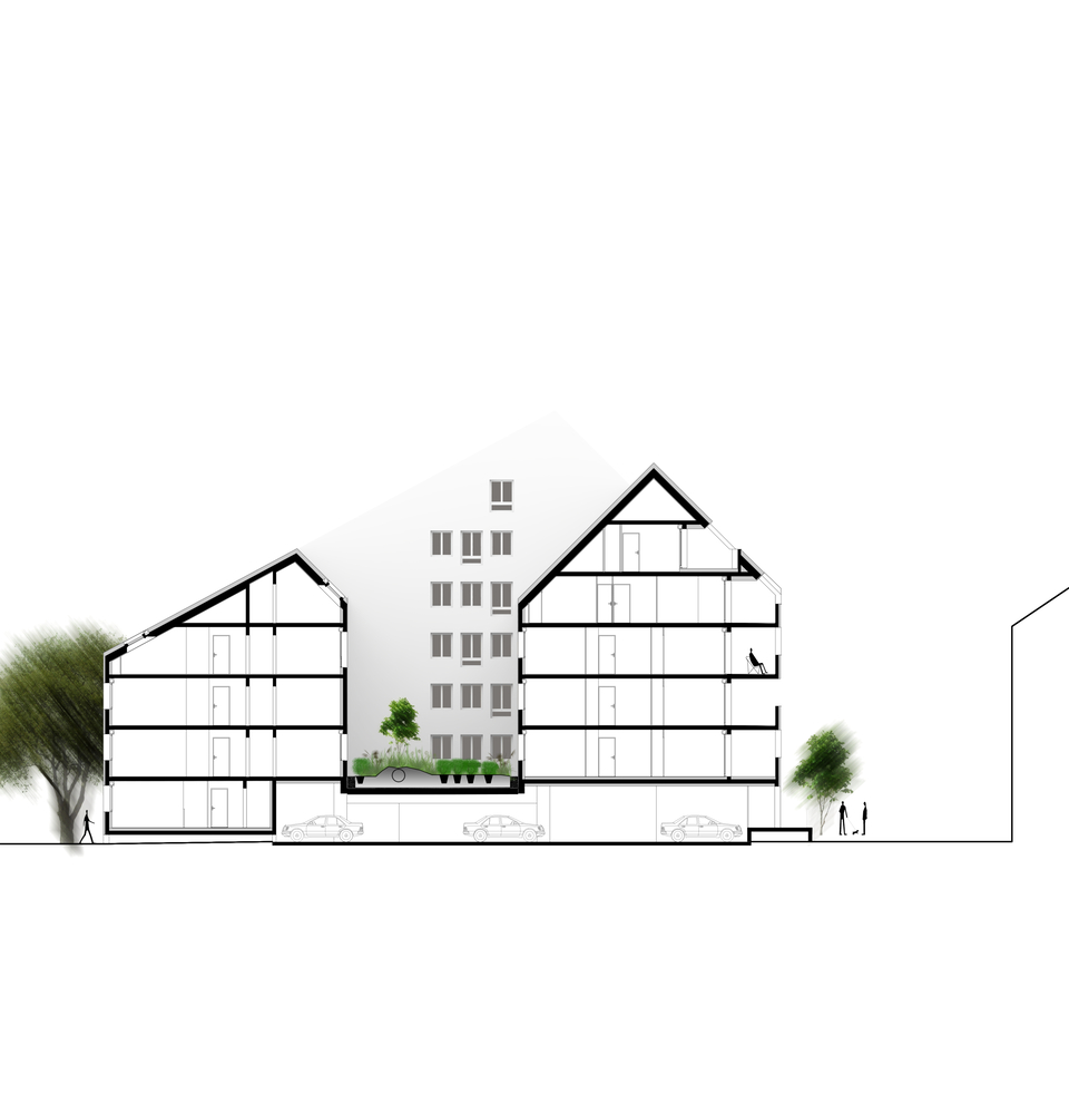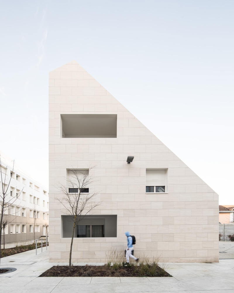 Consisting of 3 buildings, 1 large and 2 small based on the footprint of existing constructions and infrastructure, it keeps the layout of the site. This new neighborhood aims to connect completely with the adjacent existing residential area.