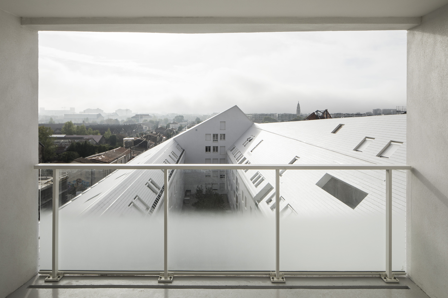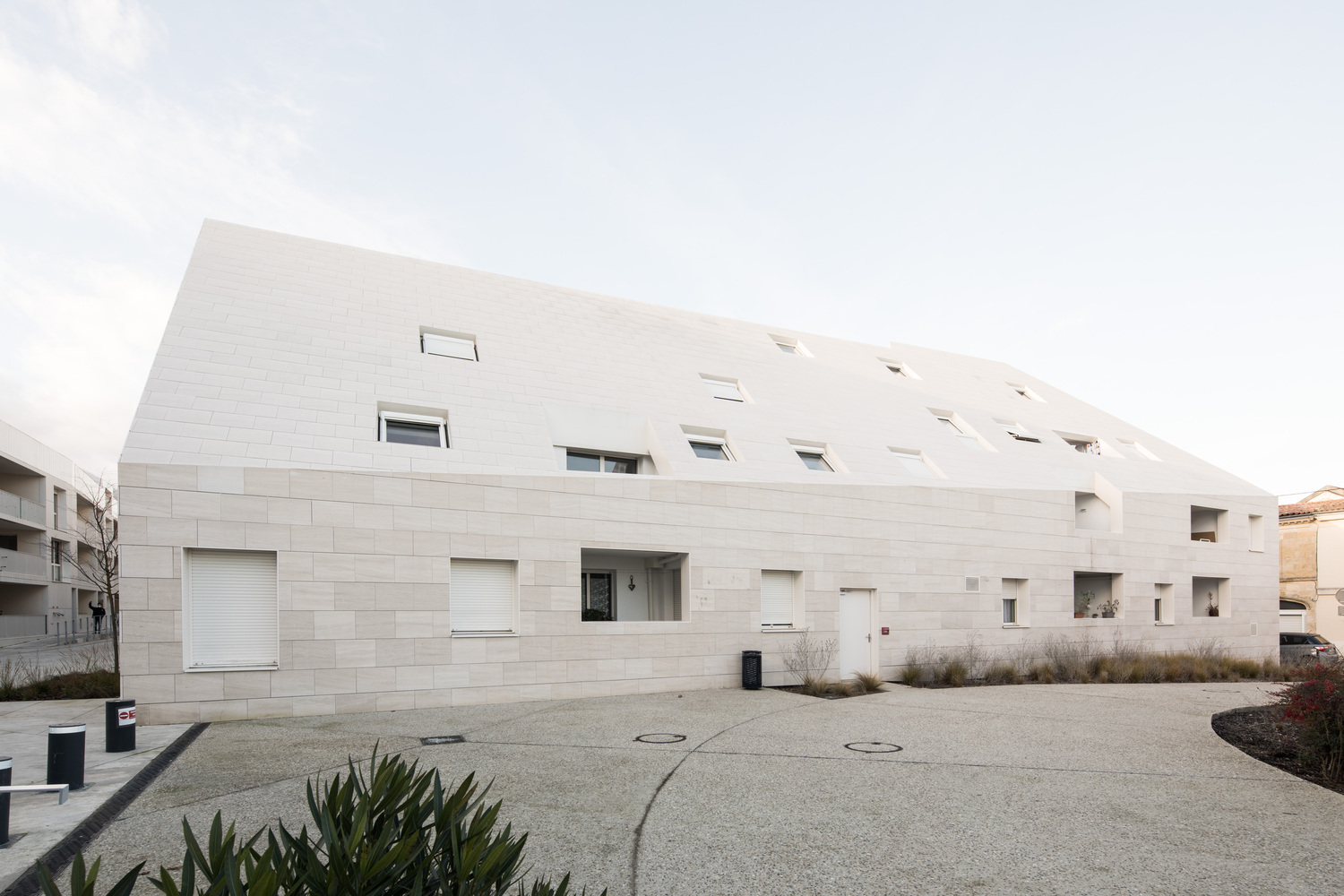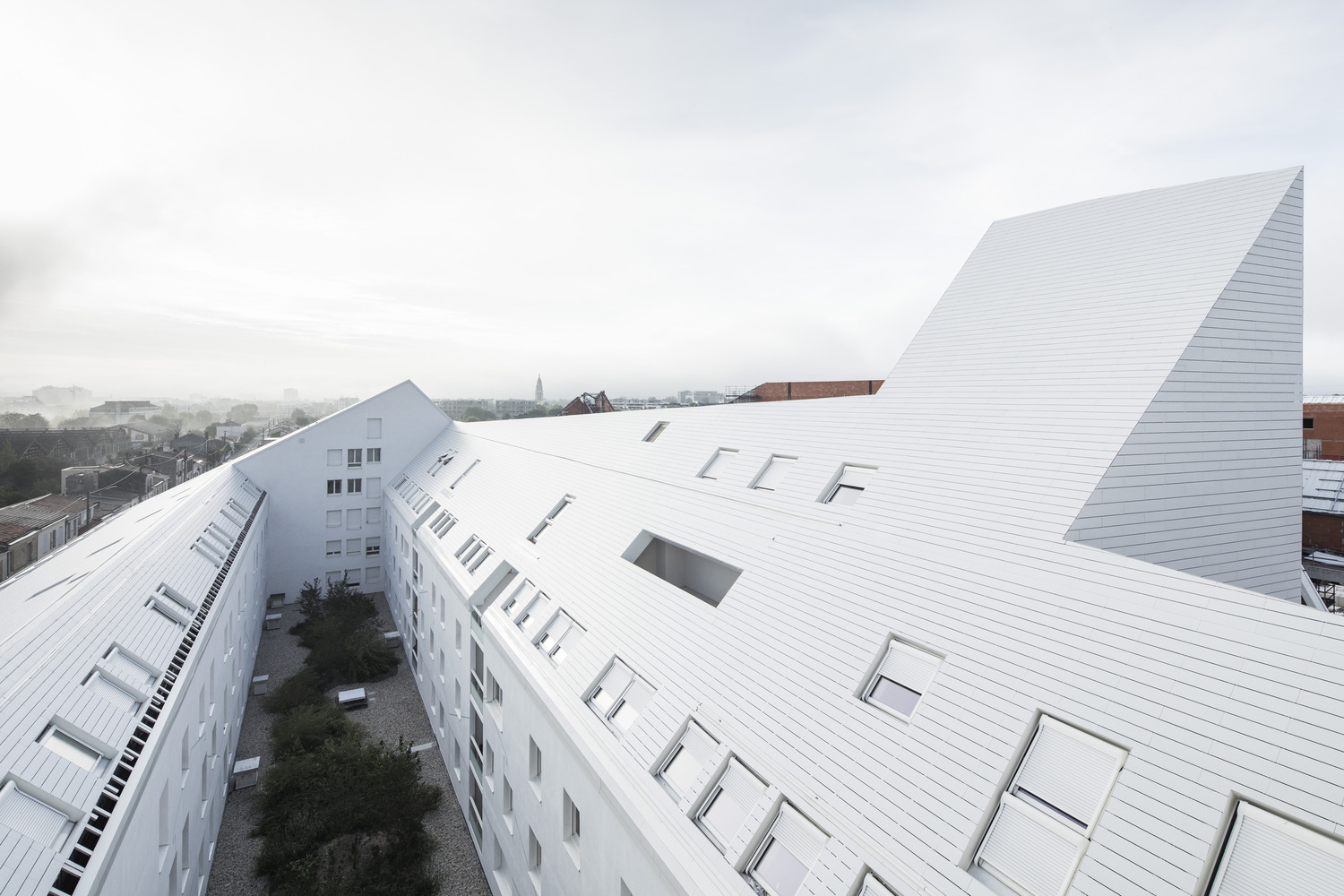 The buildings are completely covered in one single material to emphasize the volumes and create a high-quality roof landscape, which is visible from across Bordeaux.