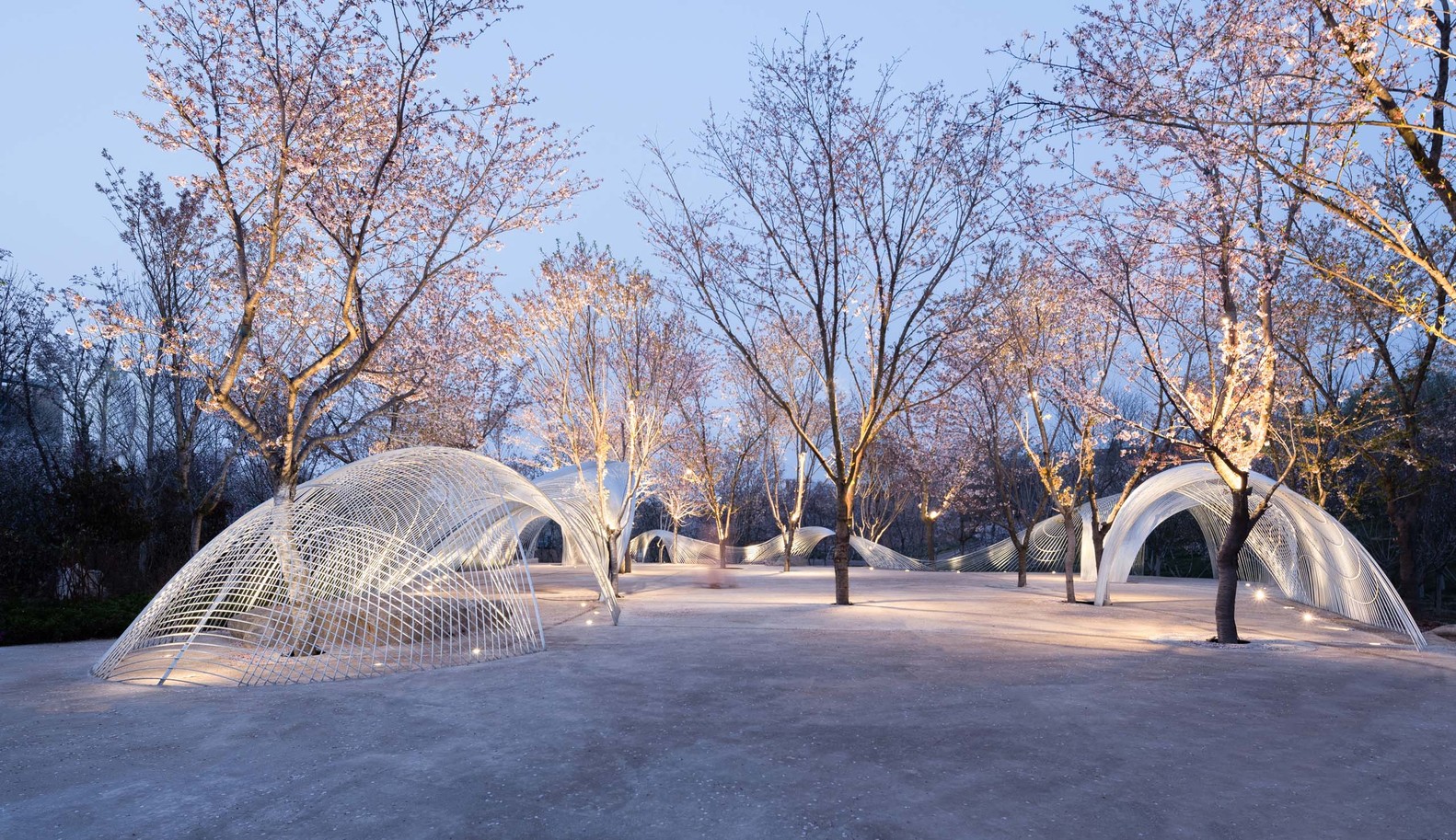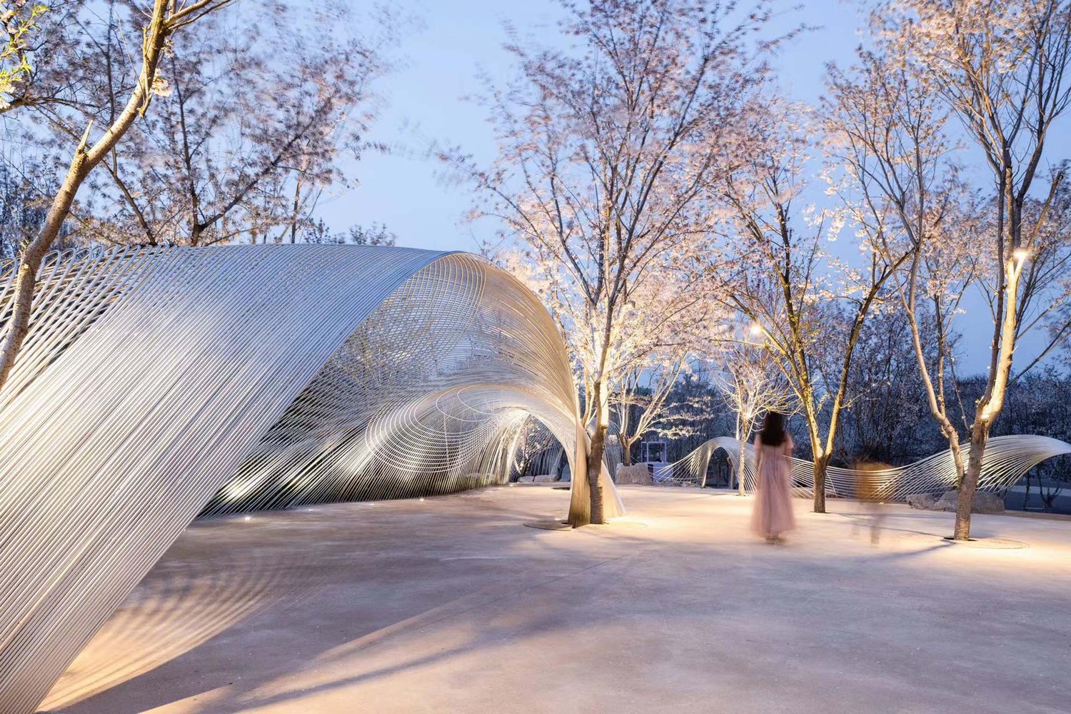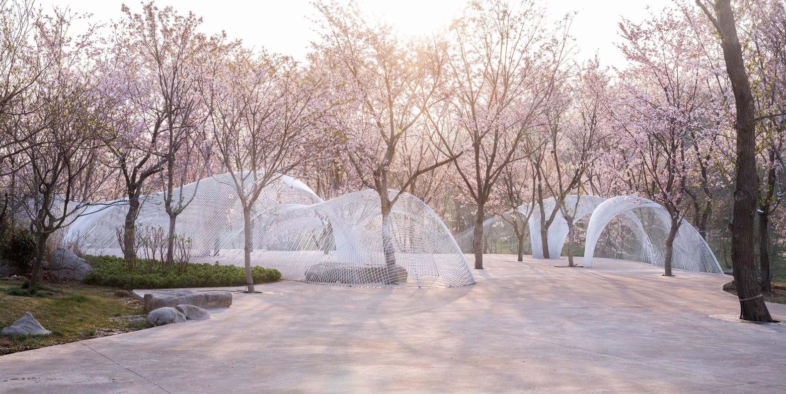Egret Bay art museum is located in Rizhao, Shandong Province. It is located at the east foot of Wulian mountain, a famous Buddhist mountain. Mr. Su Dongpo visited the mountain many times during the reign of the governor of Mizhou, and left a good sentence of "its beauty does not reduce the wild geese". The construction concept of the town is to "reshape the relationship between man and nature". On a land area of 10000 mu, it combines the aesthetic space with the natural landscape and various business forms. After more than ten years of construction, it seems to be an ideal place for people to live. In the early spring of this year, Mr. Xu qunde, the founder of egret Bay, went on an outing with me. I talked to him about a building I had built before. There was a process photo. In the picture, there was a woven curved steel mesh floating lightly in the woods hidden by mist. Seeing this picture, Mr. Xu immediately said that there was a place in egret bay where one could be woven, which was located in the cherry blossom Valley mentioned above. Mr. Xu wants to build a building in the center of Cherry Valley as a place for music, dance, drama, and other artistic activities. He described to me that his ideal state is "nature is the best", the cherry tree is the main body, and the architecture is hidden in it. The two form a perfect relationship. As I understand it, this building is like a small thatched canopy hidden in deep mountains and lakes in Chinese landscape painting, facing the landscape with an elegant attitude, and taking nature as the soul.