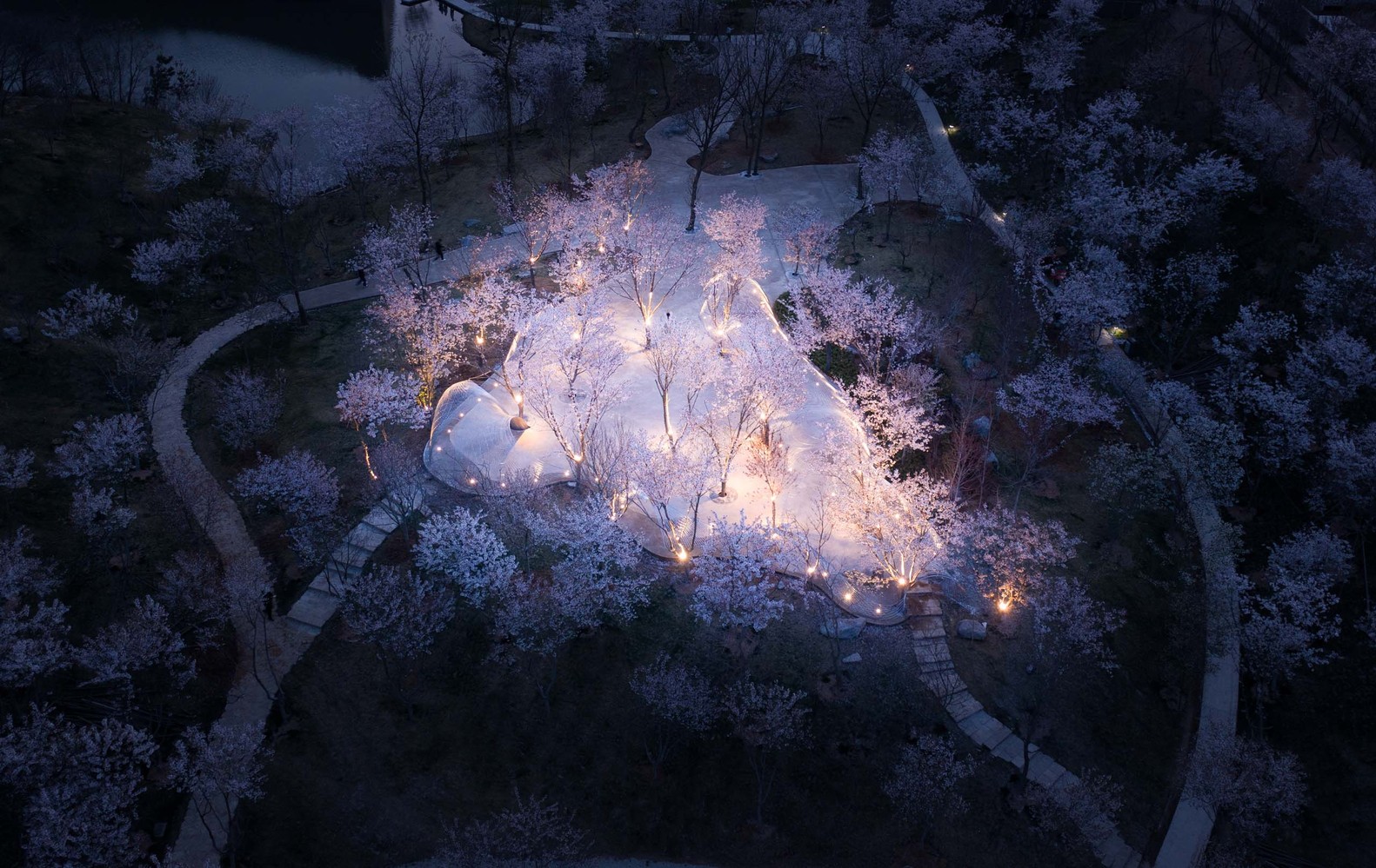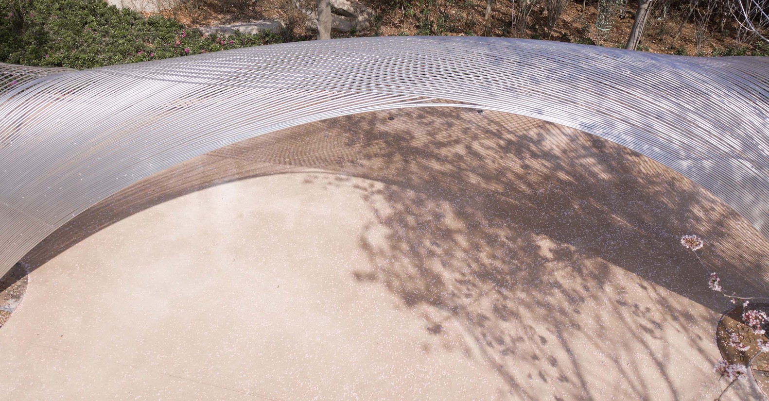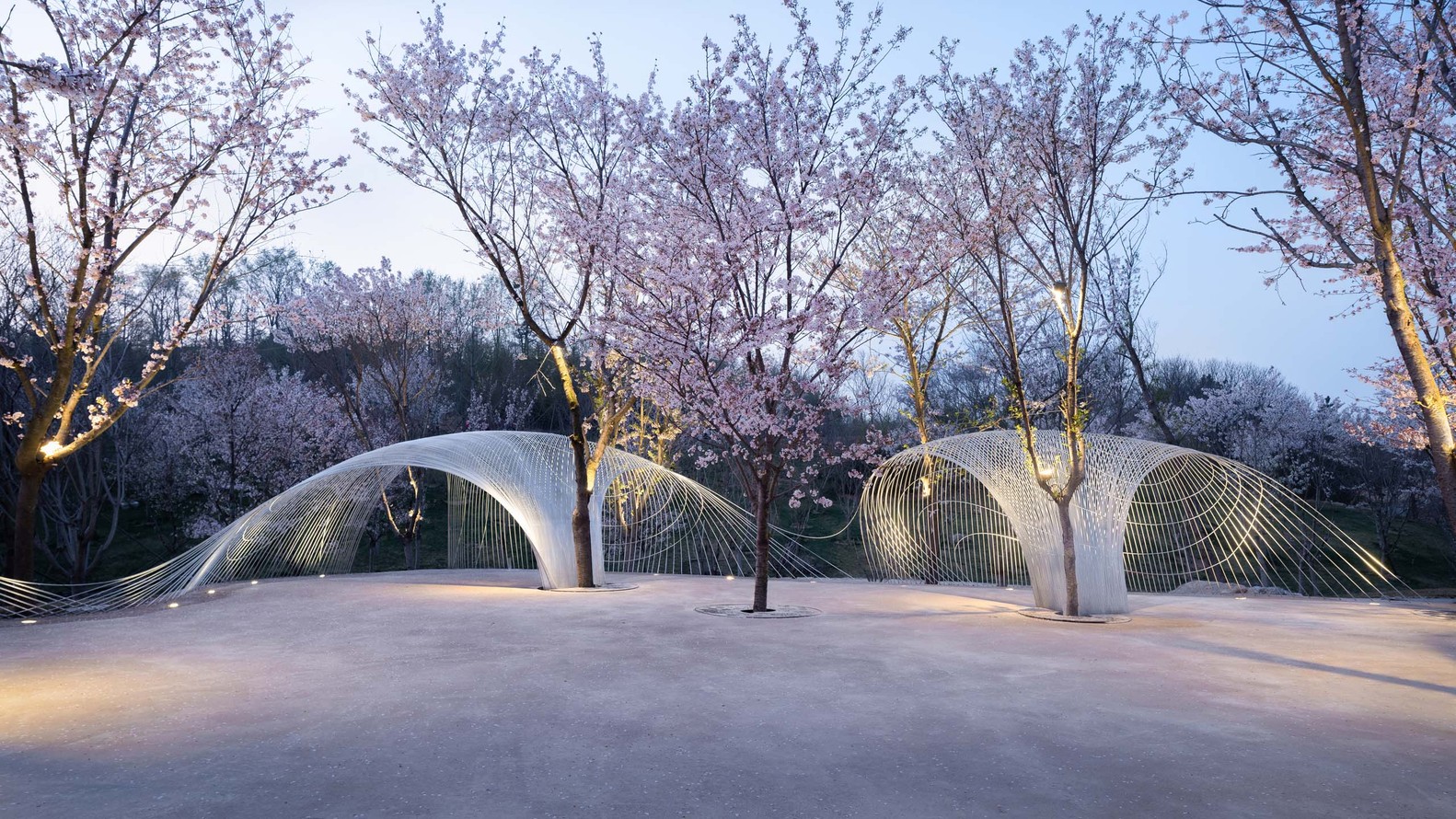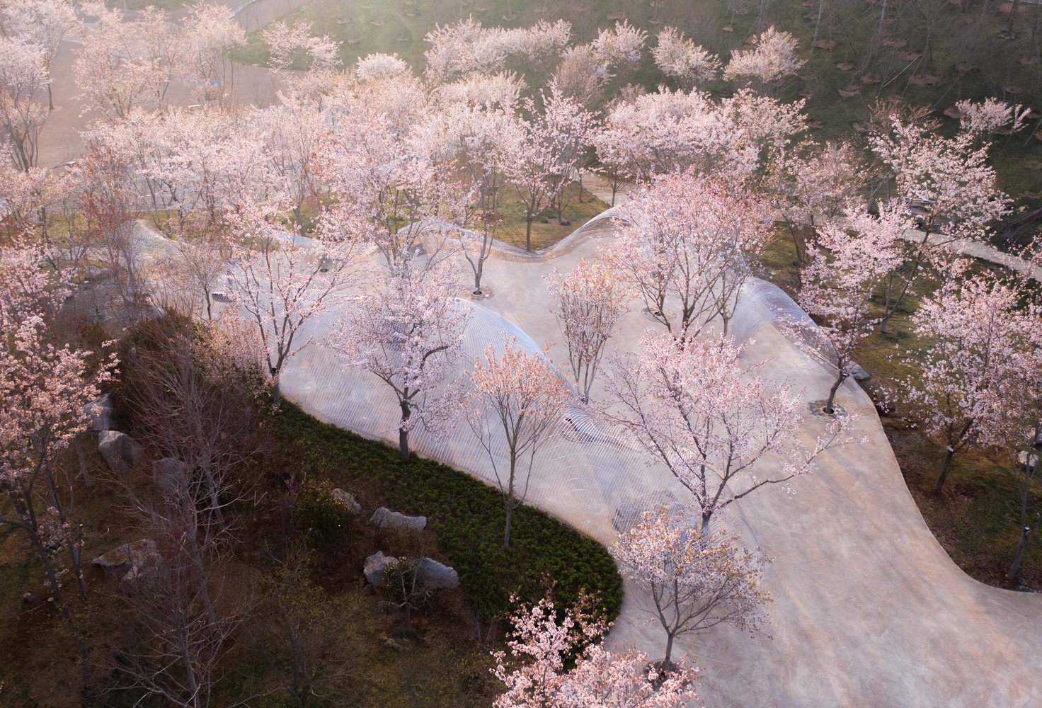 Egret Bay art museum is located in Rizhao, Shandong Province. It is located at the east foot of Wulian mountain, a famous Buddhist mountain. Mr. Su Dongpo visited the mountain many times during the reign of the governor of Mizhou, and left a good sentence of "its beauty does not reduce the wild geese". The construction concept of the town is to "reshape the relationship between man and nature". On a land area of 10000 mu, it combines the aesthetic space with the natural landscape and various business forms. After more than ten years of construction, it seems to be an ideal place for people to live. In the early spring of this year, Mr. Xu qunde, the founder of egret Bay, went on an outing with me. I talked to him about a building I had built before. There was a process photo. In the picture, there was a woven curved steel mesh floating lightly in the woods hidden by mist. Seeing this picture, Mr. Xu immediately said that there was a place in egret bay where one could be woven, which was located in the cherry blossom Valley mentioned above. Mr. Xu wants to build a building in the center of Cherry Valley as a place for music, dance, drama, and other artistic activities. He described to me that his ideal state is "nature is the best", the cherry tree is the main body, and the architecture is hidden in it. The two form a perfect relationship. As I understand it, this building is like a small thatched canopy hidden in deep mountains and lakes in Chinese landscape painting, facing the landscape with an elegant attitude, and taking nature as the soul.
