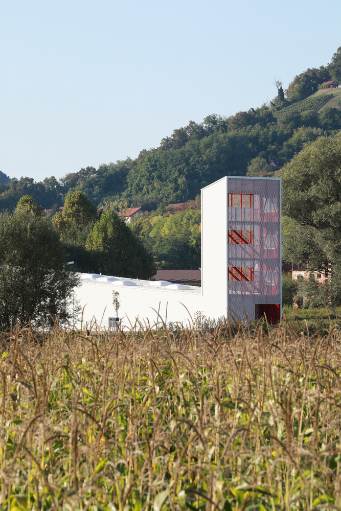 The tower is primarily used for firefighters’ training but is also a landmark, a sign in the landscape. Its steel structure, visible through the metal mesh 'curtain', is clearly showing the utilitarian character of the architecture.