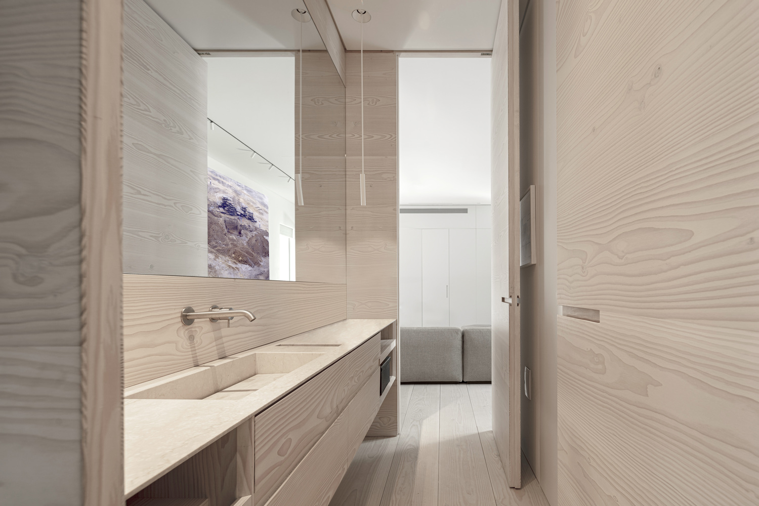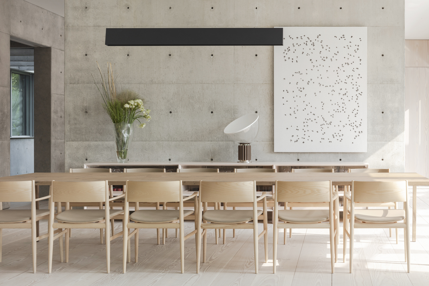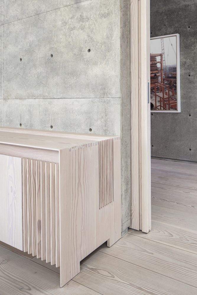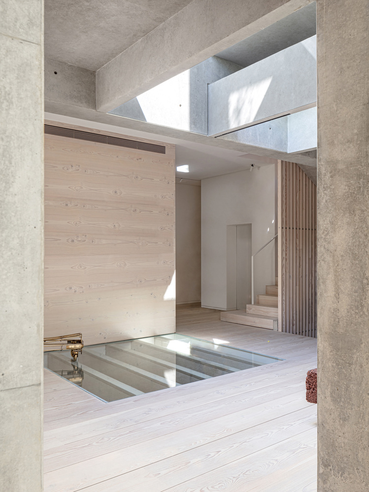 Between two of the concrete beams hides a skylight turning the axis into an avenue of light. The light goes all the way to the basement through a glazed opening on the floor. The glazed opening connects the entrance floor and open space in the basement.