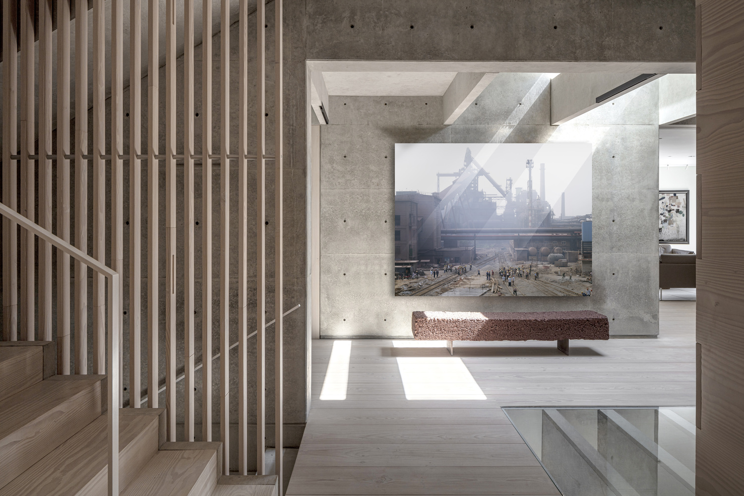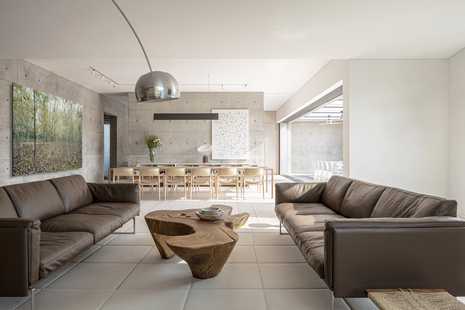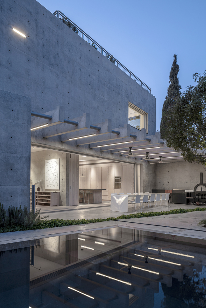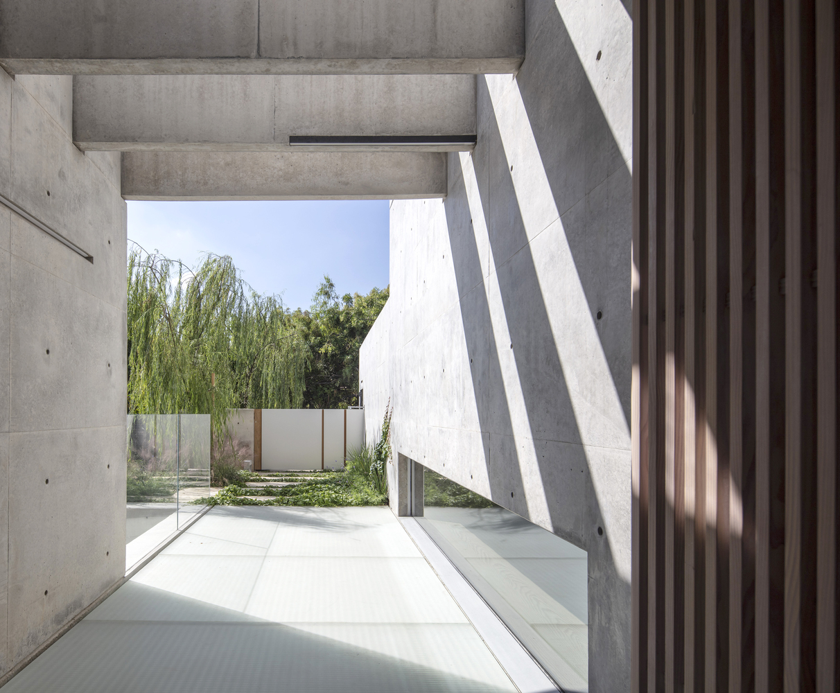 The house is surrounded by exterior courtyards which are interior-exterior spaces. The walls of the courtyards celebrate the plasticity of the concrete making a place for green and art in different ways- deep niches, double walls with plants in between, and sloping green terraces. The concrete gains a subtle feel by the presence of Douglass solid wood as floors and cabinetry. An interplay of transparencies and solidity, depth, and airiness construct the overall experience of the house.