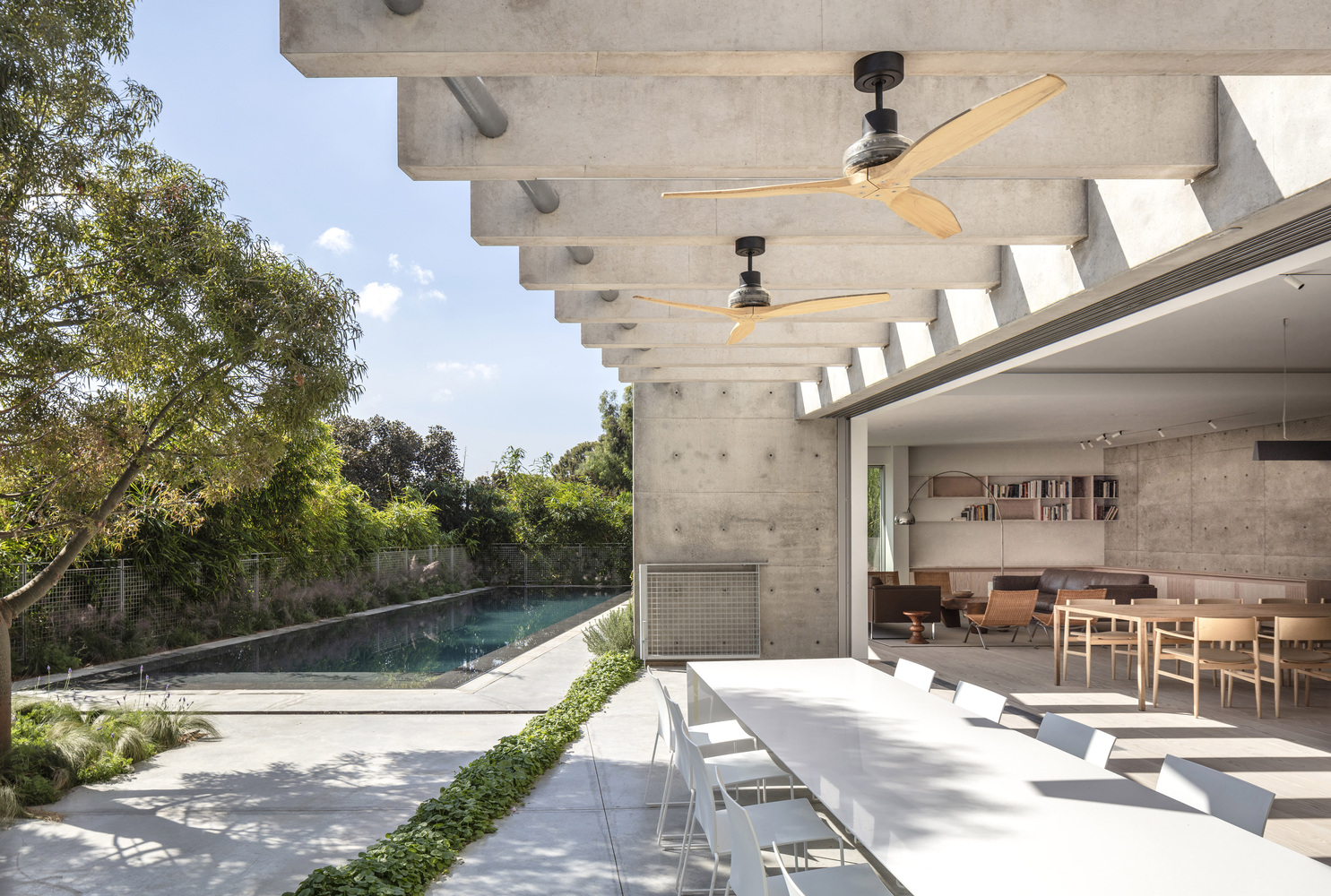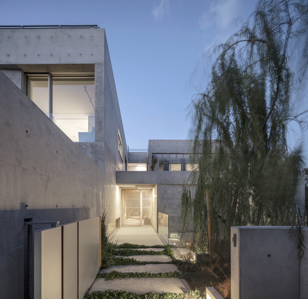 Light and green pour on the concrete walls accentuating their depth. The Entrance to the house is through the main axis, defined in the three levels by two exposed concrete walls, with an opening looking to a terraced garden at its end. The main axis is accompanied by a rhythm of exposed concrete beams appearing outside before the entrance door, continuing outside to the opposite garden.