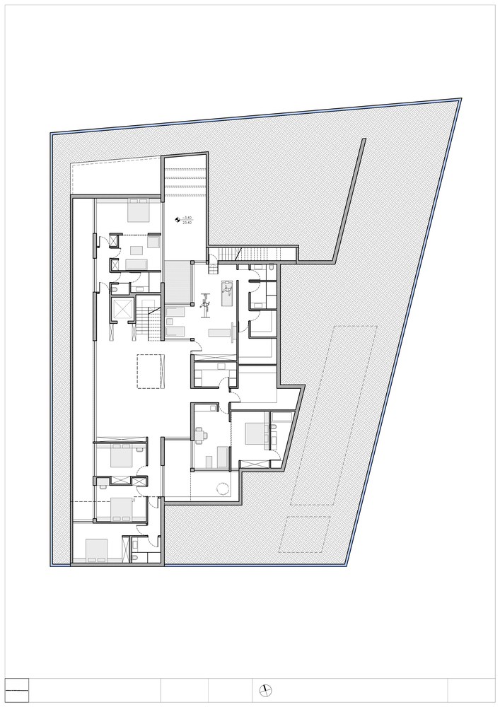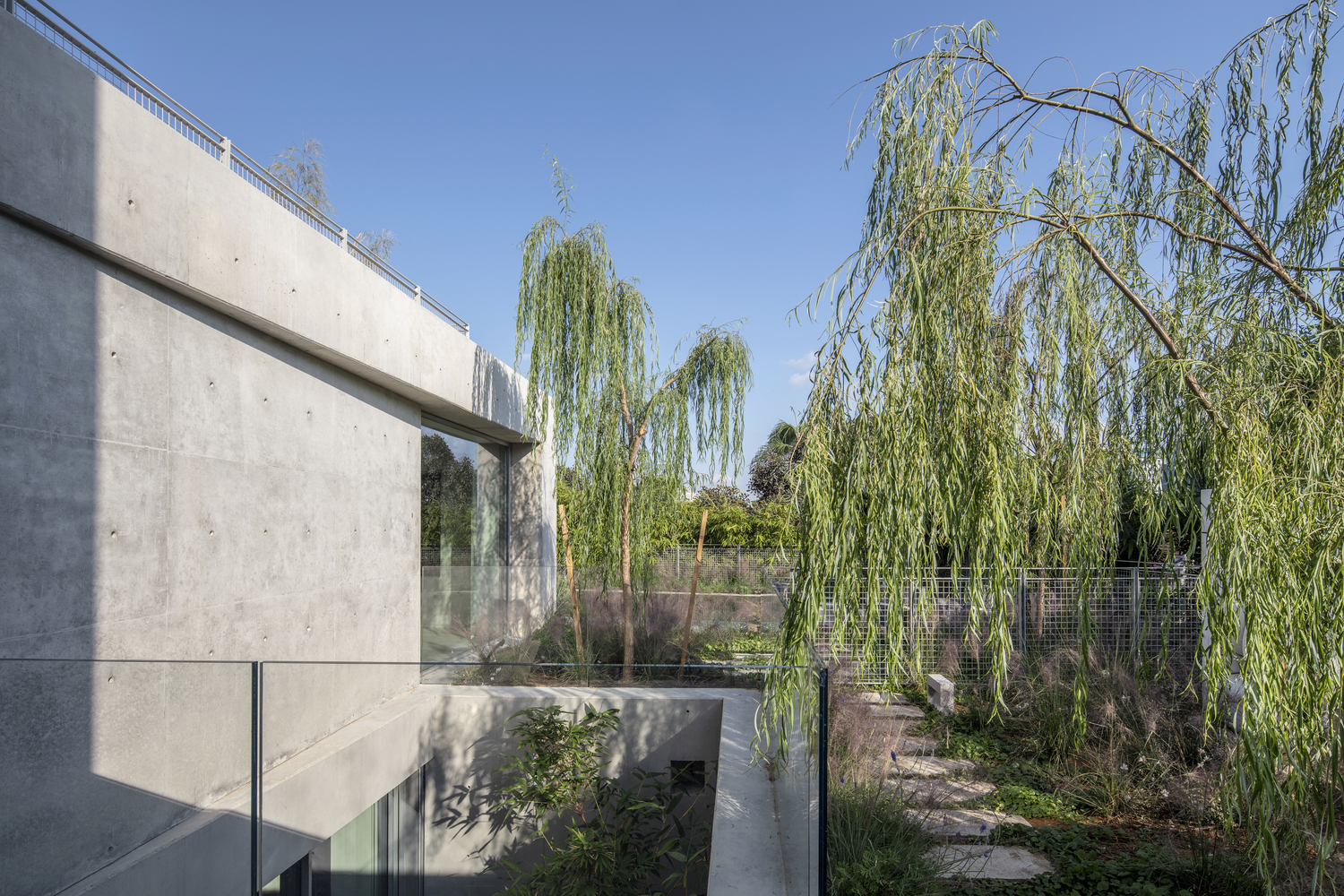 The main axis separates the house into a hosting wing, where all the guests' living units are, and the owner's wing where the public spaces and master bedroom are. The master bedroom on the second floor, enjoys two opposite interactions with the surrounding landscape – a terrace with a view of the treetops and a sloped terrain on the other side, allowing a way out to a wild garden connecting to the entrance level.