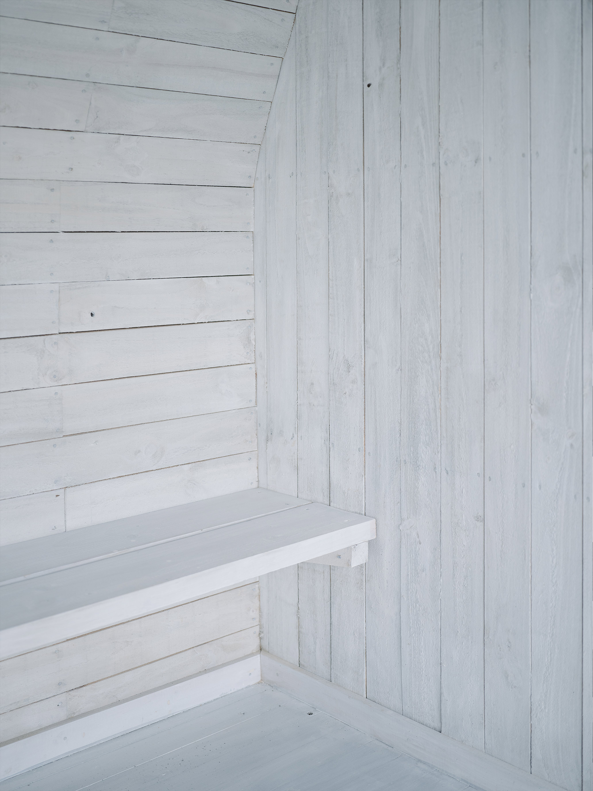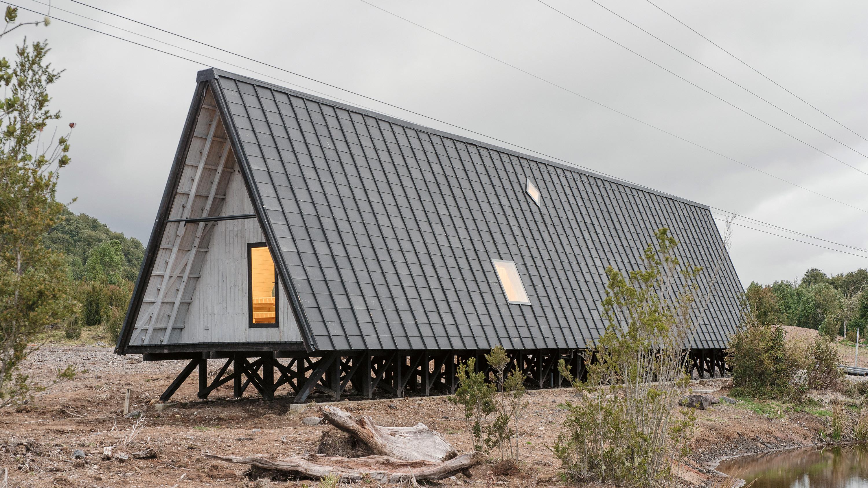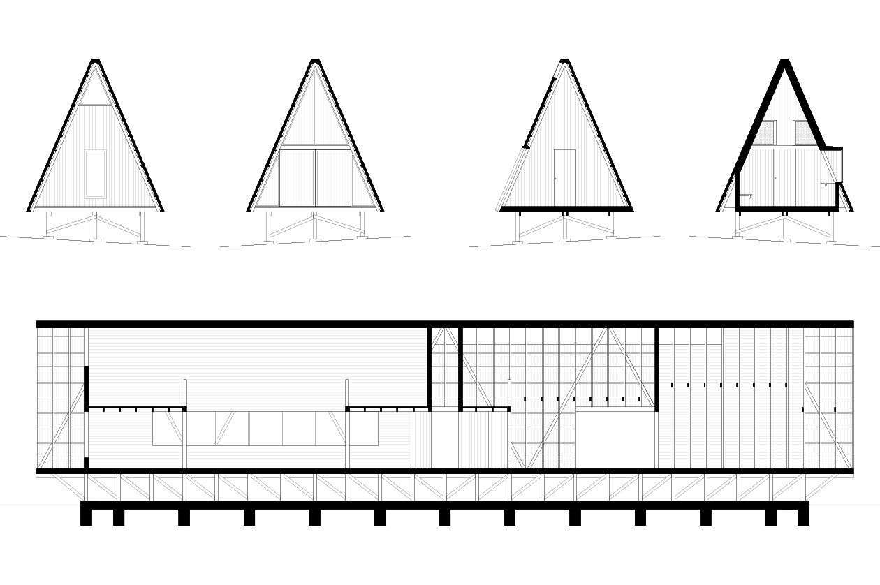 This house is like a revival of the Fachwerk tradition, with a frame set on piles in order not to interrupt the ocacasional run-off of water from a lake located in the vicinity. Intended as a home for the keeper of the large property it stands on, the building applies a rigorous geometry to place all the rooms in a row, under a roof of two steep pitches, in the process dispensing with outer walls in the proper, vertical sense, and using the rhythmic order of the subframe of untreated wood to break the silence of the opaque roof-facade.