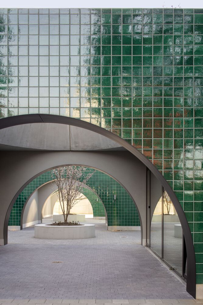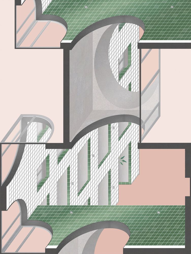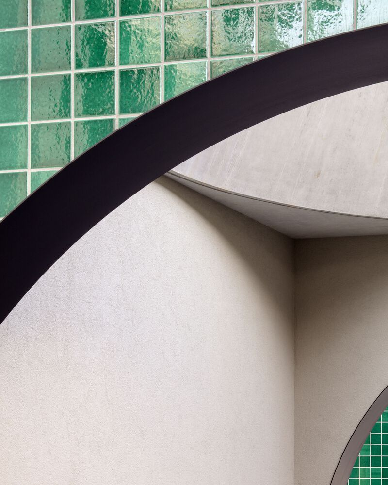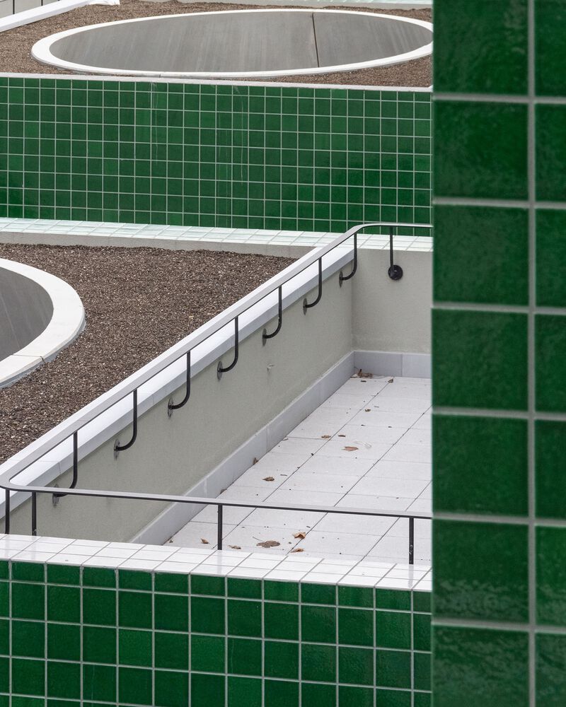 The binary rhythm of the pasodoble is also expressed by the use of the green and white ceramic tiles, handcrafted in Vietri sul Mare in Italy. They reflect each other’s qualities while providing orientation and beauty, much in contrast to the melancholy of traditional social and clinical housing.