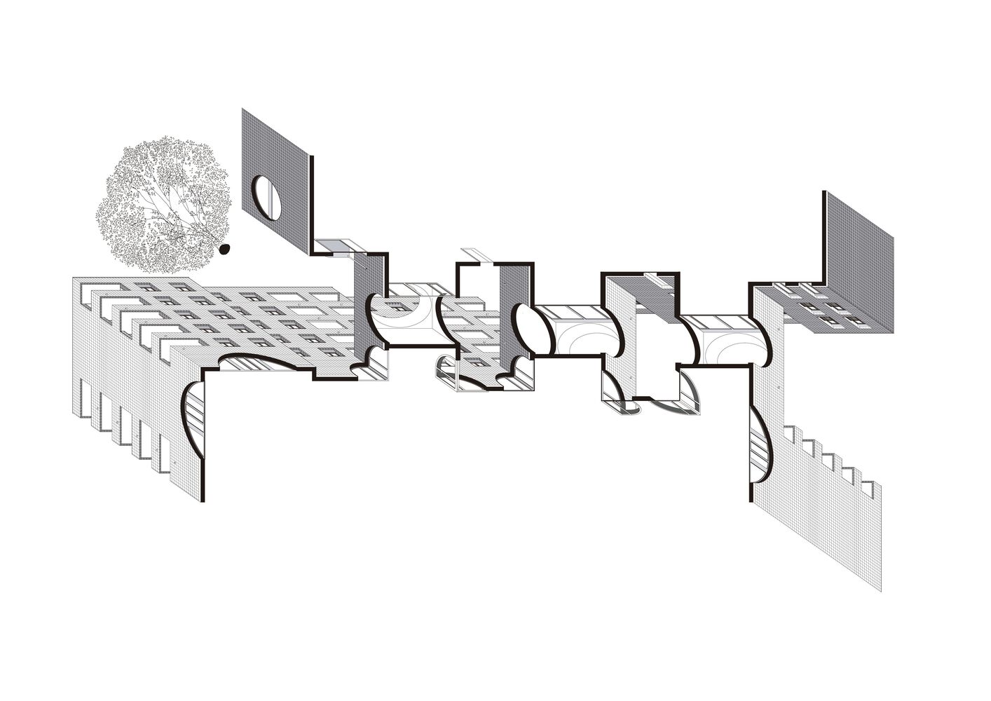 Two distinct volumes accommodate this diverse programme. They share an enfilade of slightly shifted patios. Together they reconcile the two different alignments on site and frame a majestic cedar tree. The space and the tension between the two bodies is reminiscent of the popular dance pasodoble, and creates the architectural theme and stimulates collective delight.