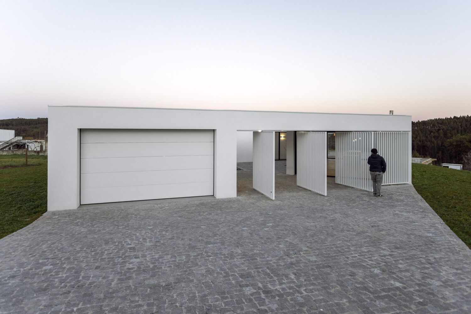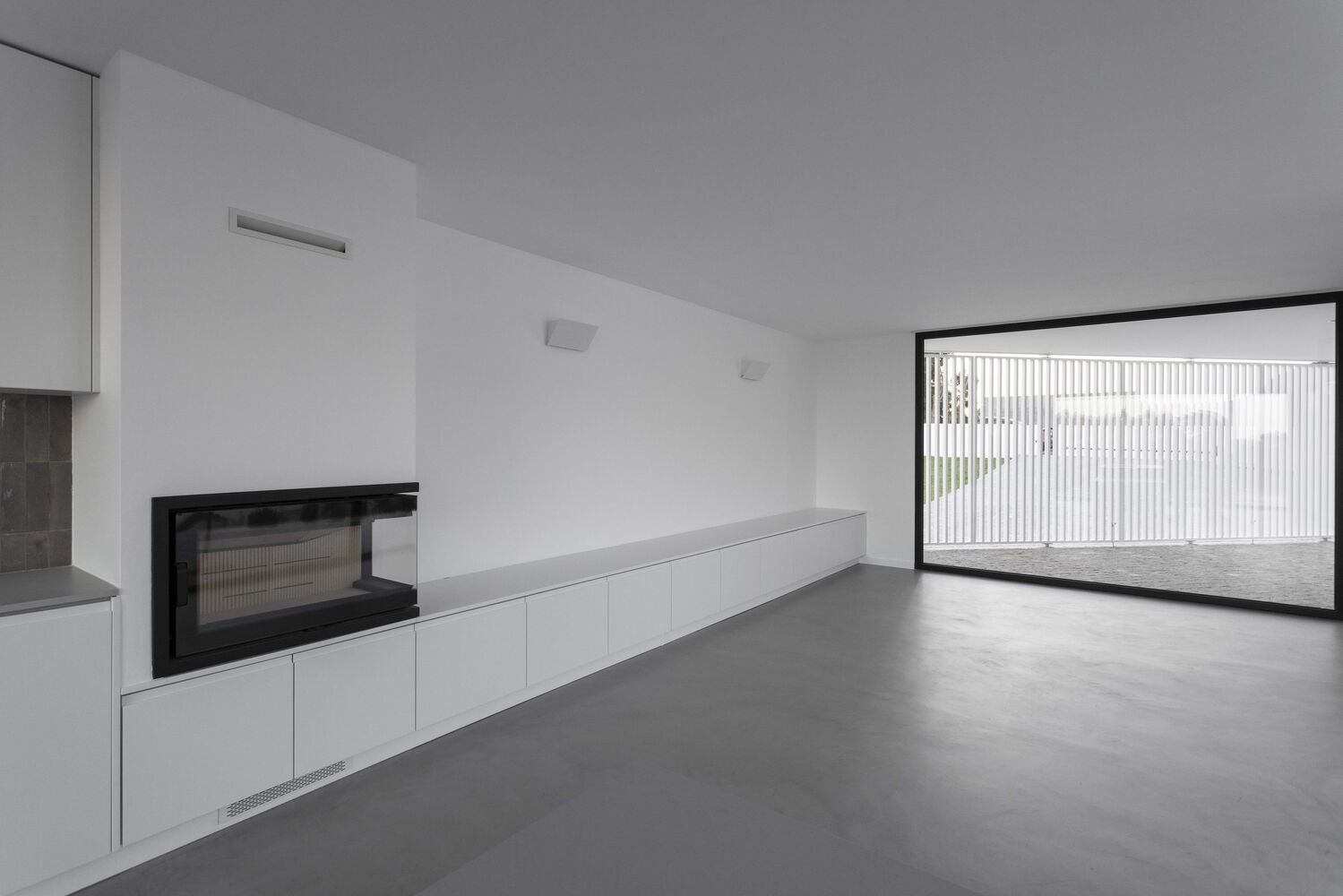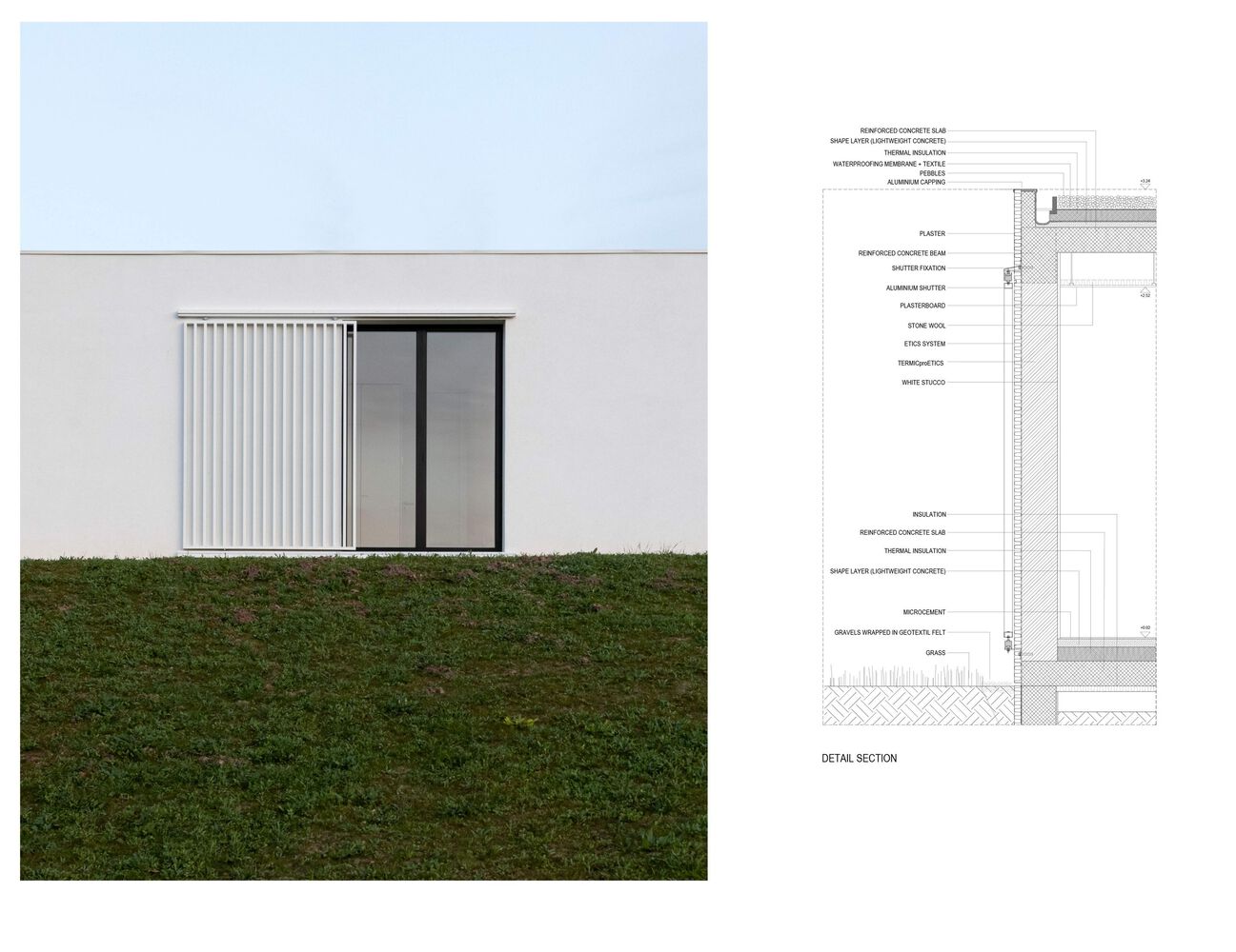 CONSTRUCTION. The house is built according to simple construction systems, a reinforced concrete structure, with white-painted "capoto" walls, a single light-grey micro cement floor on the inside, and granite slabs on the outside. The project also is provided with sliding and pivoting shutters, which give the possibility of intimacy and security to the outdoor terraces.