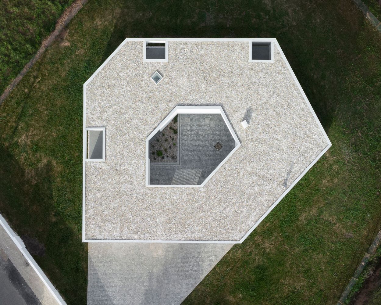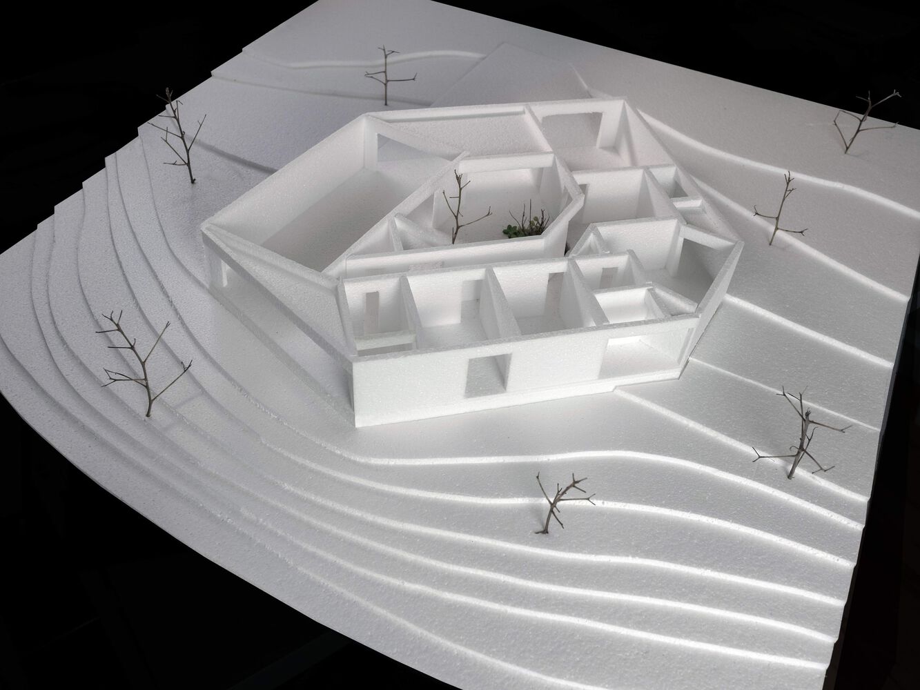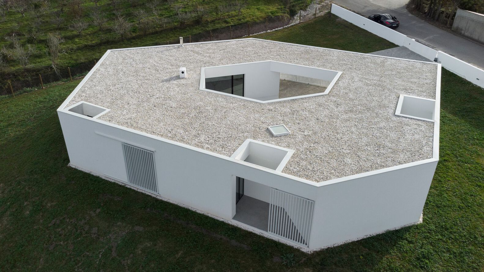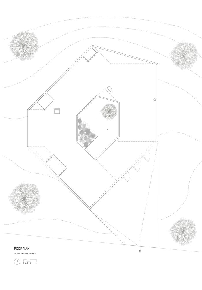 The final configuration of the house is defined by two horizontal planes, a floor and a roof which have the same shape embodying and aggregating the experience of the house around the patio.