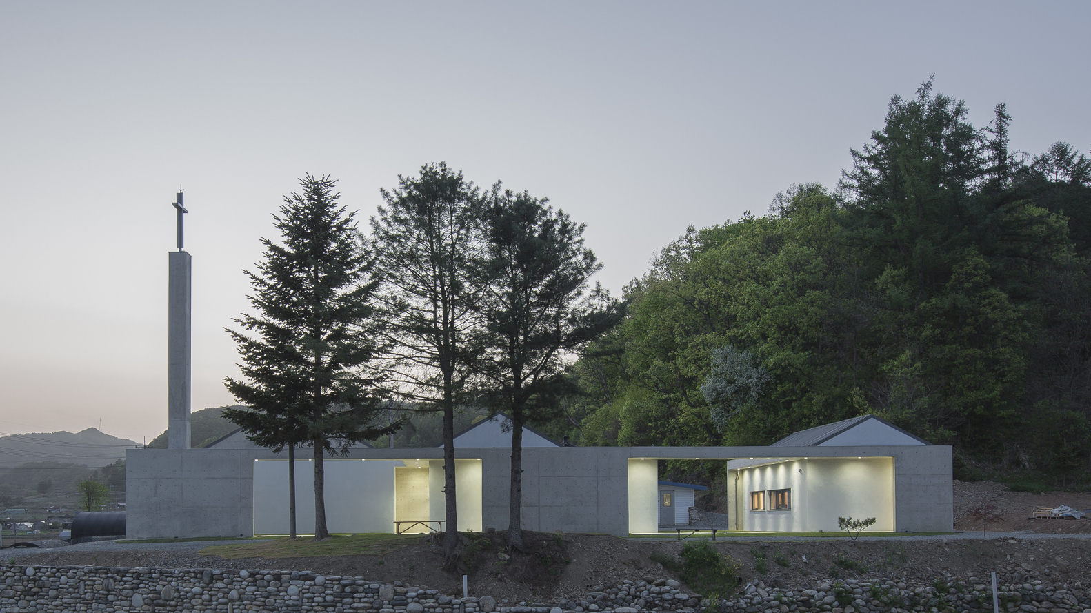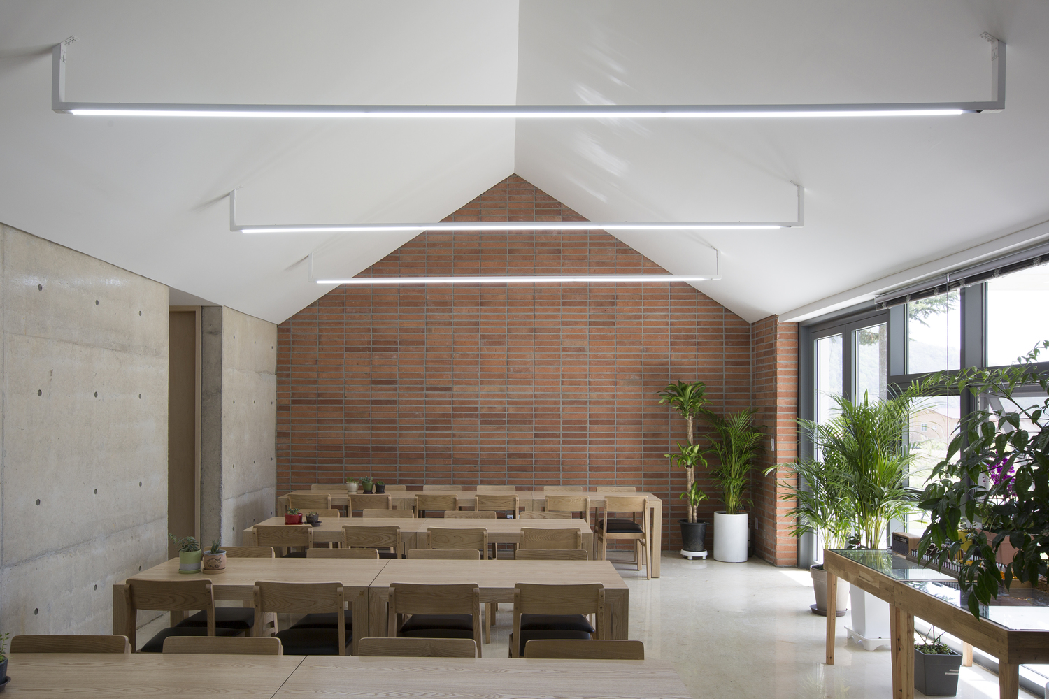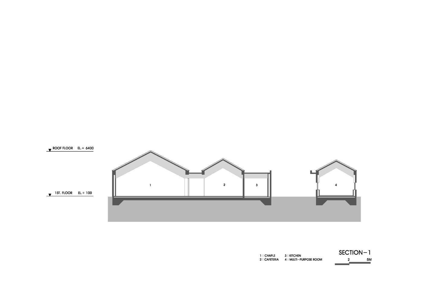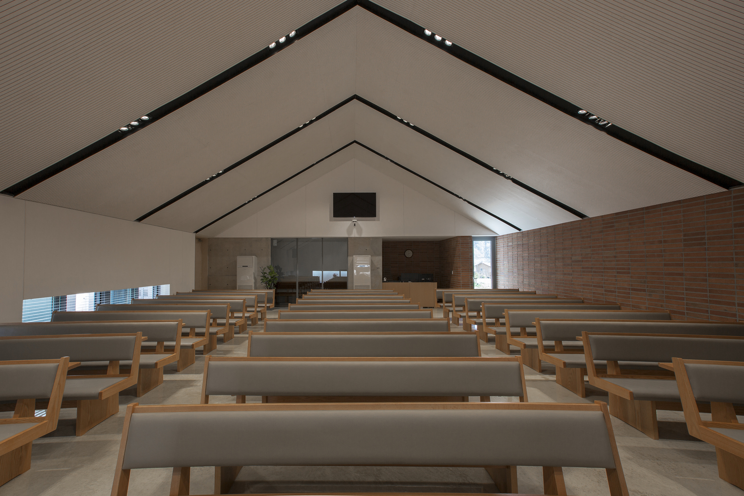 A variety of external spaces, including the front garden, backyard, and courtyard, were inserted between the buildings, enabling a rich experience. The three gable roofs soaring like brothers were surrounded by exposed concrete plates. The concrete plate forming the layer created a sense of depth, and the movement lines were organized. Inner space. The interior is decorated with natural light and made of bricks and exposed concrete. A box filled with light was put in the front of the chapel. A soft light filled in through the low, elongated window on the side.