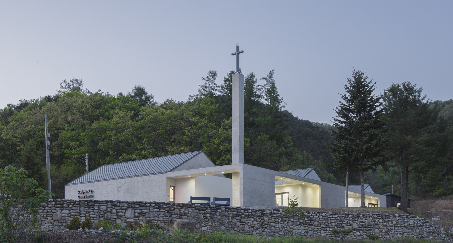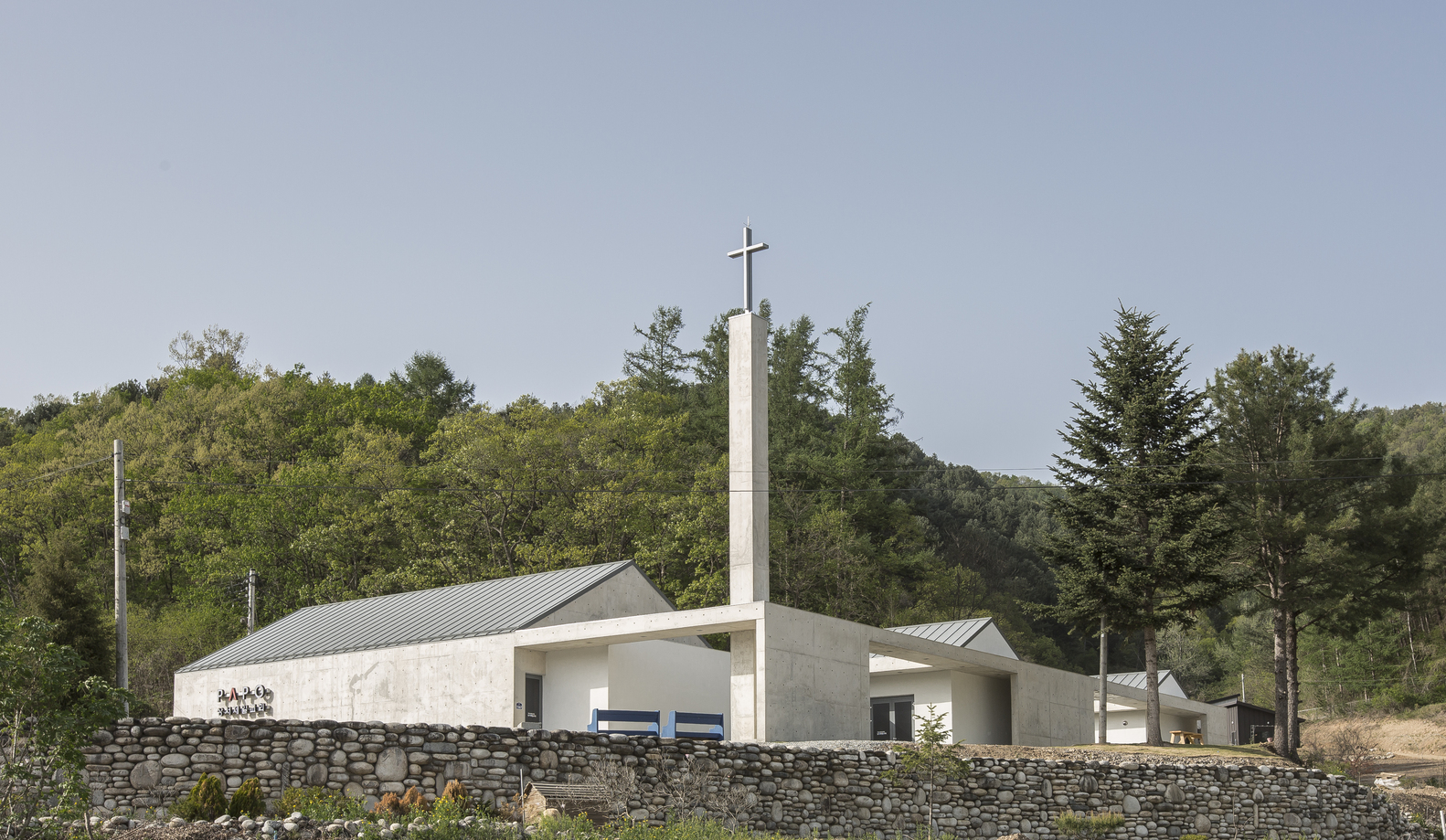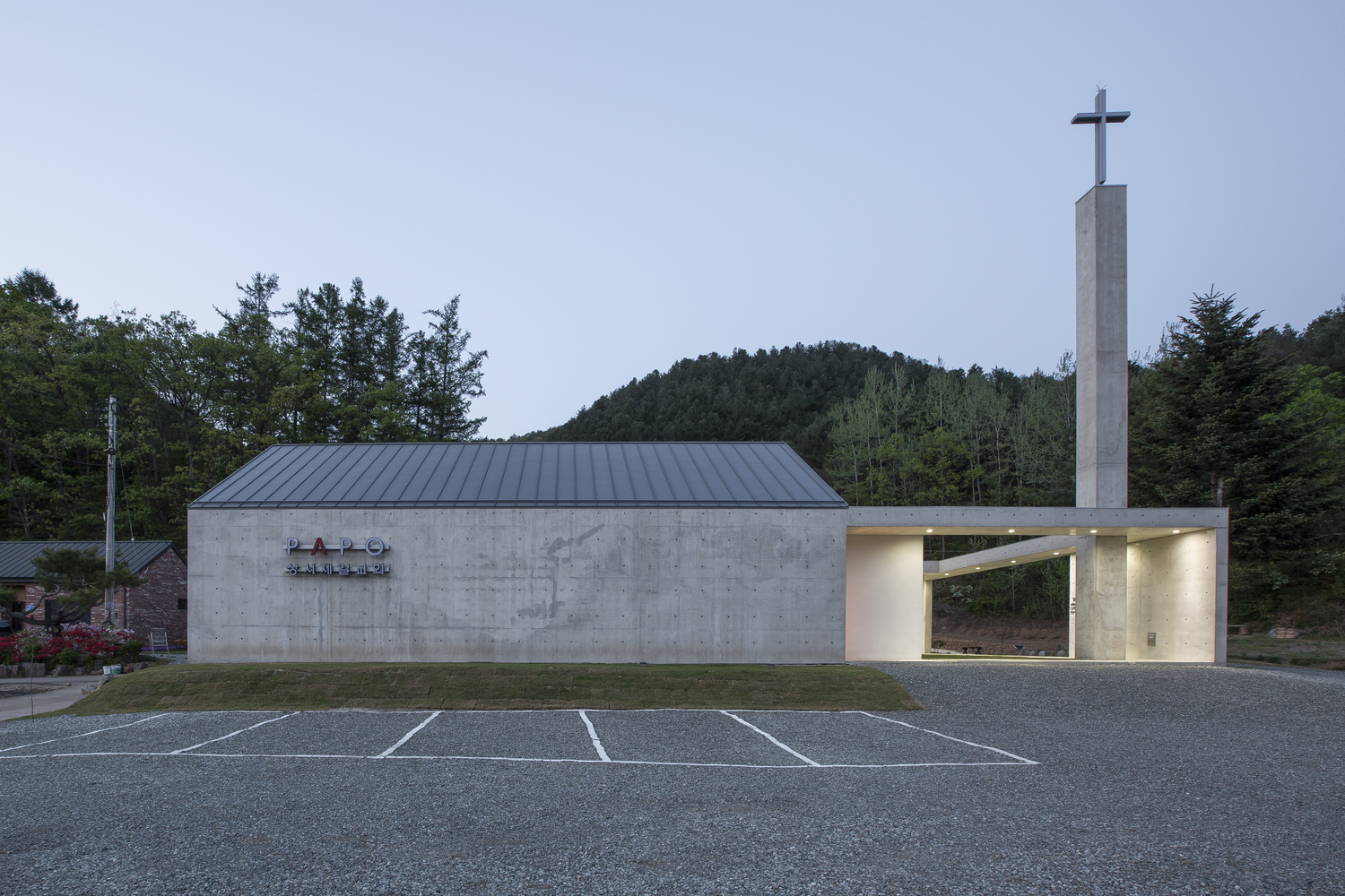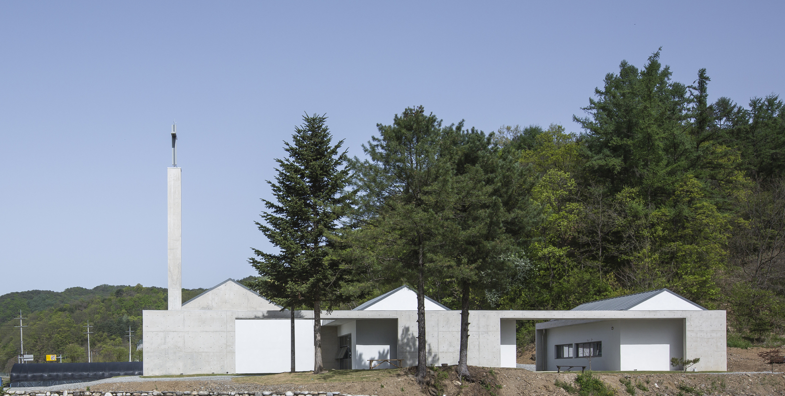 A variety of external spaces, including the front garden, backyard, and courtyard, were inserted between the buildings, enabling a rich experience. The three gable roofs soaring like brothers were surrounded by exposed concrete plates. The concrete plate forming the layer created a sense of depth, and the movement lines were organized. Inner space. The interior is decorated with natural light and made of bricks and exposed concrete. A box filled with light was put in the front of the chapel. A soft light filled in through the low, elongated window on the side.