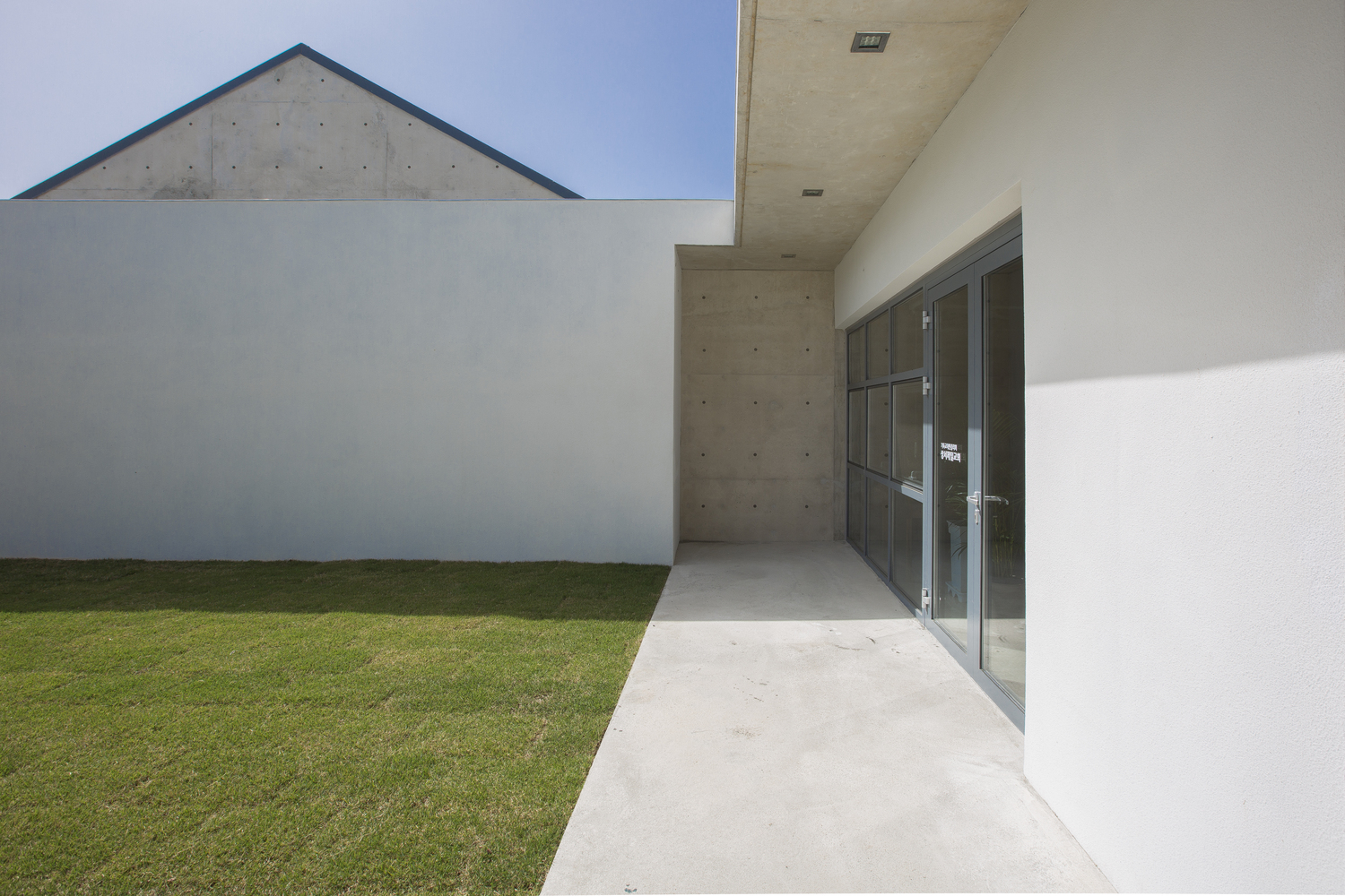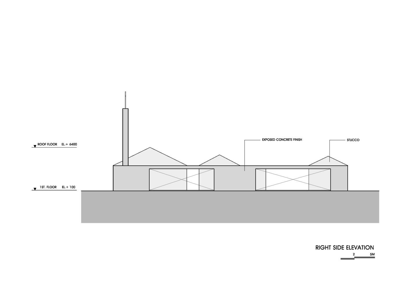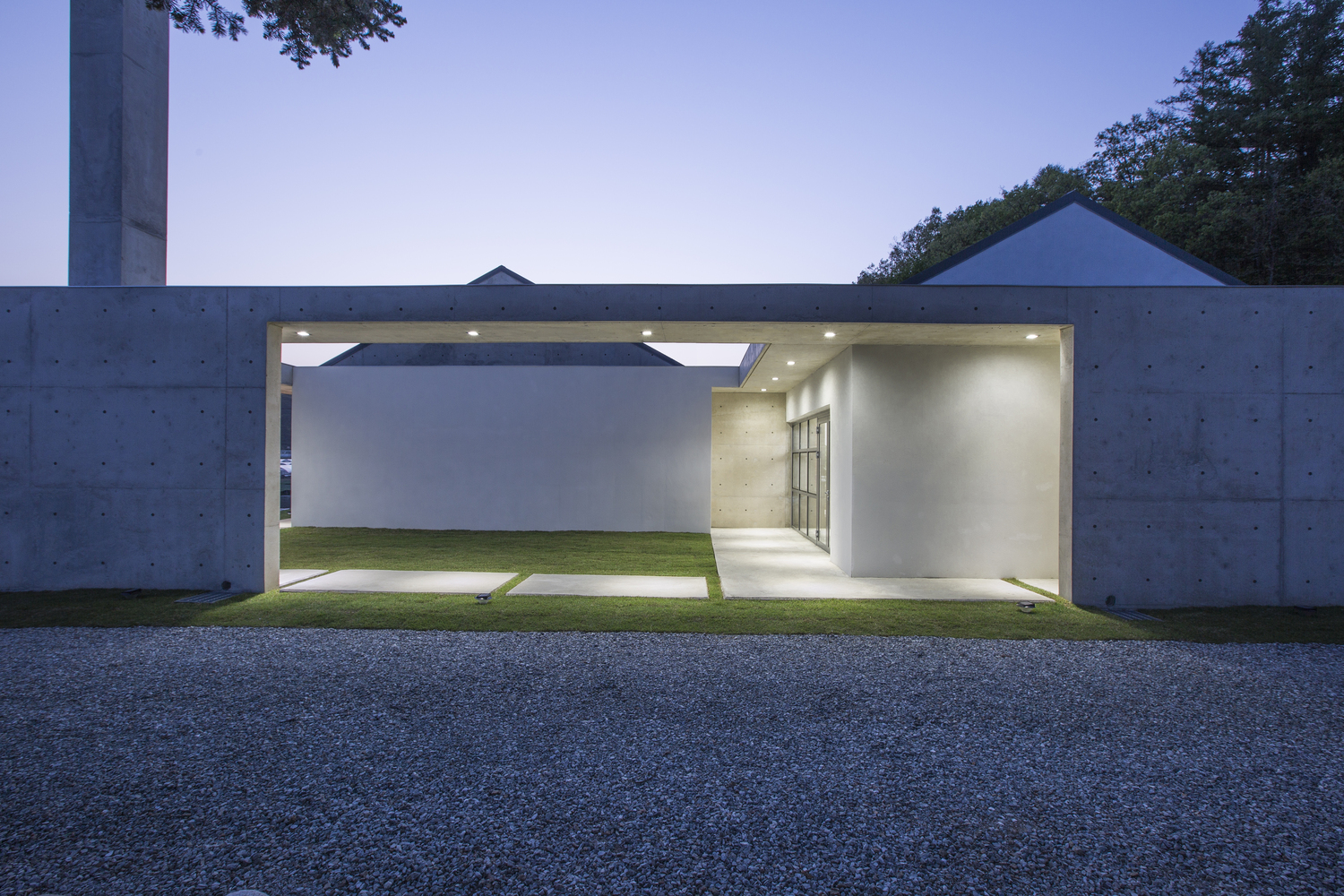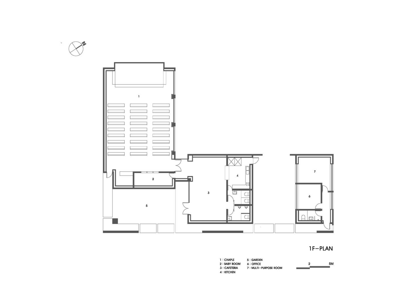 A variety of external spaces, including the front garden, backyard, and courtyard, were inserted between the buildings, enabling a rich experience. The three gable roofs soaring like brothers were surrounded by exposed concrete plates. The concrete plate forming the layer created a sense of depth, and the movement lines were organized. Inner space. The interior is decorated with natural light and made of bricks and exposed concrete. A box filled with light was put in the front of the chapel. A soft light filled in through the low, elongated window on the side.