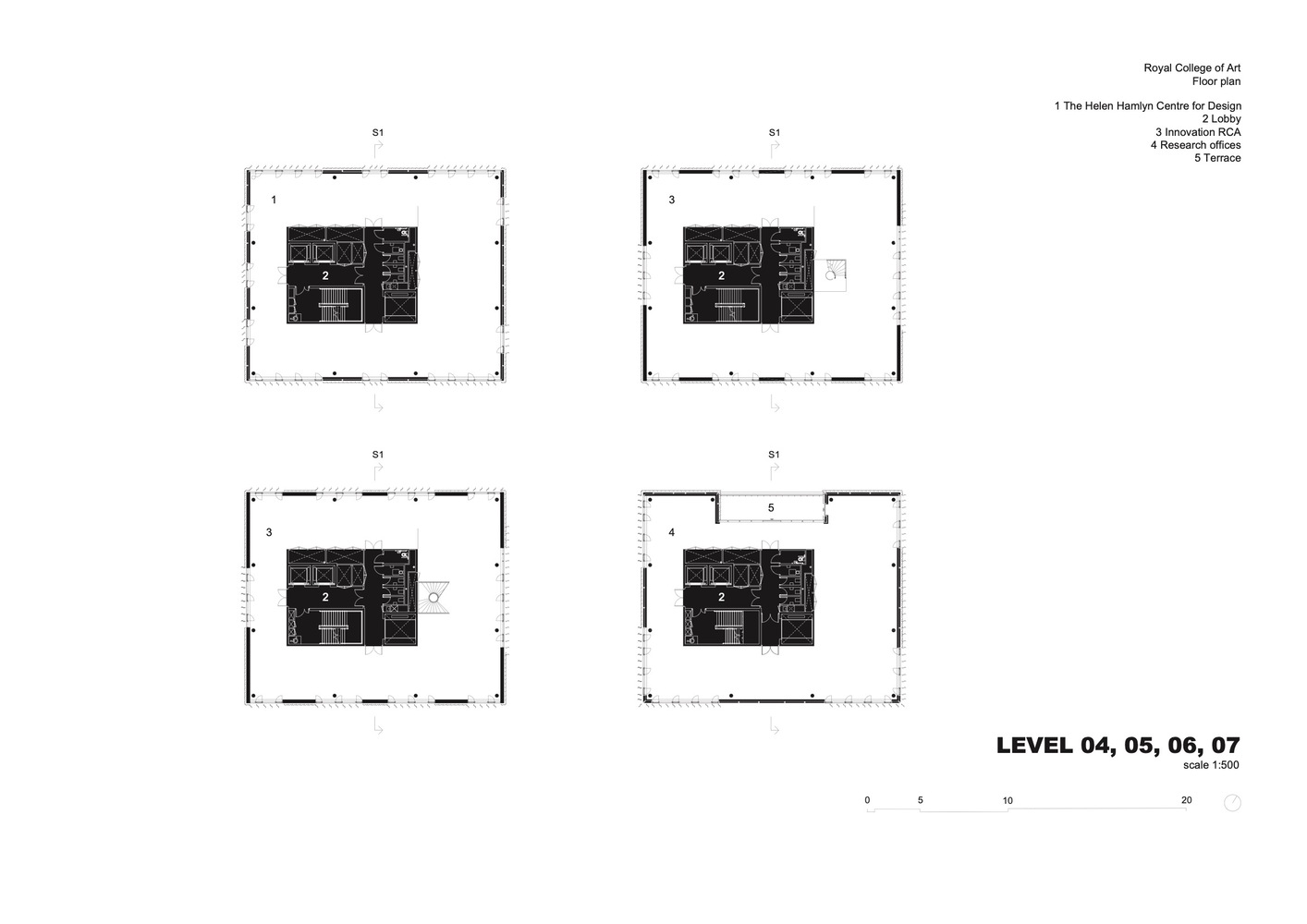 The Research Building is organised above the ground floor workshops as a cubic stack of seven 560 sqm floorplates. Sharing the principles of the studio floors, each space is a flexible research unit equipped with provisional laboratory space. Innovation RCA, the burgeoning post-graduate business incubator, is located on levels 5 & 6. Level 7 contains an event space and terrace with views towards the North and to the rest of the RCA campus.