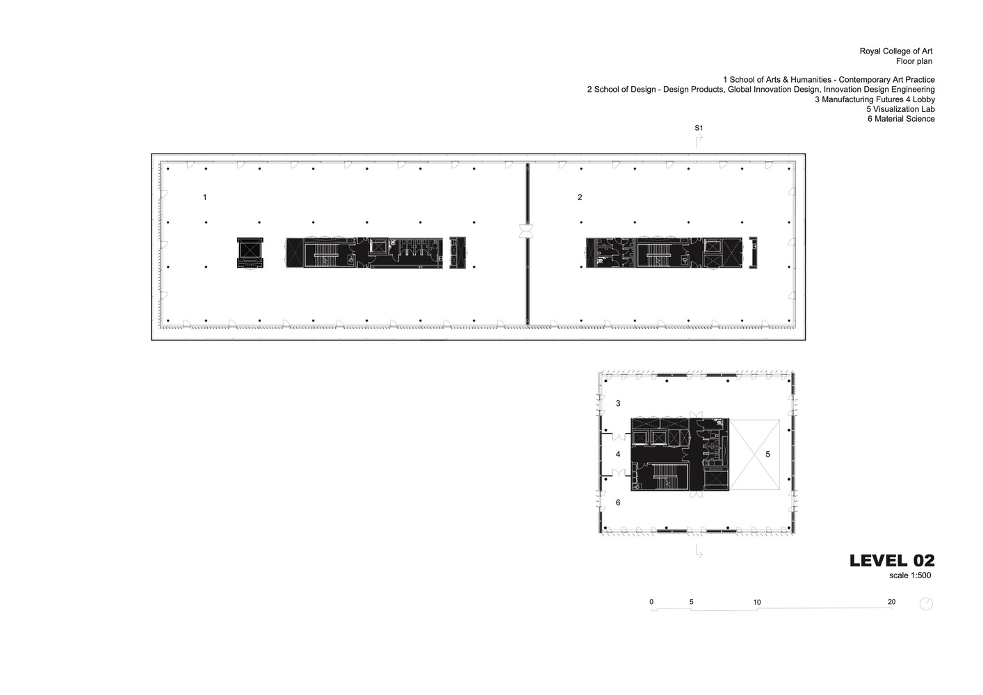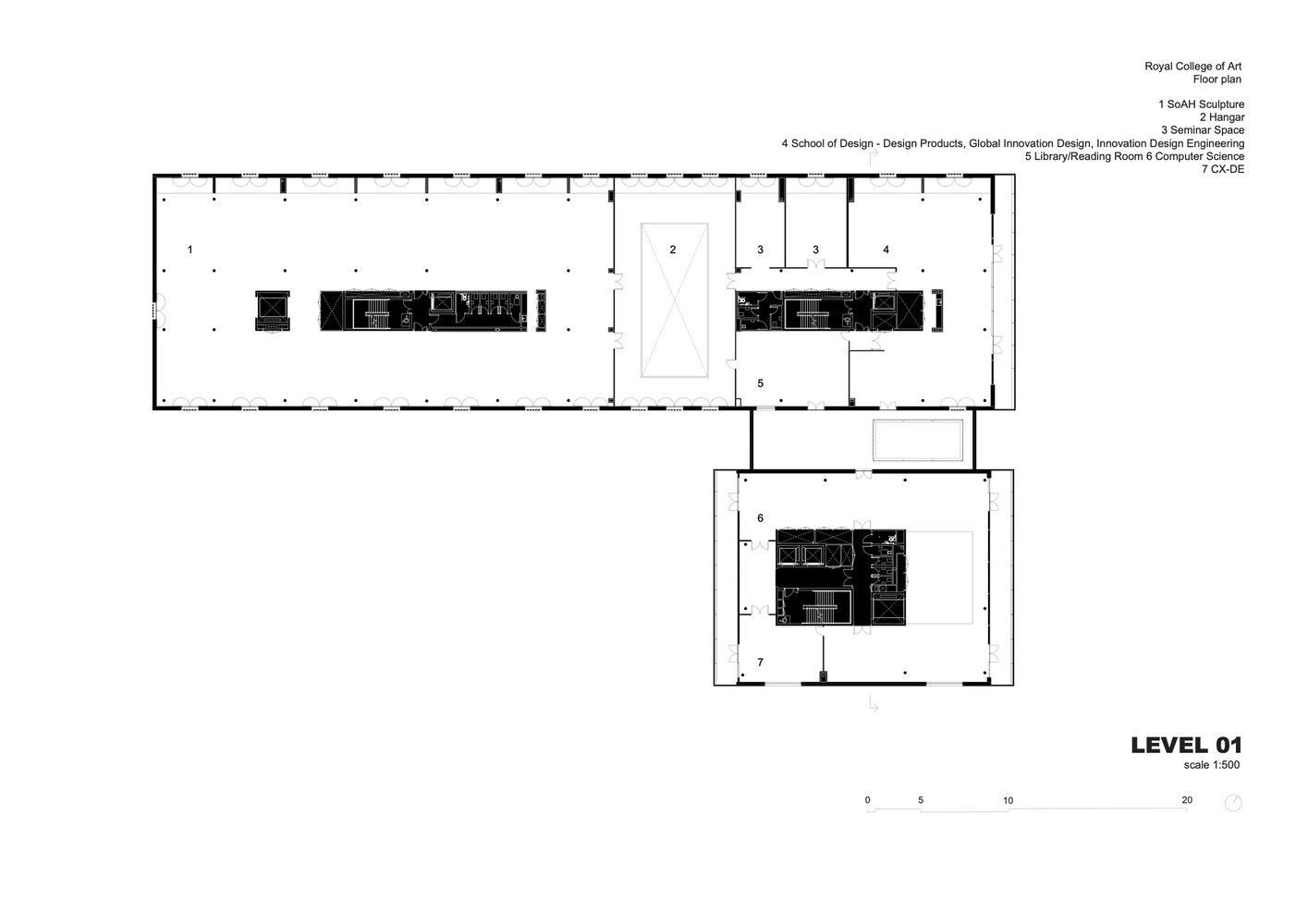 A portion of the previously closed-off Radstock Street is incorporated into the ground floor; upper studio floors span across this space to create a double-height “Hangar” – a flexible zone for the production and display of large-scale work that is also spacious enough to host RCA assemblies and events. This space can also be opened to the public, creating another thoroughfare from Howie Street to the main reception area of campus.