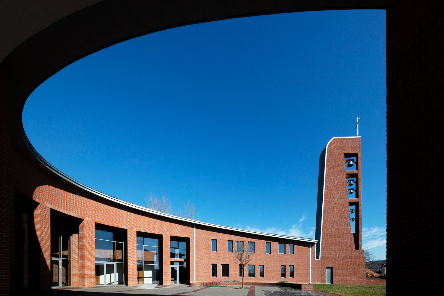 The new church, situated near Budapest, was built in a residential area of the village of Páty. The elliptical building for holding mass embodies constancy in a heterogeneous environment. The design includes more than just religious functions: the liturgical space is surrounded by communal and educational rooms, an event space, guest rooms, a parish lodging, offices, and service rooms, which are arranged in a unified floor plan that also incorporates the garden. The building serves the full spectrum of local community life. Thus, the church has become a venue for concerts, exhibitions, and children's events, and the garden has become one for hospitality and leisure activities.