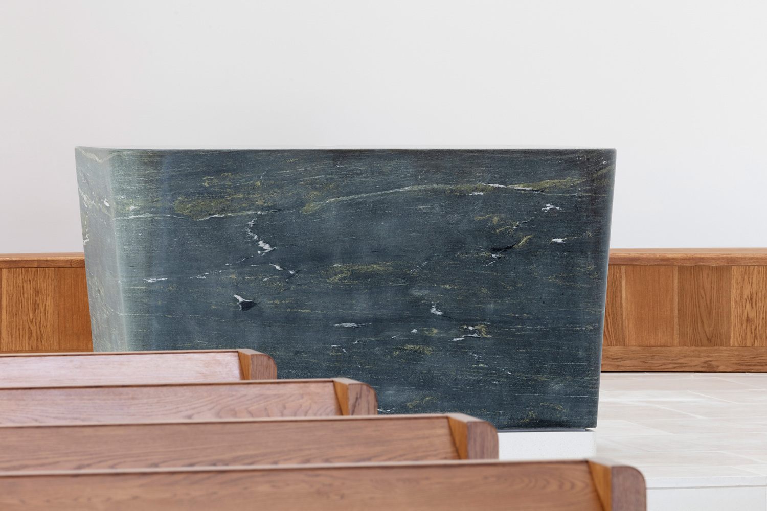 The most prominent element of the church space is the green stone block of the altar. The proximity of the altar, the natural light illuminating the center, and the feeling of homeliness inspire atonement and awe. Regarding construction technology, the most complex part of the building is the reinforced concrete dome, in which the atmosphere of the space is created by diffused and directed lights, emphasizing accents according to the sacral functions.