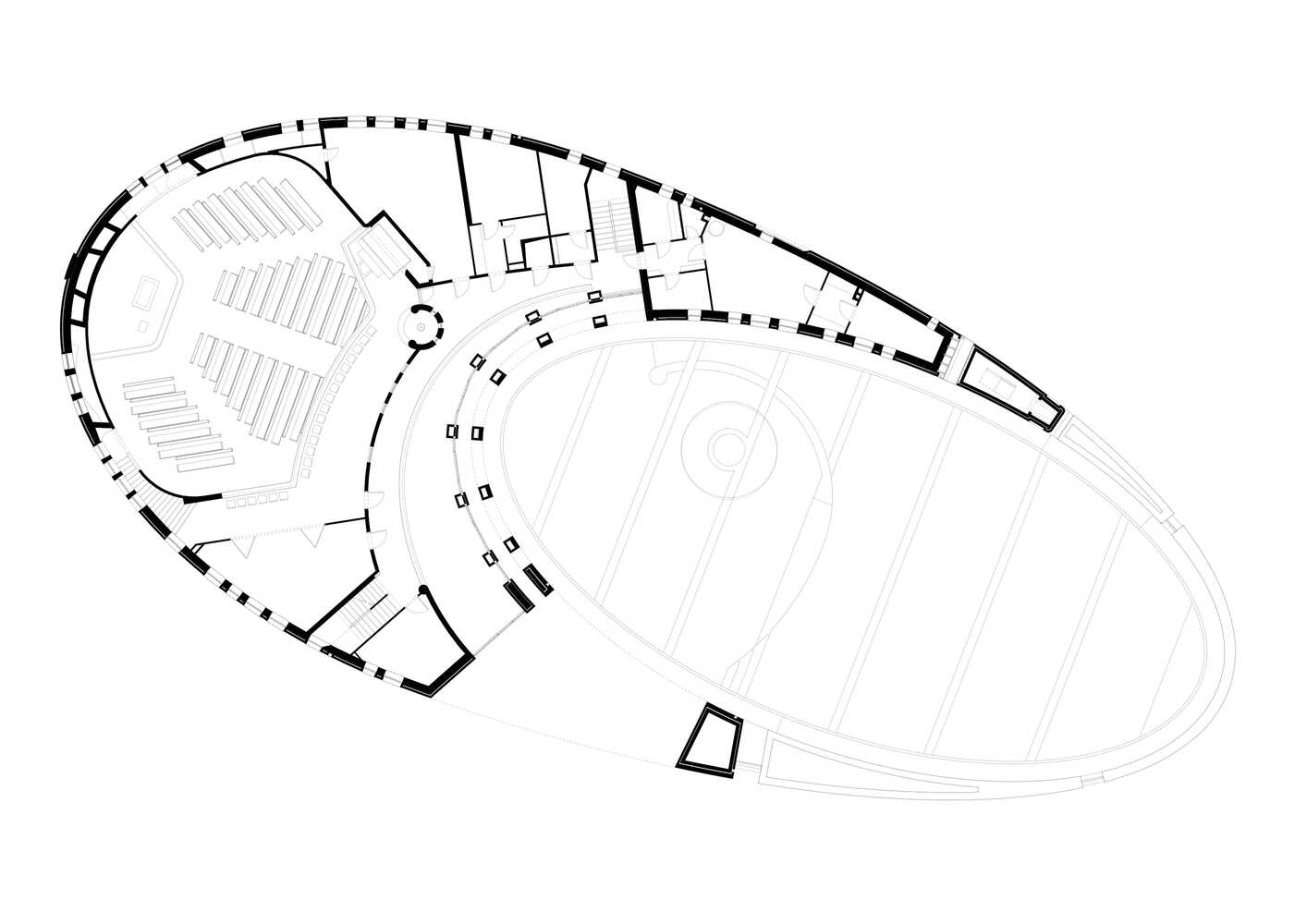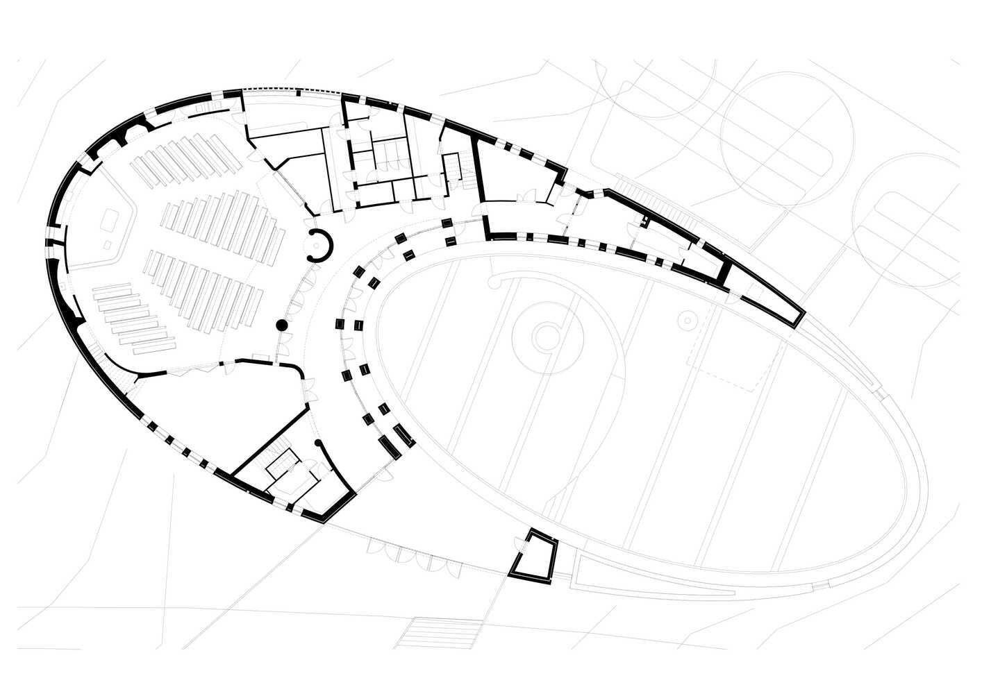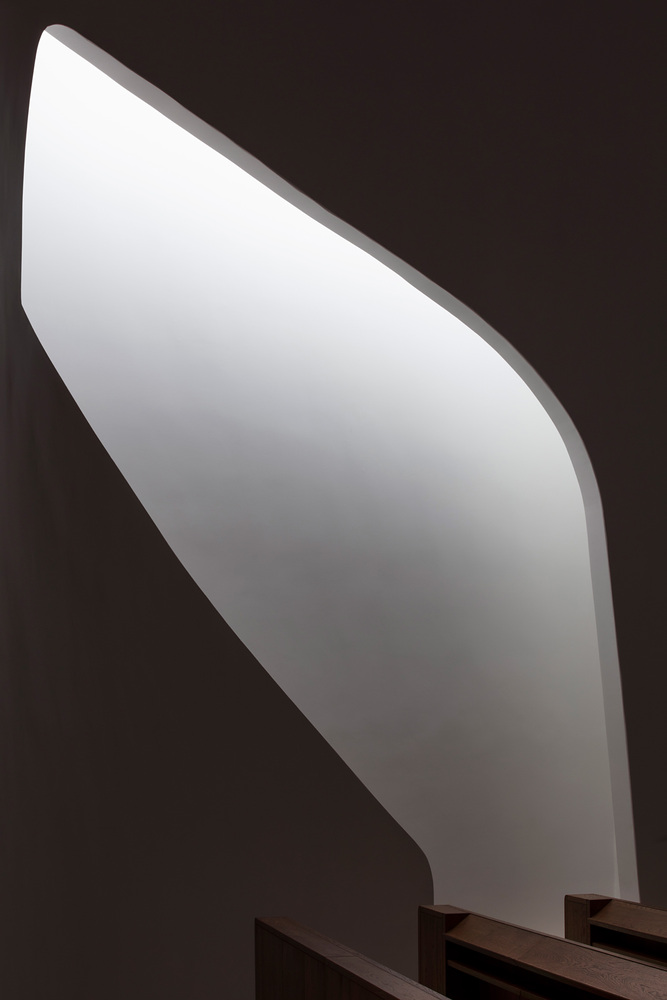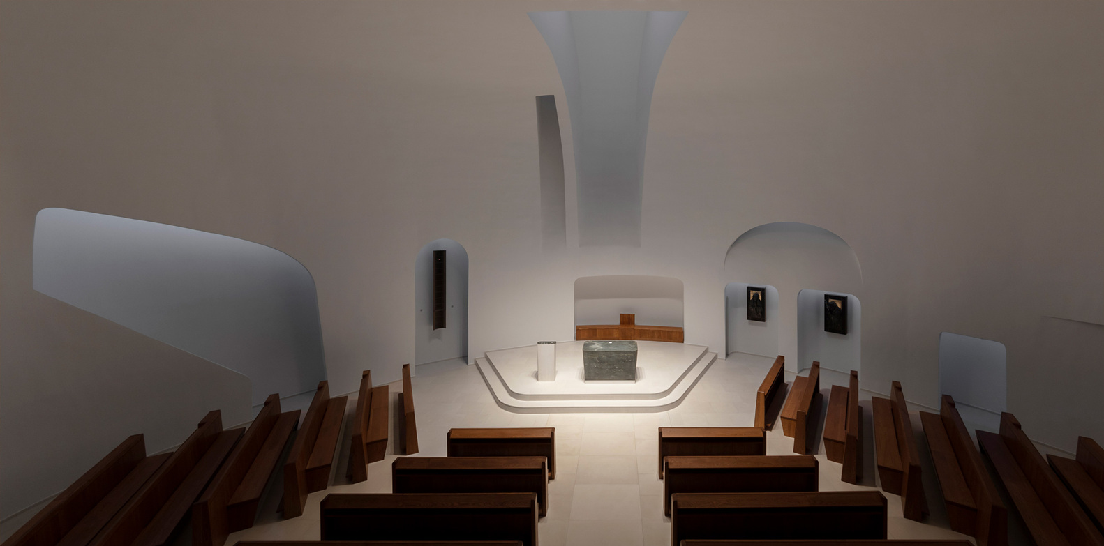 The result is a spatial organization converging towards a center with the main nave losing its focus and appearing as a church garden, while the liturgical space evokes the sanctuary closed by an apse typical of a Baroque church. The traditions of historical church architecture appear in a new formulation: the broken angle of the garden and the church space, that is, of the axes of the main nave and the sanctuary, is a symbol known since the Middle Ages, and a metaphor for the broken body.