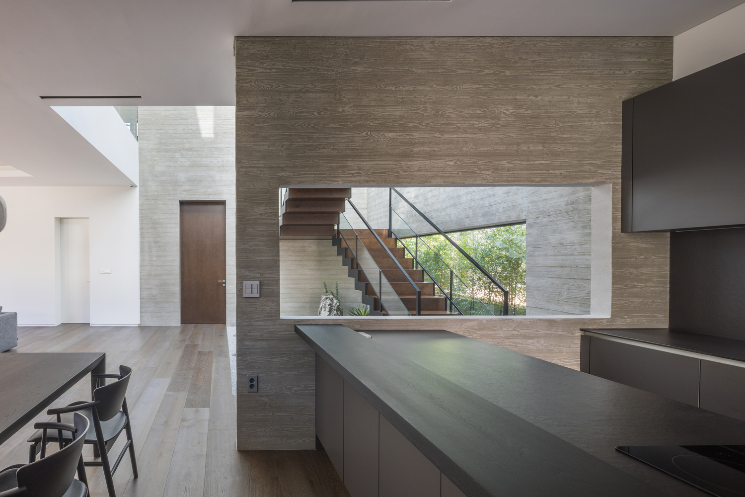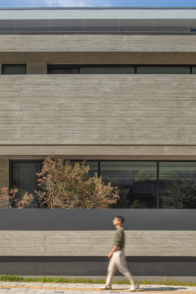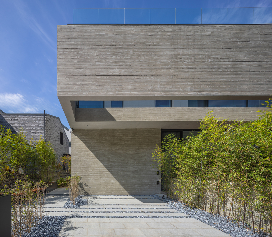 The exterior of the house was designed to embody sculptural feeling which strongly shows the inherent gradation of materials based on exposed concrete by which it is possible to get a sense of the flow of time through a change in the surface thereof. The pattern of the exposed concrete was separated into the pine plate design pattern and plain design pattern and thus it gives a feeling as if two different masses are entwined. Wing walls (exposed concrete) installed on the 1st floor and 2nd floor itself become compelling design elements of the house and at the same time are important devices protecting the privacy of the client. The exposed concrete wall body perceptually spanning when looking at the outside from the inside enables the viewer to have good tension and at the same time to have a psychologically stable feeling as if the viewer is protected from the outside.