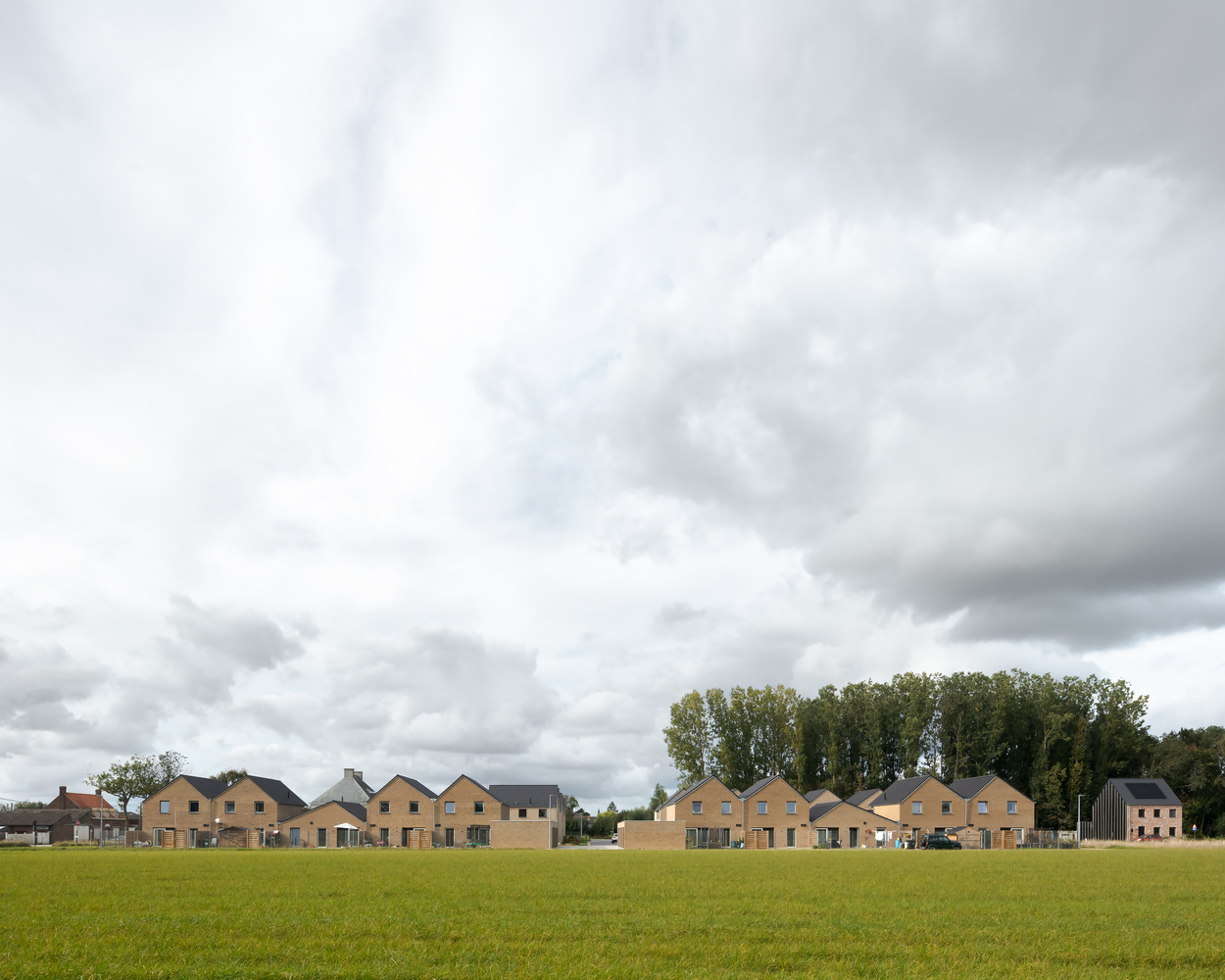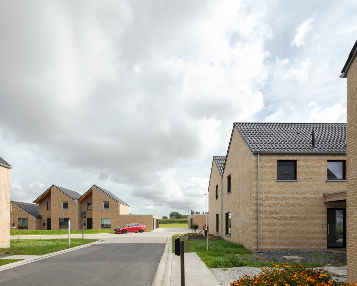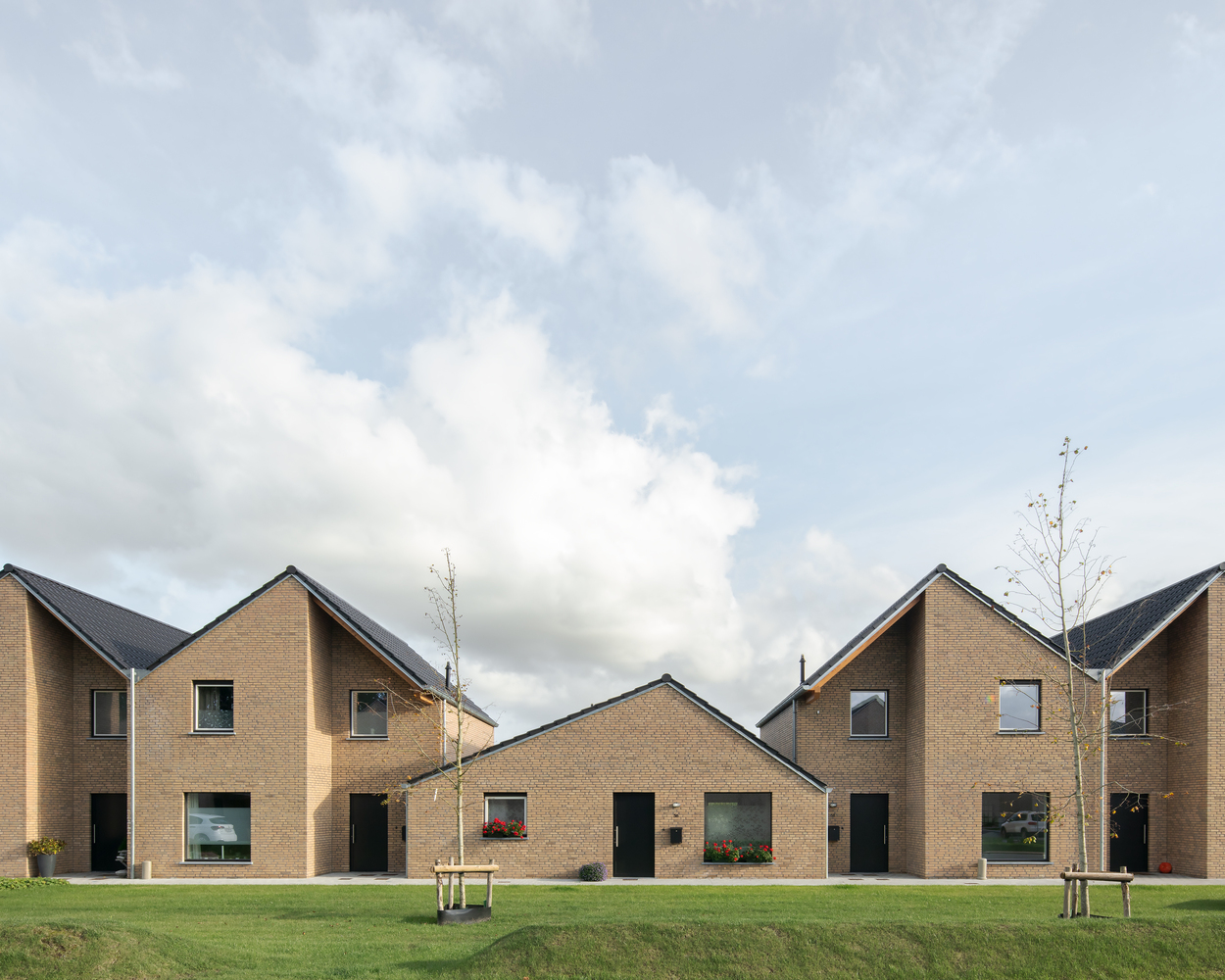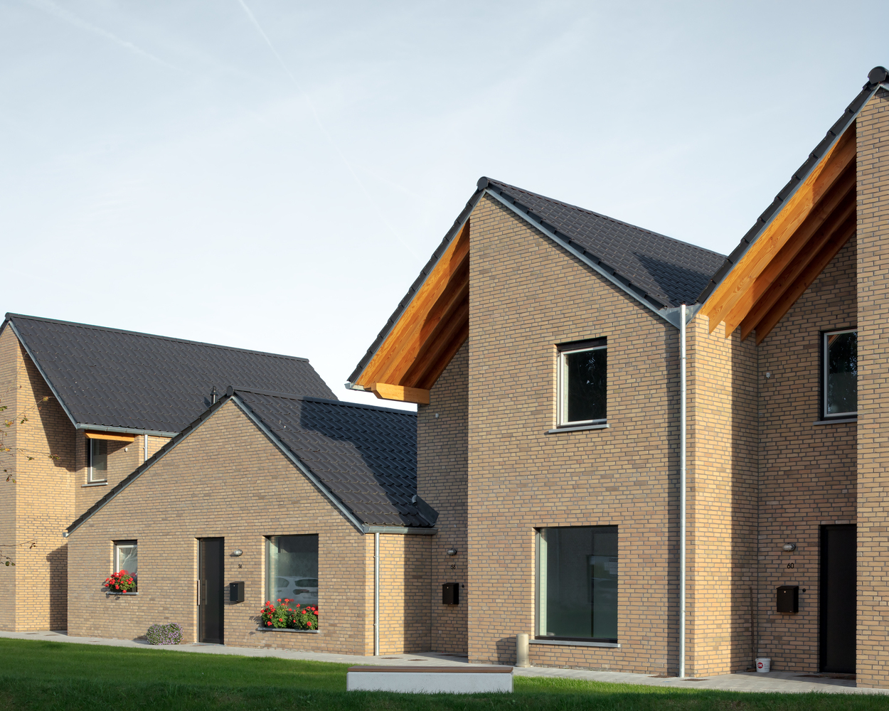 For a new social residential area in Oost-Vleteren, we designed high-quality housing, with a focus on the spatial layout of the plan, a dynamic roof landscape, and an uncommon detailing. The architecture of the connected houses is surprising and offers each house its own identity, a clearly readable entrance zone, and is composed out of a varied and daring material pallet.
