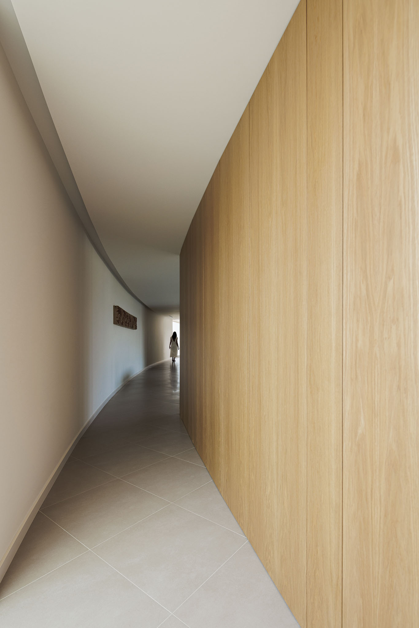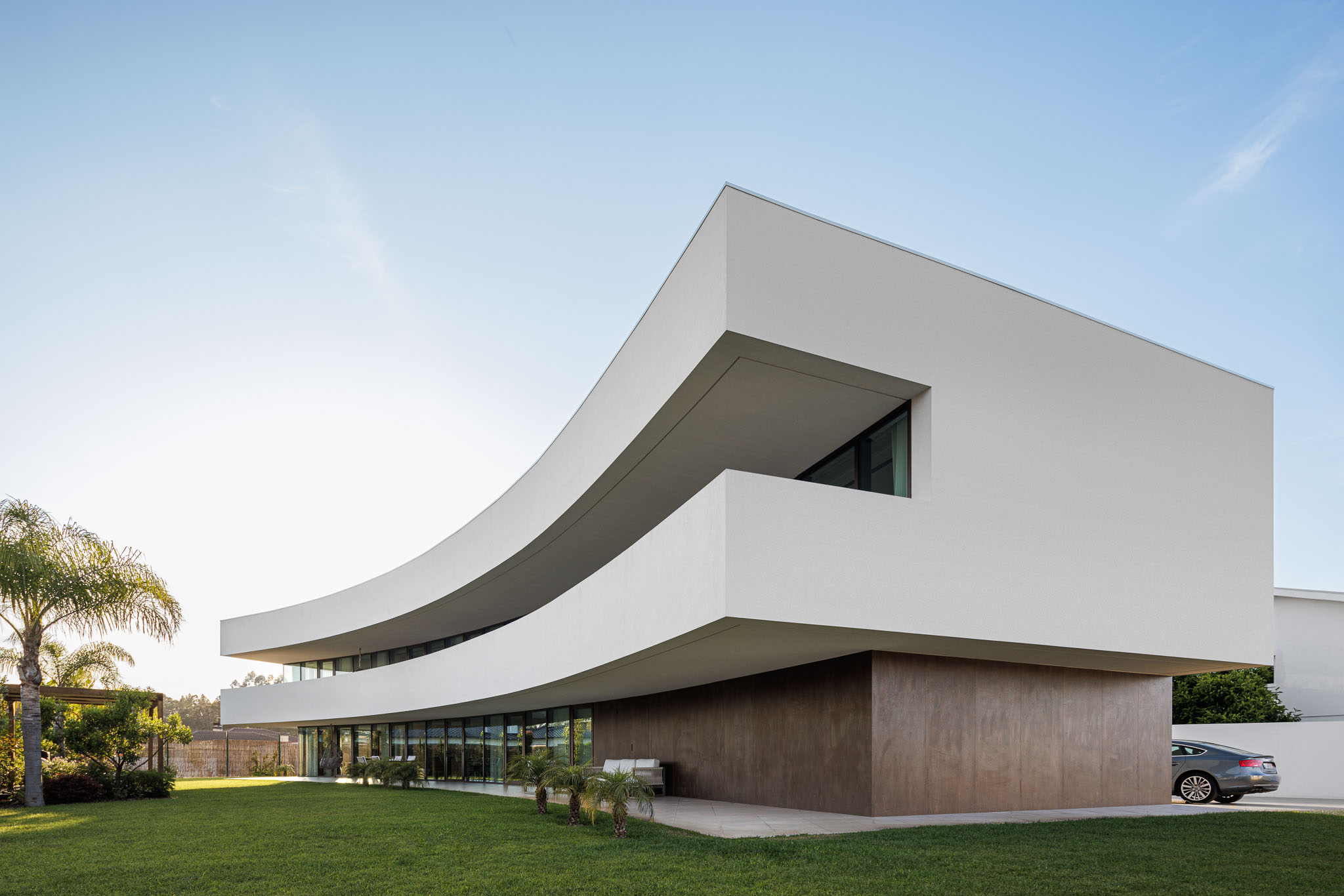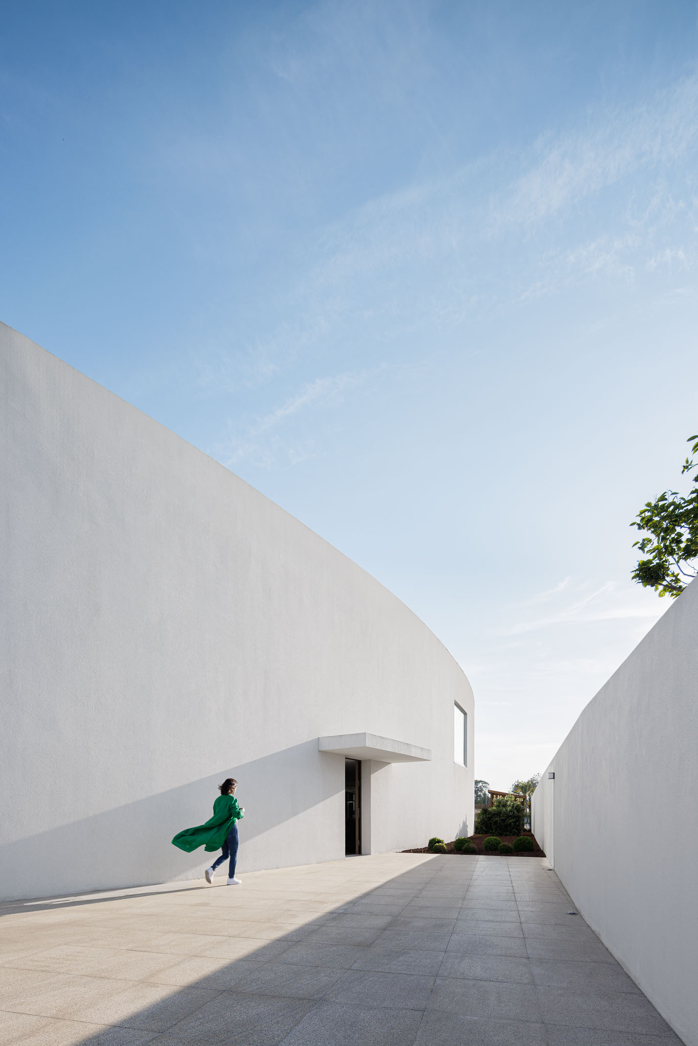 Since it is designed for a residential use, the architectural piece is materialized in a uniform body which, through its shape and arrangement, protects itself from the busy road.