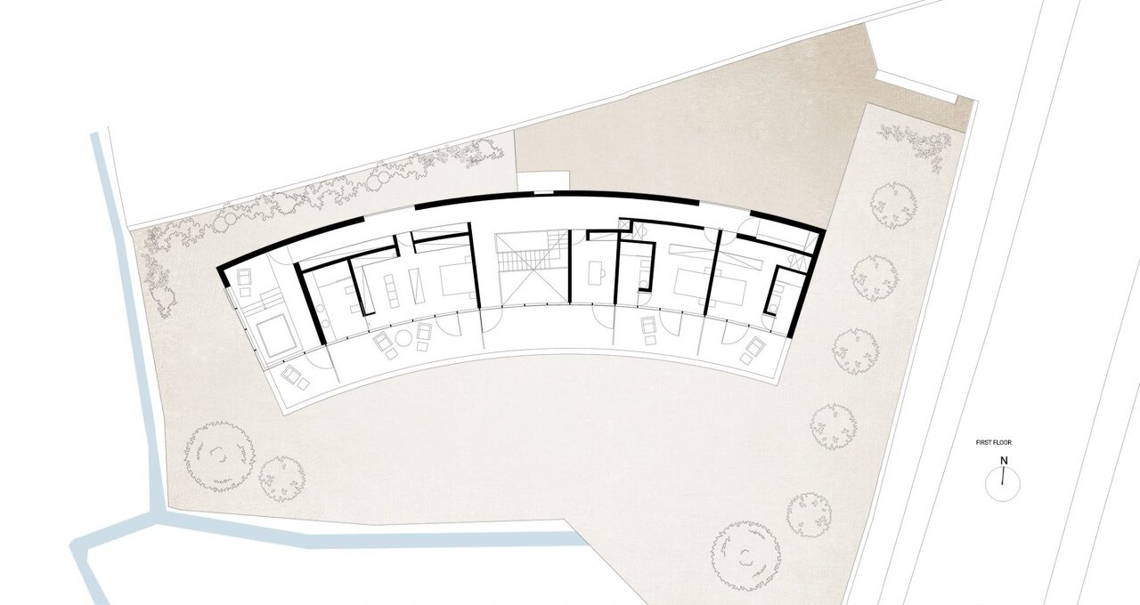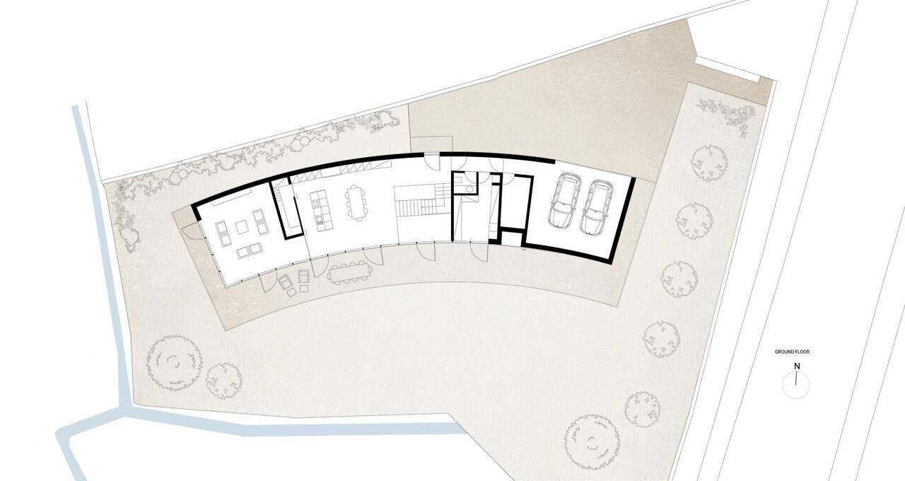 The building, with its curved shape, ensures adequate protection from the wind at the porch, while certifying a greater depth of the private yard on the house axis.