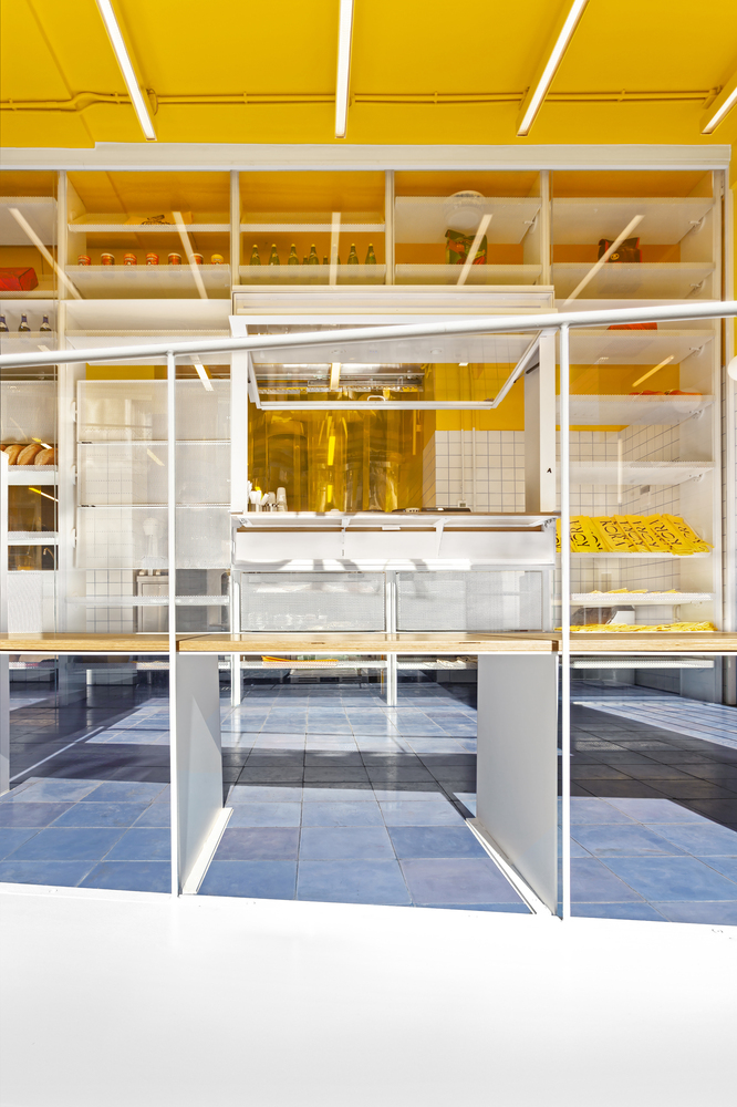 When horizontal they provide the maximum transparency by acting as a functional surface for display, ready to accommodate a great variety of baked goods. Finally, the 45-degree angle allows for partial views of the background as well as an ideal product display for the visibility of customers. Through the addition and sale of different goods, the kinetic wall is thus always changing in its outer appearance. It simultaneously acts as a shutter, boundary towards the outside, aperture to the spectacle of baking, and a mechanism for displaying baked products along with different scenarios.