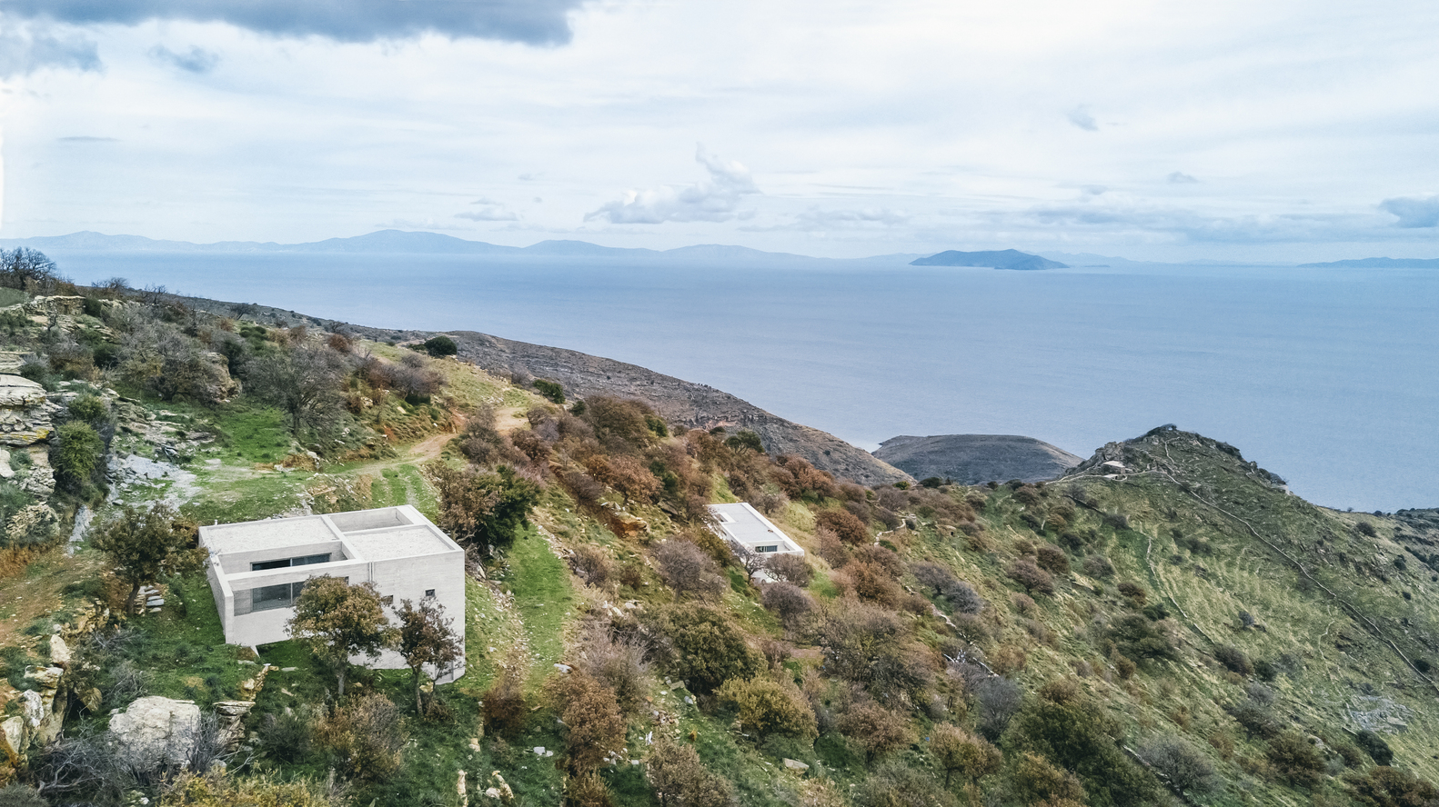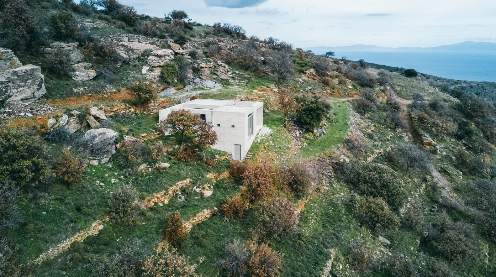 The house - placed diagonal to the slope of the topography - is organized as a subdivided square with alternating enclosed and open spaces. Windows and structural elements create cinematic frames of the surrounding landscape, the Aegean Sea, and neighboring islands. Due to the steep topography, the backside of the house is submerged within the landscape, while its front is oriented towards the main view. The house is thus protected from harsh climatic conditions, such as high temperatures and strong winds. All support functions of the house, such as bathrooms and the kitchen, are placed towards the backside allowing for unobstructed movement and views within the house and towards the landscape.