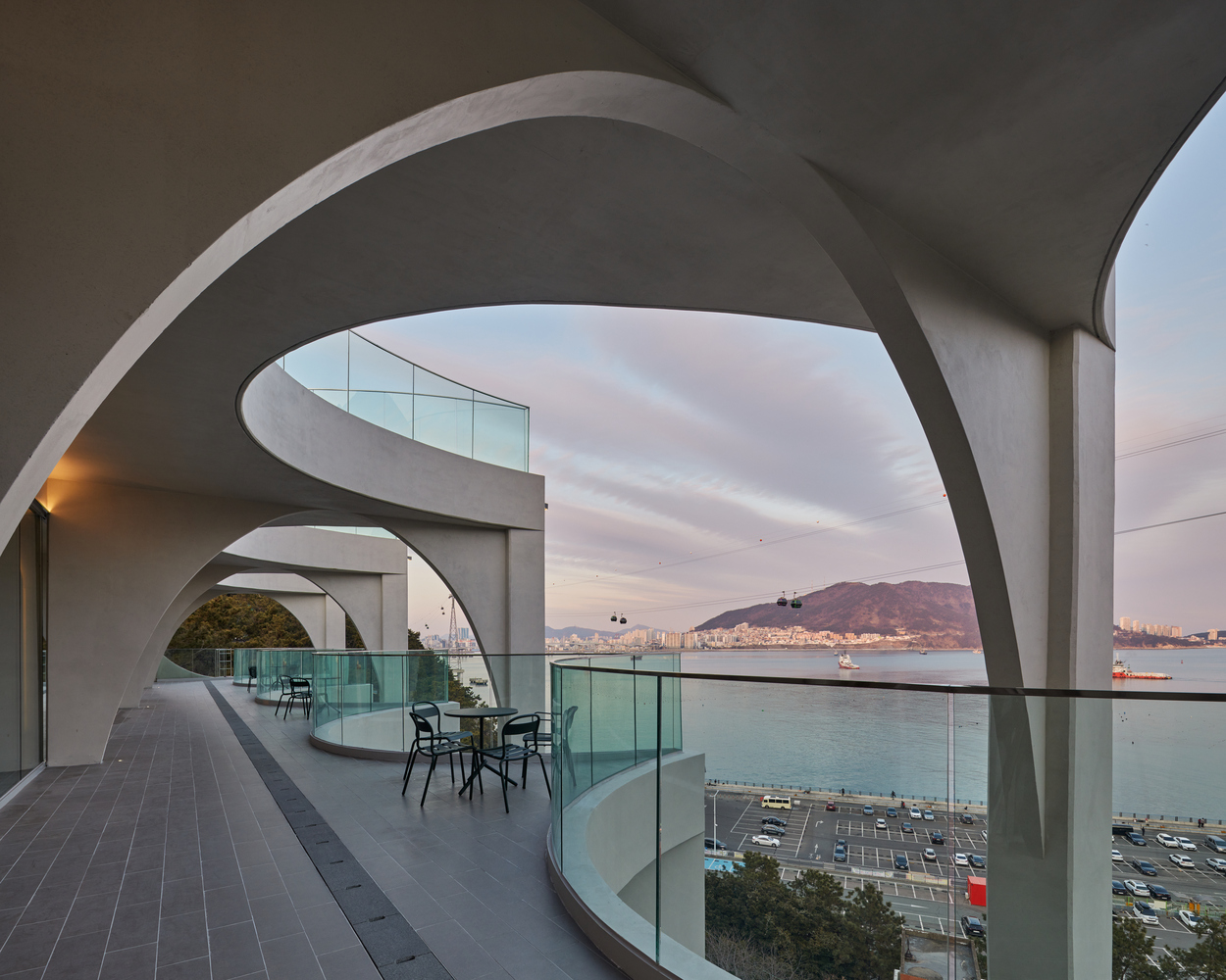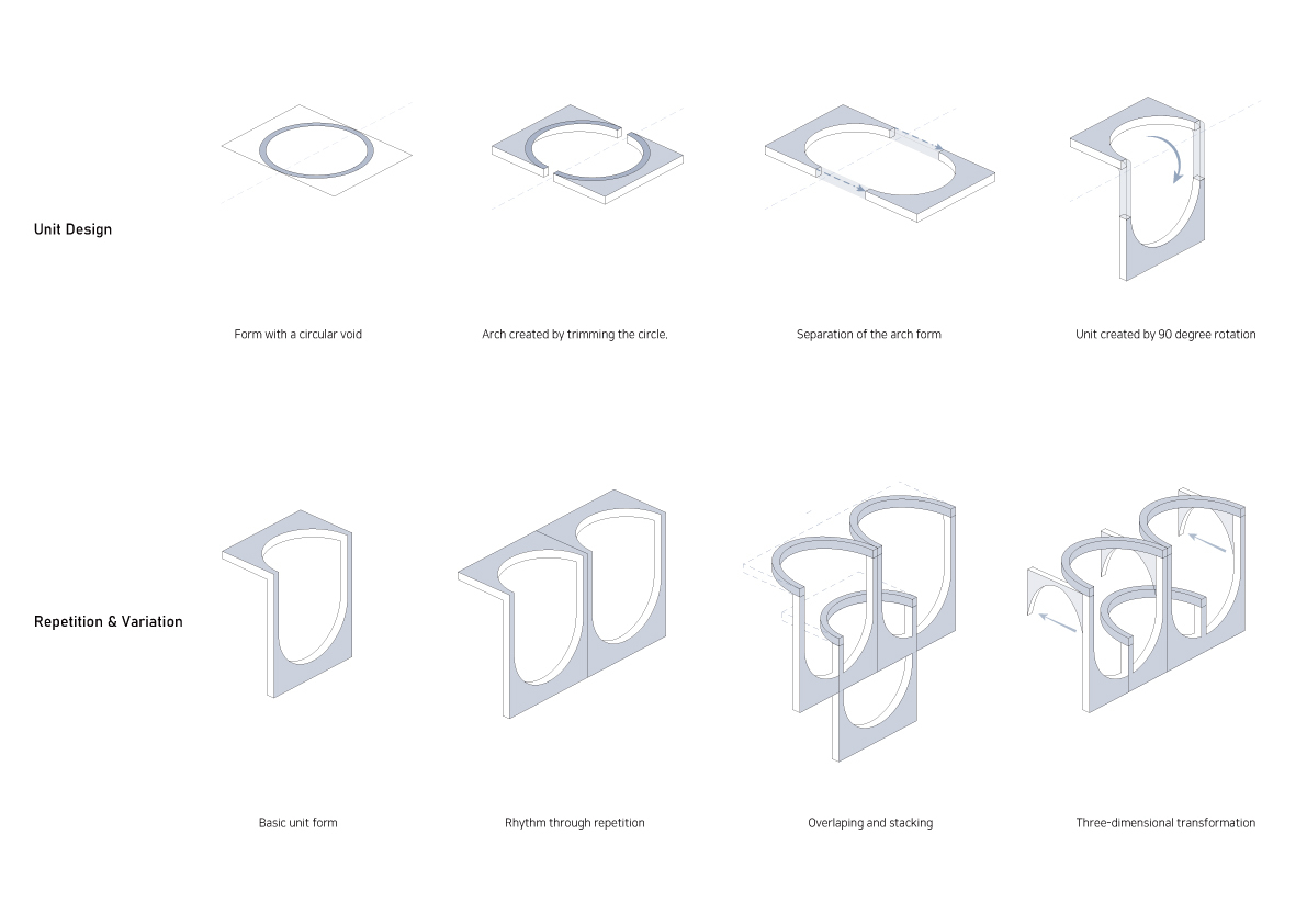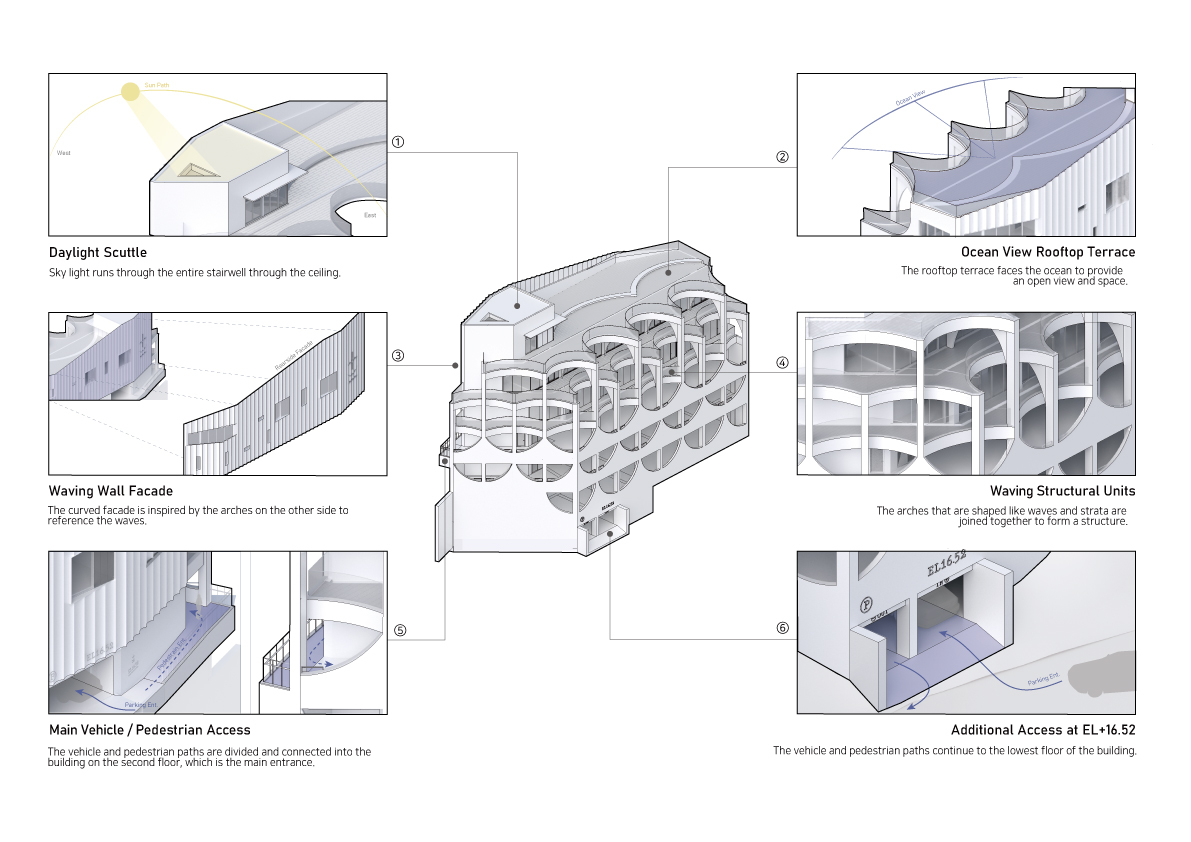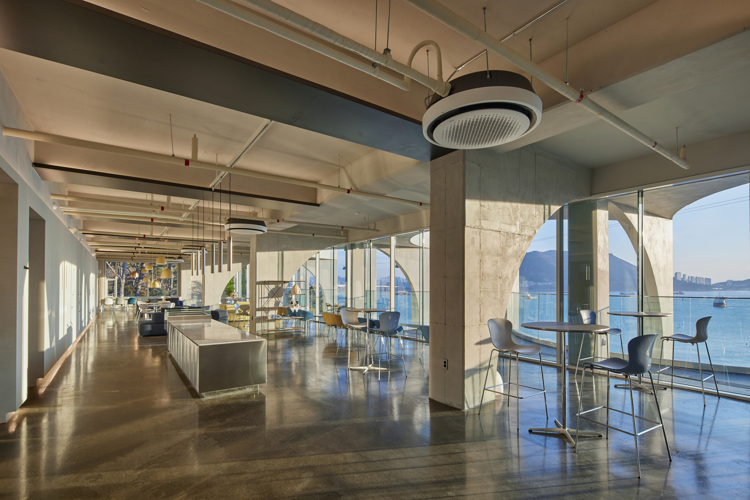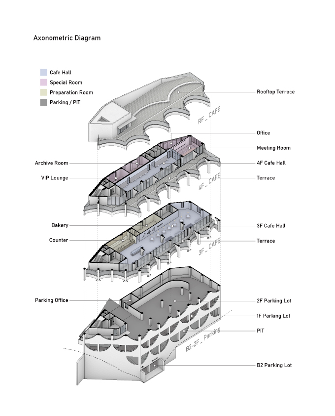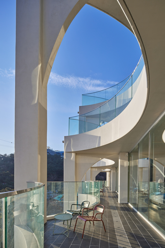Configuration and repetition of arches. The basic form of building space is a semicircular arch. The circular structure is cut in half to form an arch frame, and then structurally coupled and repeated. The semicircular arch is the starting point of the construction logic and an important external and structural element that creates the overall architectural rhythm. This wave-like structure is woven into structural pillars of about 10m, the height of the third and fourth floors, and forms a three-dimensional structure. The repetition of horizontally unfolding waves meets the vertical waves geometrically, and the manifold combination method is repeated to complete the construction system. The terrace is formed at the point where the horizontal wave meets the vertical pillar to form a maximized sense of space. In considering the realm of construction, exposed concrete was used for the facade to create a voluminous continuation for the interior and exterior finishes of the building.