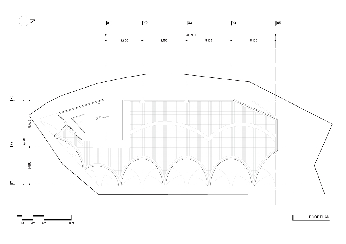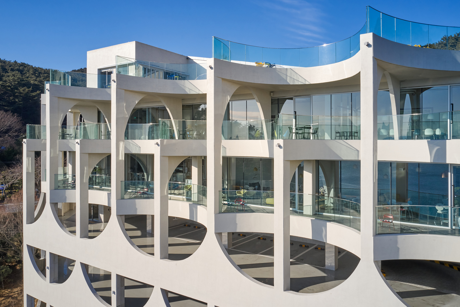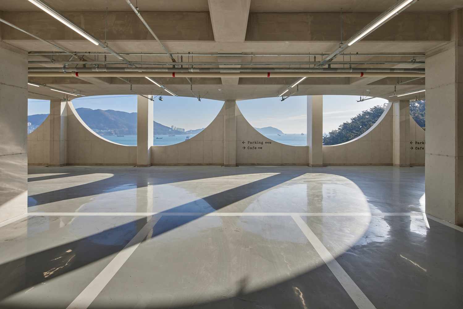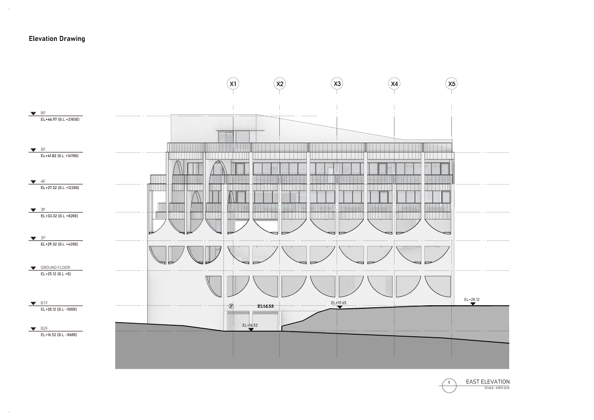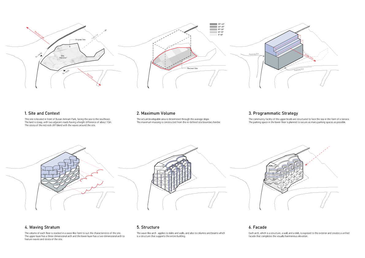 Configuration and repetition of arches. The basic form of building space is a semicircular arch. The circular structure is cut in half to form an arch frame, and then structurally coupled and repeated. The semicircular arch is the starting point of the construction logic and an important external and structural element that creates the overall architectural rhythm. This wave-like structure is woven into structural pillars of about 10m, the height of the third and fourth floors, and forms a three-dimensional structure. The repetition of horizontally unfolding waves meets the vertical waves geometrically, and the manifold combination method is repeated to complete the construction system. The terrace is formed at the point where the horizontal wave meets the vertical pillar to form a maximized sense of space. In considering the realm of construction, exposed concrete was used for the facade to create a voluminous continuation for the interior and exterior finishes of the building.