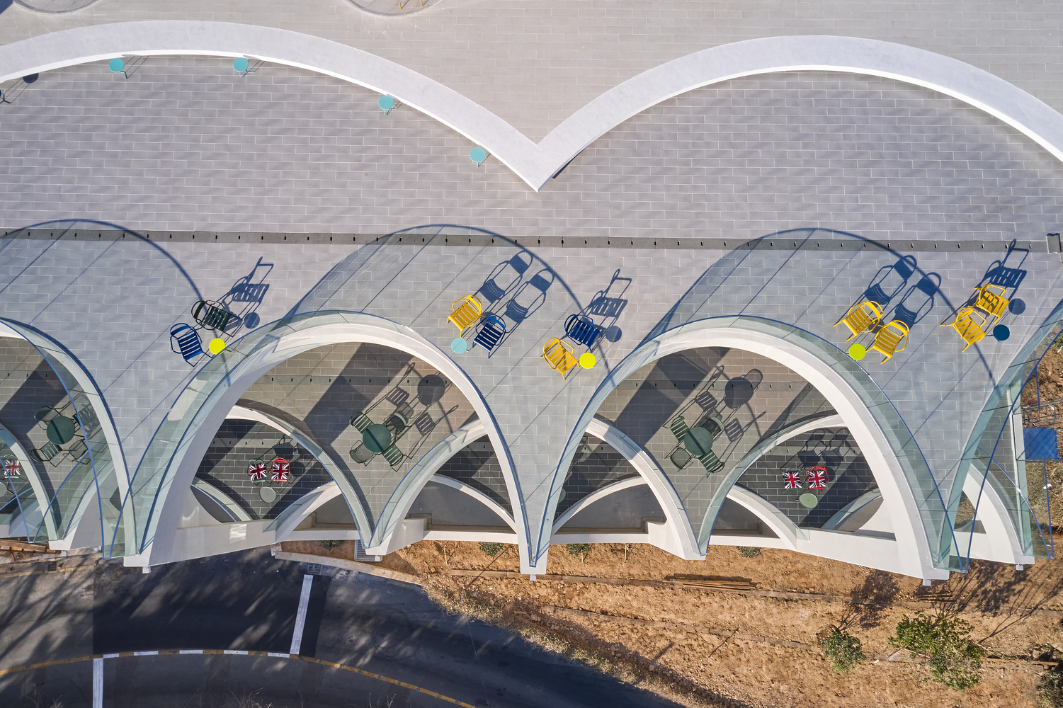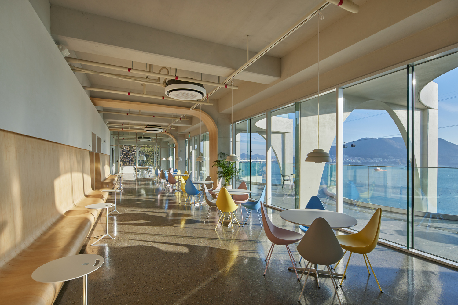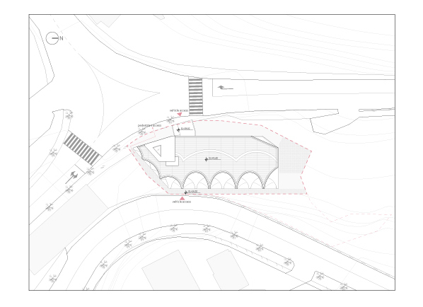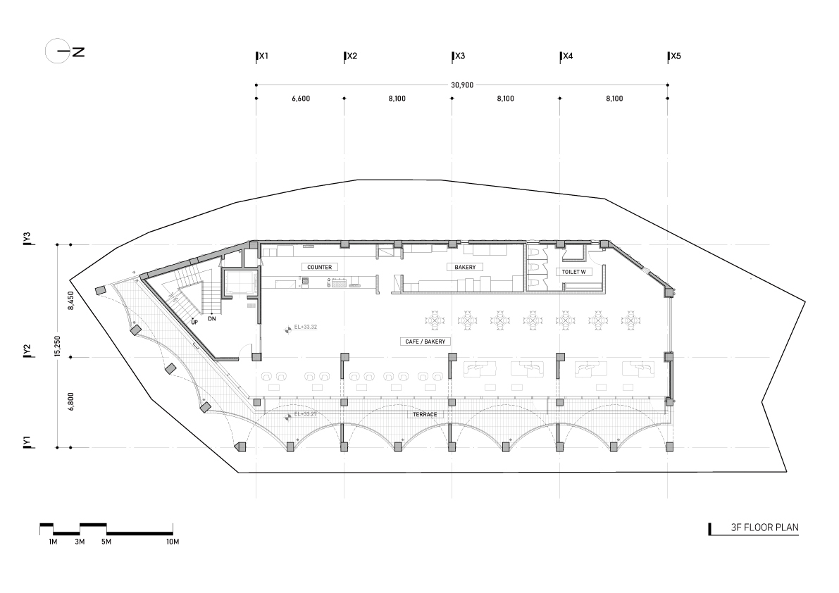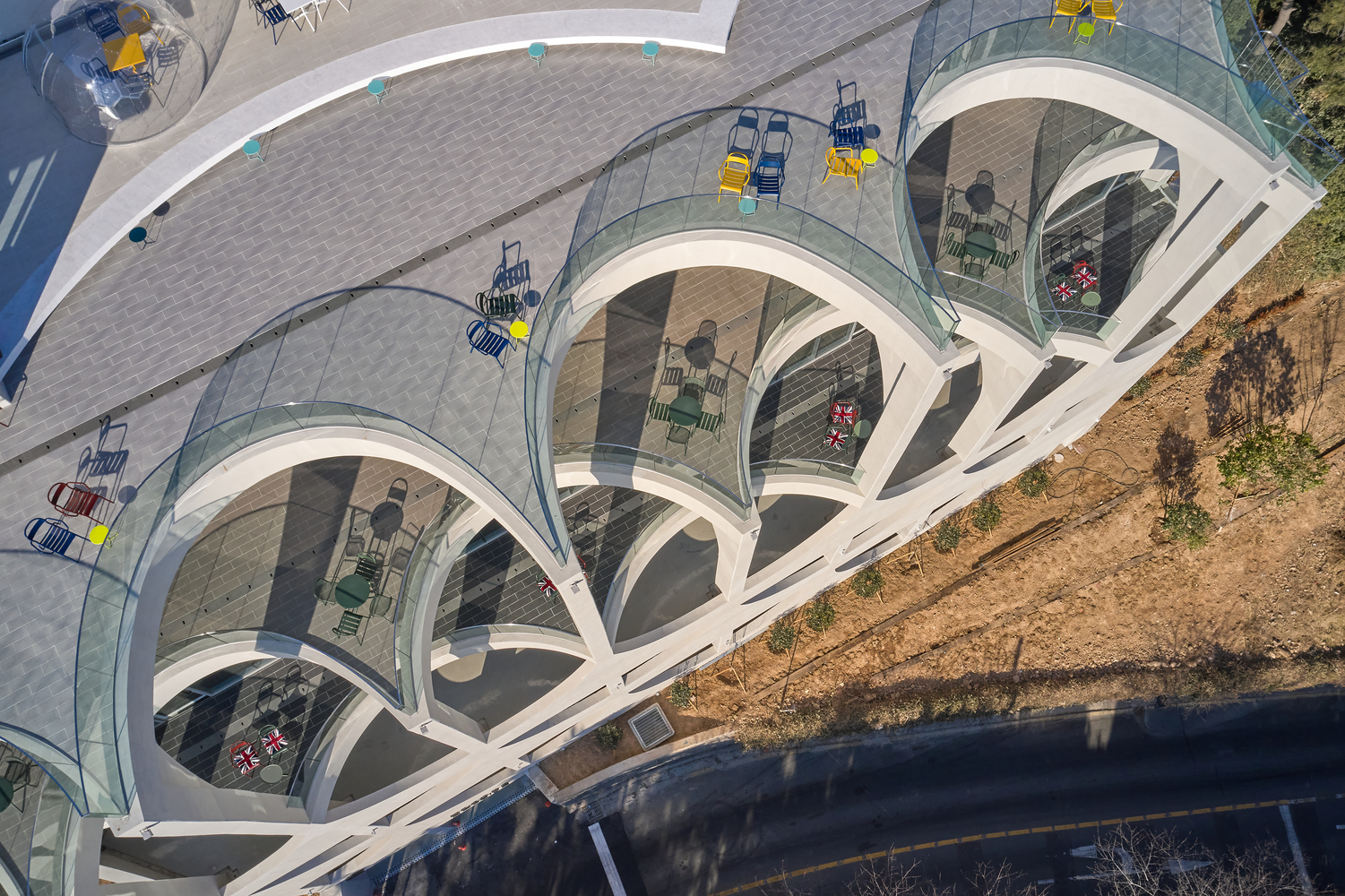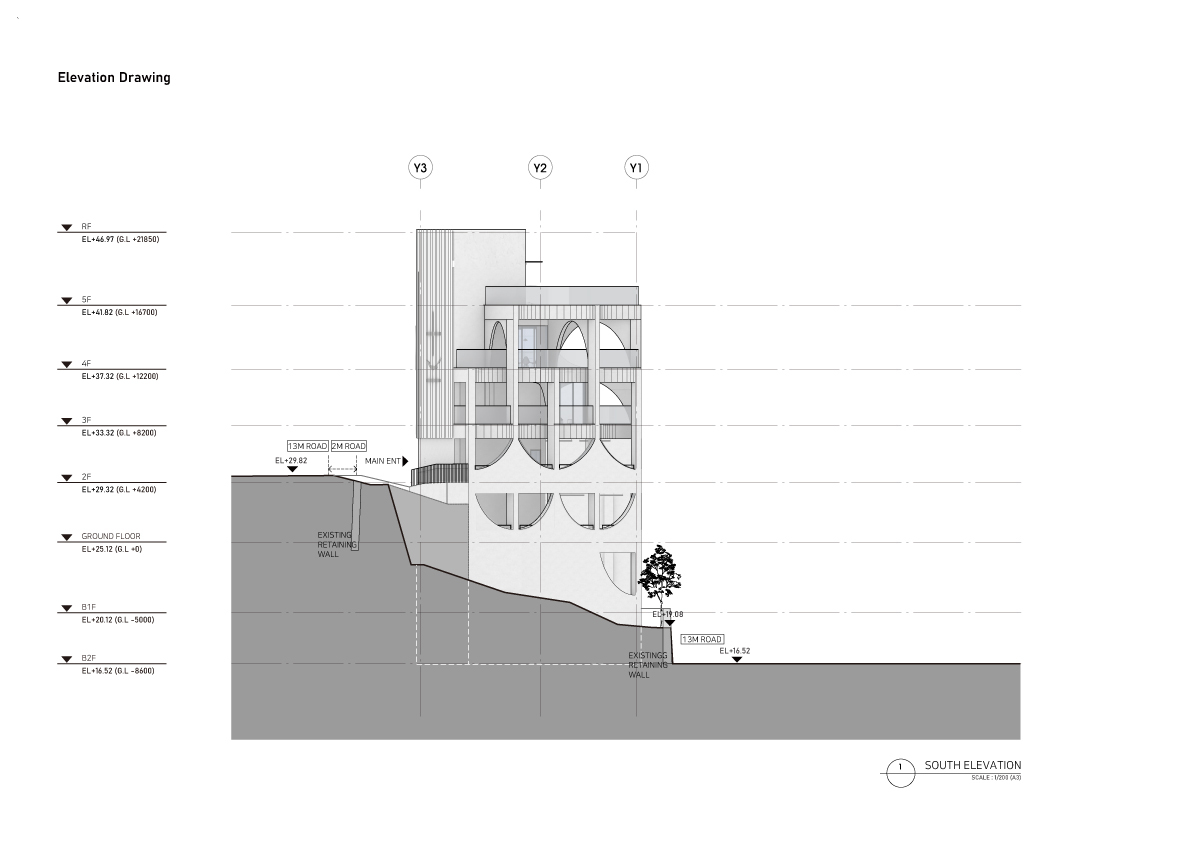 Configuration and repetition of arches. The basic form of building space is a semicircular arch. The circular structure is cut in half to form an arch frame, and then structurally coupled and repeated. The semicircular arch is the starting point of the construction logic and an important external and structural element that creates the overall architectural rhythm. This wave-like structure is woven into structural pillars of about 10m, the height of the third and fourth floors, and forms a three-dimensional structure. The repetition of horizontally unfolding waves meets the vertical waves geometrically, and the manifold combination method is repeated to complete the construction system. The terrace is formed at the point where the horizontal wave meets the vertical pillar to form a maximized sense of space. In considering the realm of construction, exposed concrete was used for the facade to create a voluminous continuation for the interior and exterior finishes of the building.